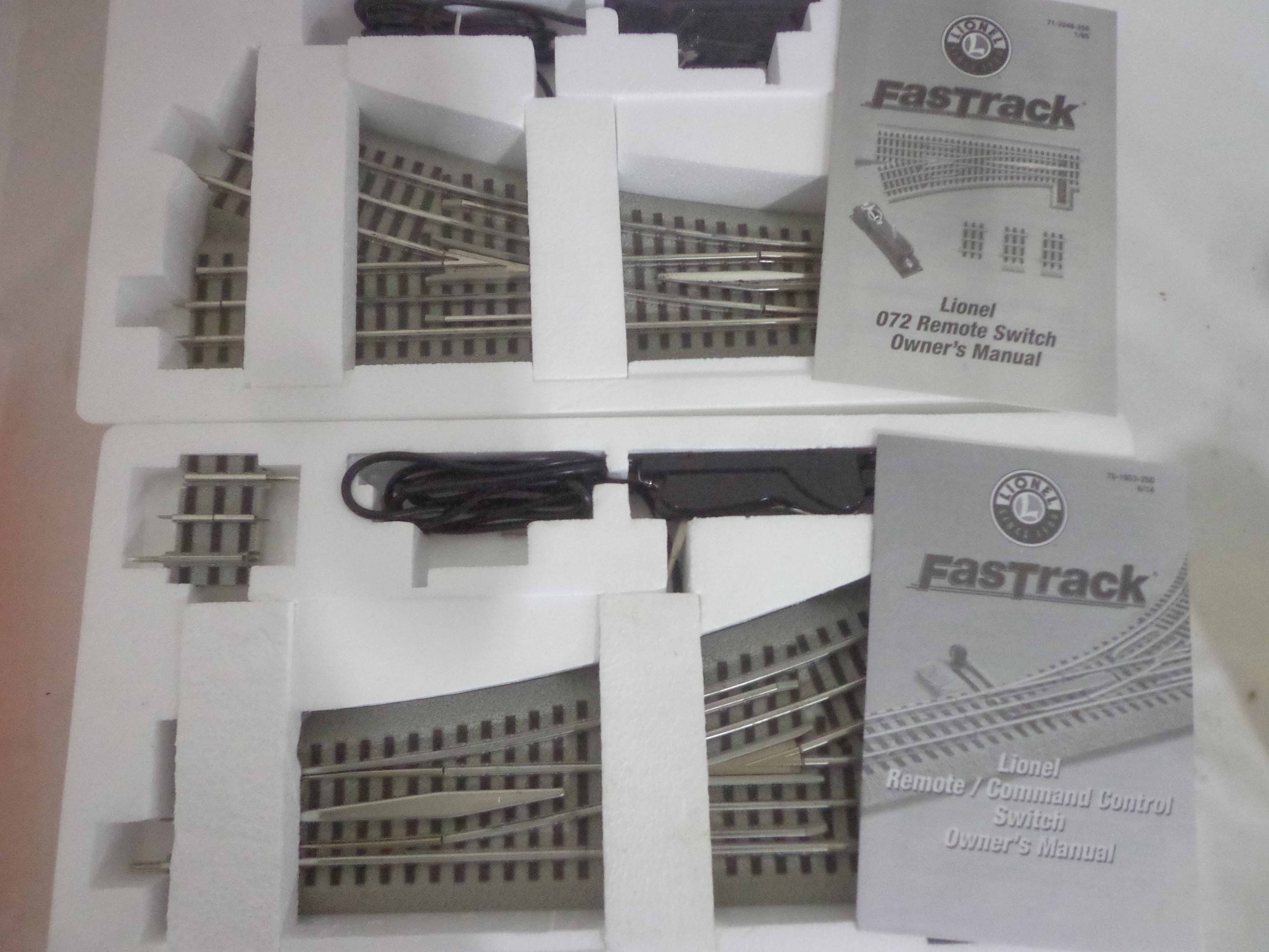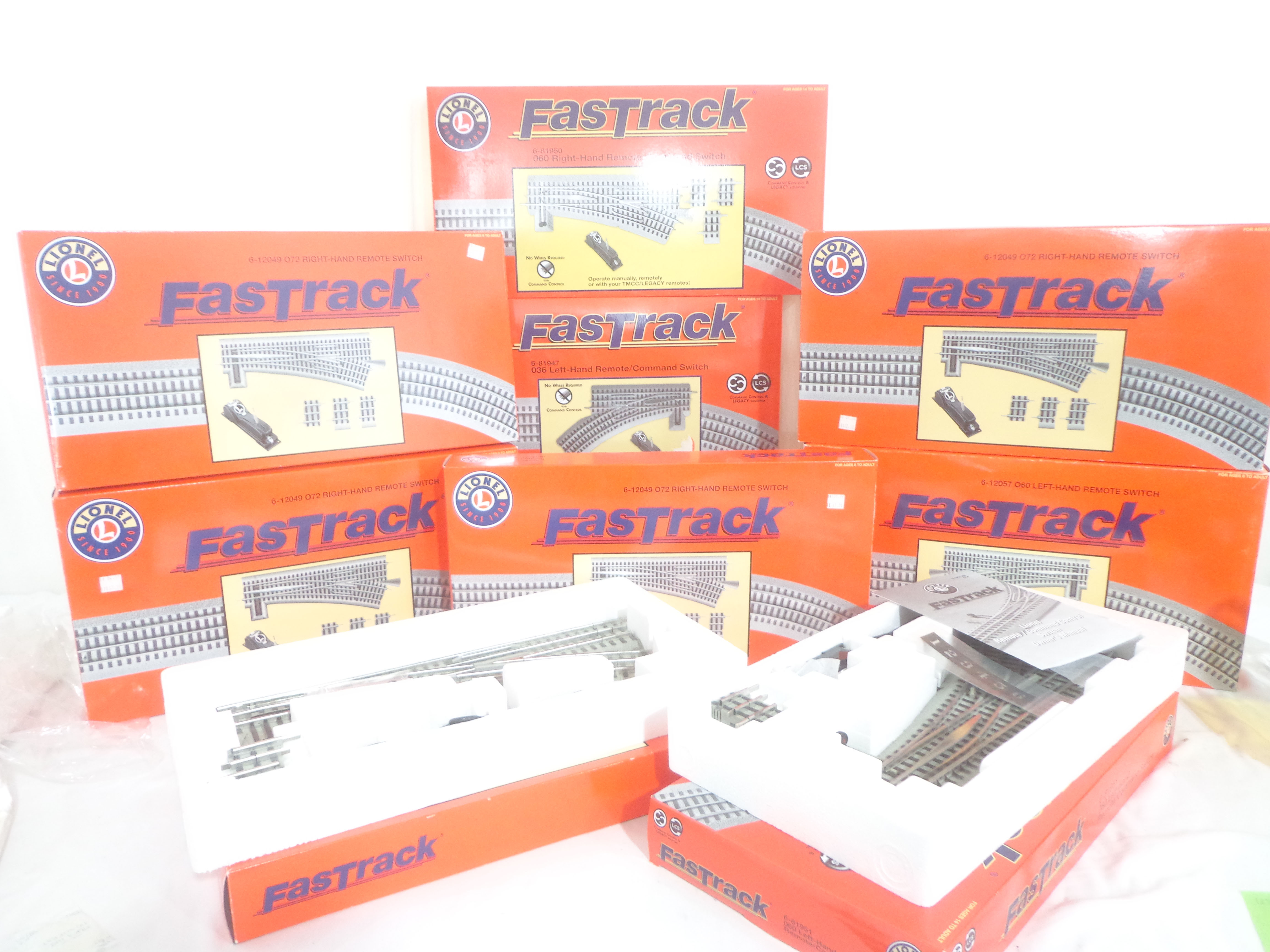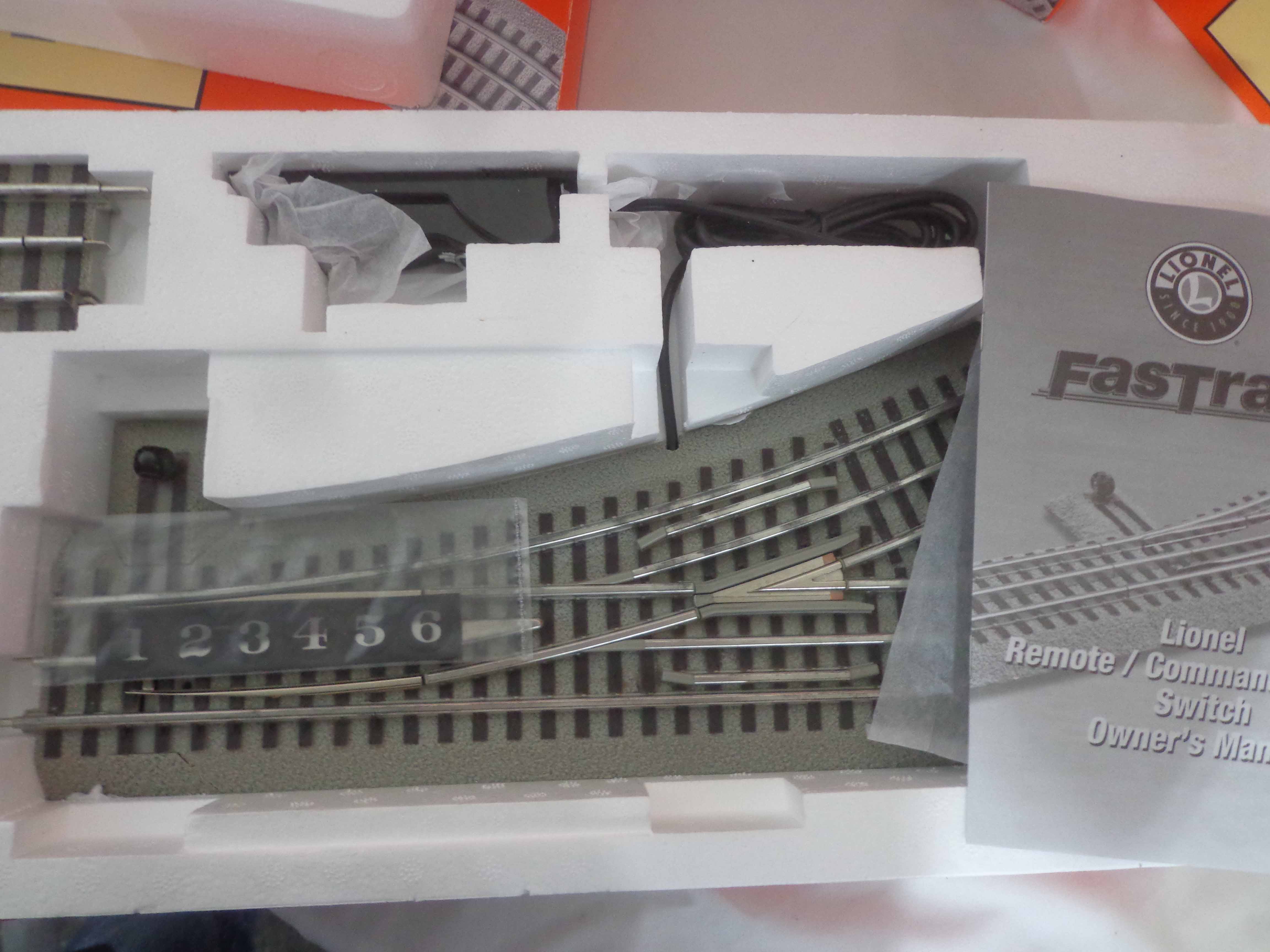This is the nine Assorted Fastrack Control Switches that Lionel made a few years ago. Our Opinion is that they are generally in Mint Condition. Original Boxes. All Original in our Opinion. Please add $50.00 for US-48 Shipping and Insurance (more west of the Mississippi).