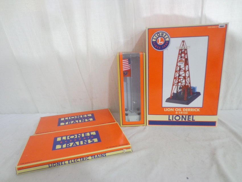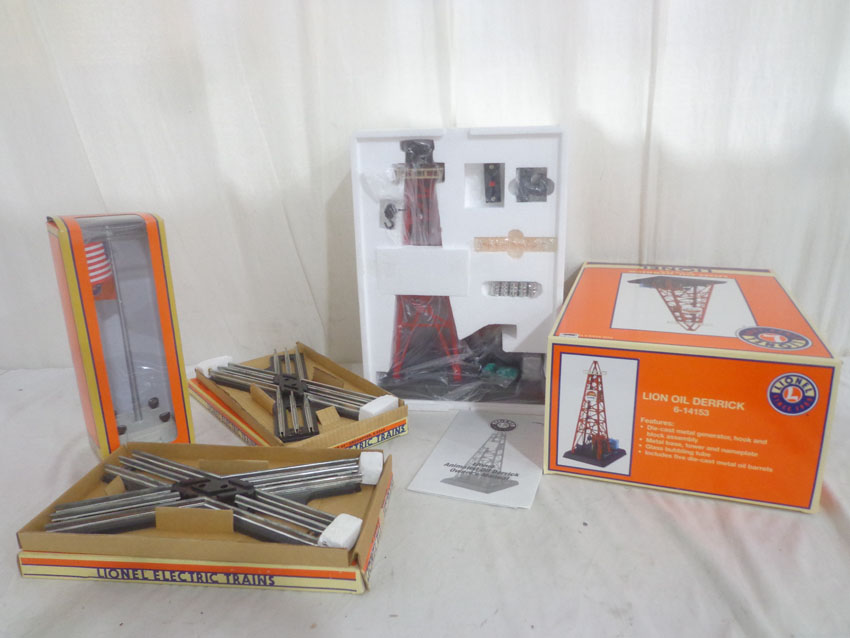 Mint Lionel #14153 Lion Oil Derrick, #16896 Flagpole with Lights, and 2 #5545 Crossover Tracks/OBs