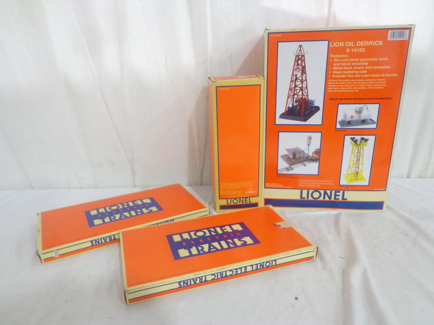 These are the #14153 Lion Oil Derrick, the #16896 Flagpole with Lights, and two #5545 Crossover Tracks that Lionel made a few years ago. Our Opinion is that they are generally in Mint Condition. Original Boxes. All Original in our Opinion. Please add $45.00 for US-48 Shipping and Insurance (more west of the Mississippi).