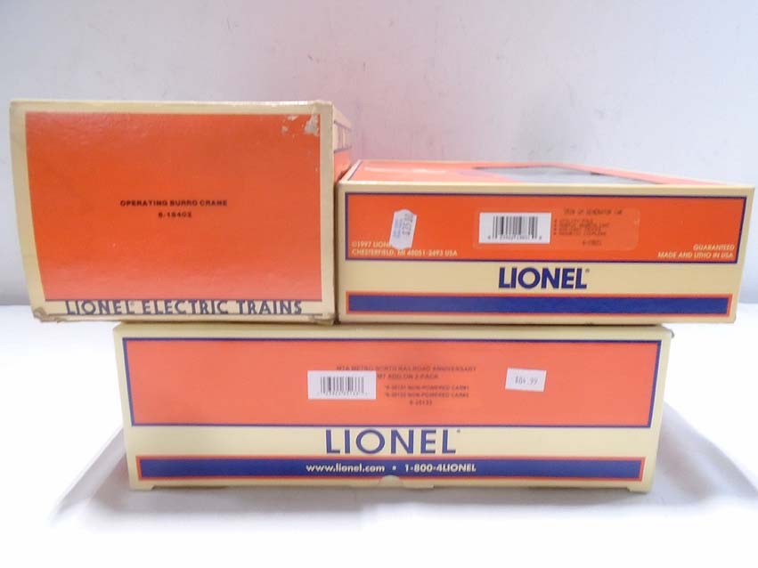 These are the #18402 Operating Burro Crane, the #35133 MTA Metro North RR M-7 Commuter Add-On 2-Pack, and the #19831 Operating GM Generator Car that Lionel made in the 1970s/80s. Our Opinion is that they are generally in Like New Condition. Original Boxes. All Original in our Opinion. Please add $40.00 for US-48 Shipping and Insurance (more west of the Mississippi). |