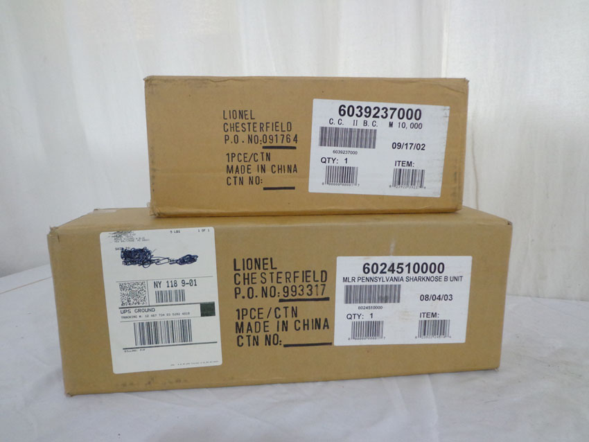 These are the #24510 Pennsylvania Sharknose B Unit, the #39215 Niagara Century Club Box Car, and the #39237 Union Pacific Club II Box Car that Lionel made a few years ago. Our Opinion is that they are generally in MintCondition. Original Boxes. All Original in our Opinion. Please add $45.00 for US-48 Shipping and Insurance (more west of the Mississippi). |