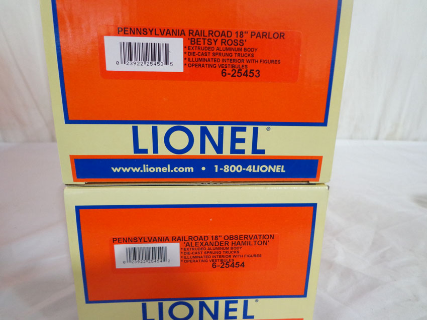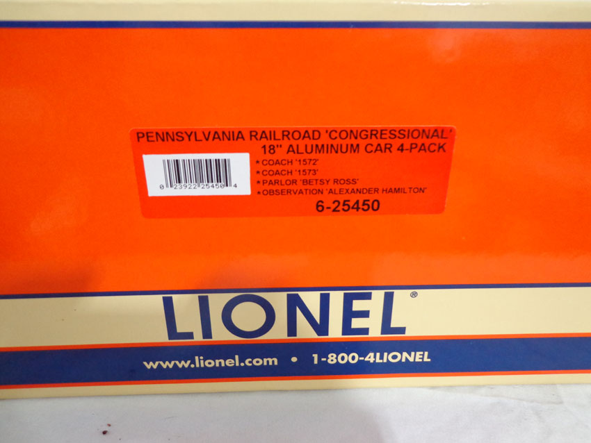 This is the #25450 Pennsylvania Railroad Congressional 18" Aluminum Passenger Car 4 Pack that Lionel made a few years ago. Our Opinion is that the Set is generally in Like New Plus Condition. Original Box. All Original in our Opinion. Please add $45.00 for US-48 Shipping and Insurance (more west of the Mississippi). |