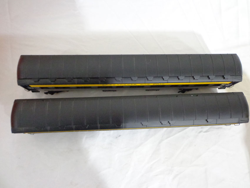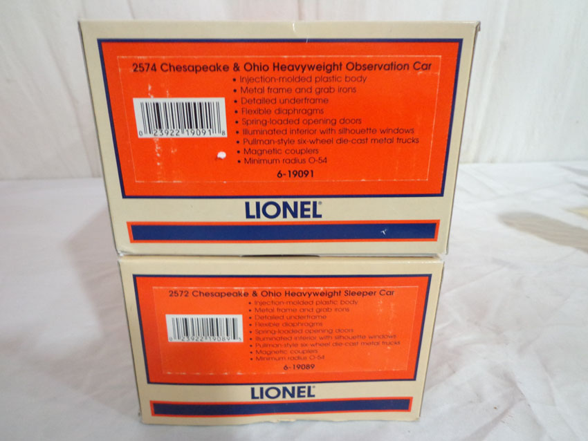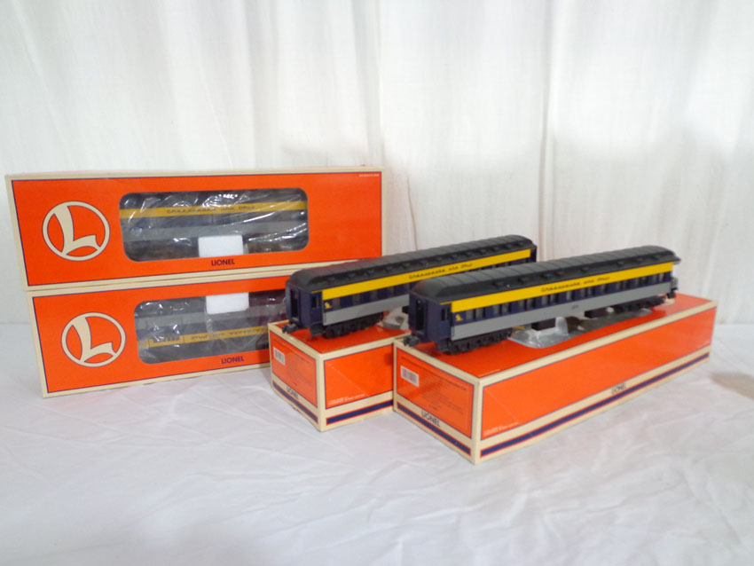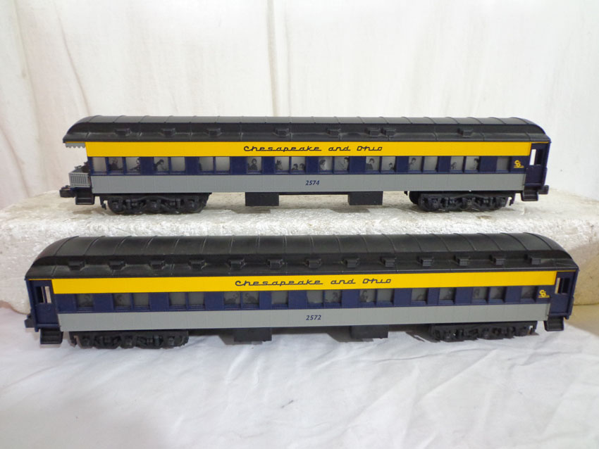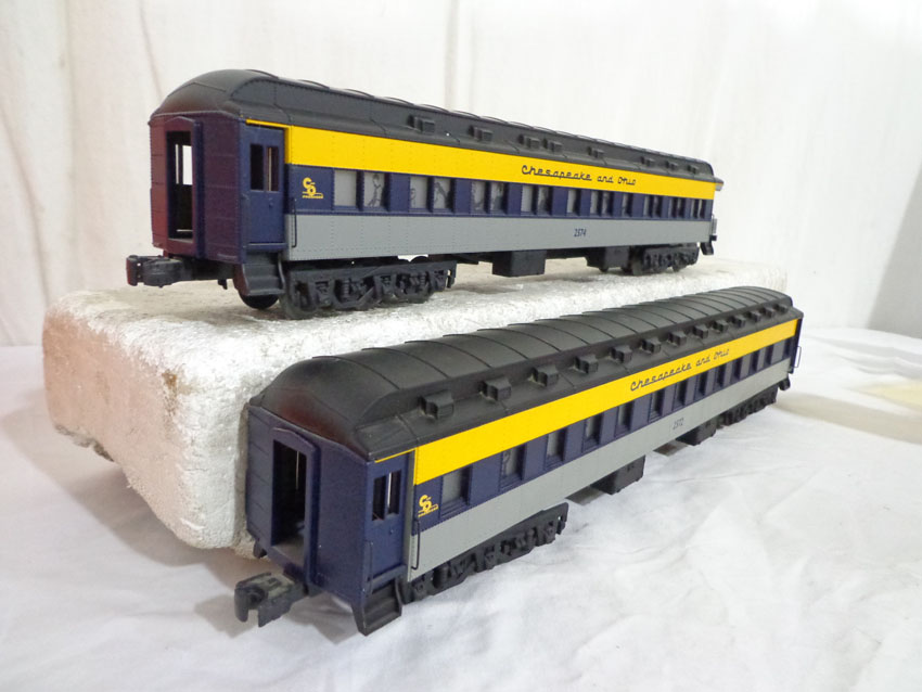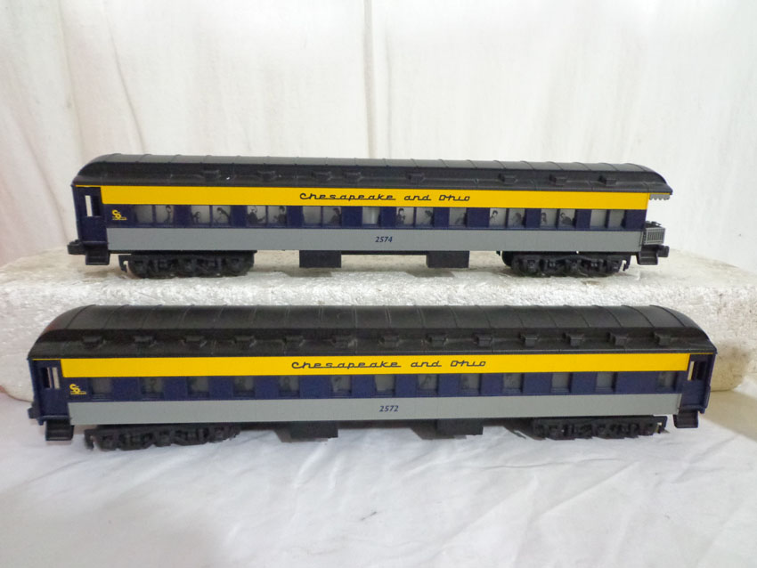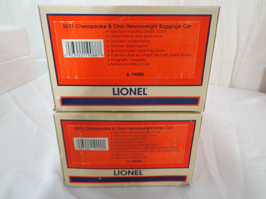 These are the #19087 C & O Heavyweight Scale Madison Passenger Set that Lionel made a few years ago. Included are the #19088 Baggage Car, the #19089 Sleeper Car, the #19090 Diner Car, and the #19091 Observation Car. Our Opinion is that they are generally in Like New Condition. Original Boxes. All Original in our Opinion. Please add $50.00 for US-48 Shipping and Insurance (more west of the Mississippi). |