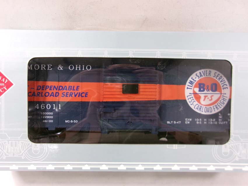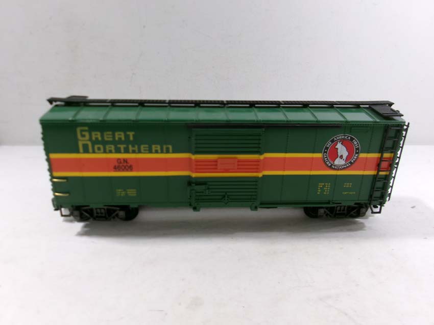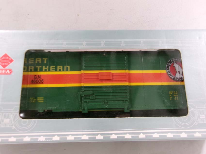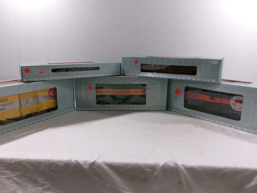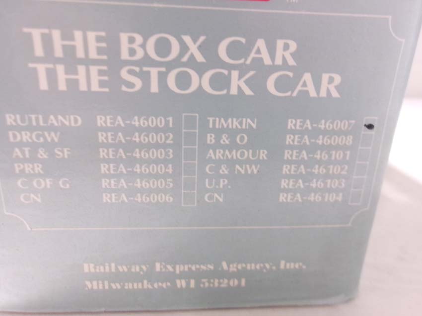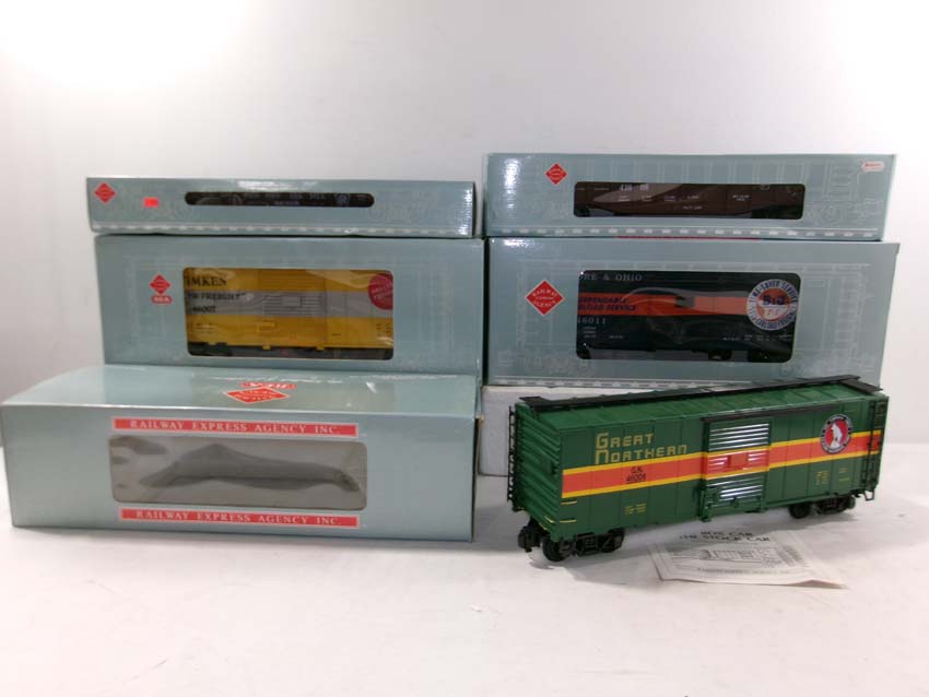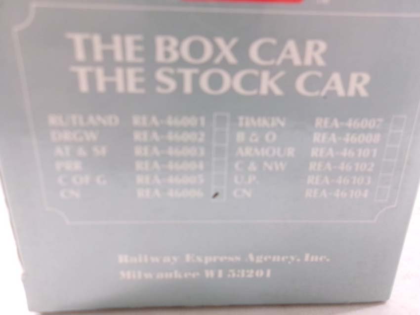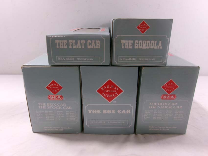 These are the REA G Gauge #REA-46305 PRR Flat Car, #REA-41008 PRR Gondola, #REA-46007 Timken Box Car, #REA-46006 GN Box Car and #REA-46011 B&O Box Car. Original Boxes. Examine closely; what is pictured is what you will receive. Please add $50.00 for US-48 Shipping and Insurance (more west of the Mississippi) |