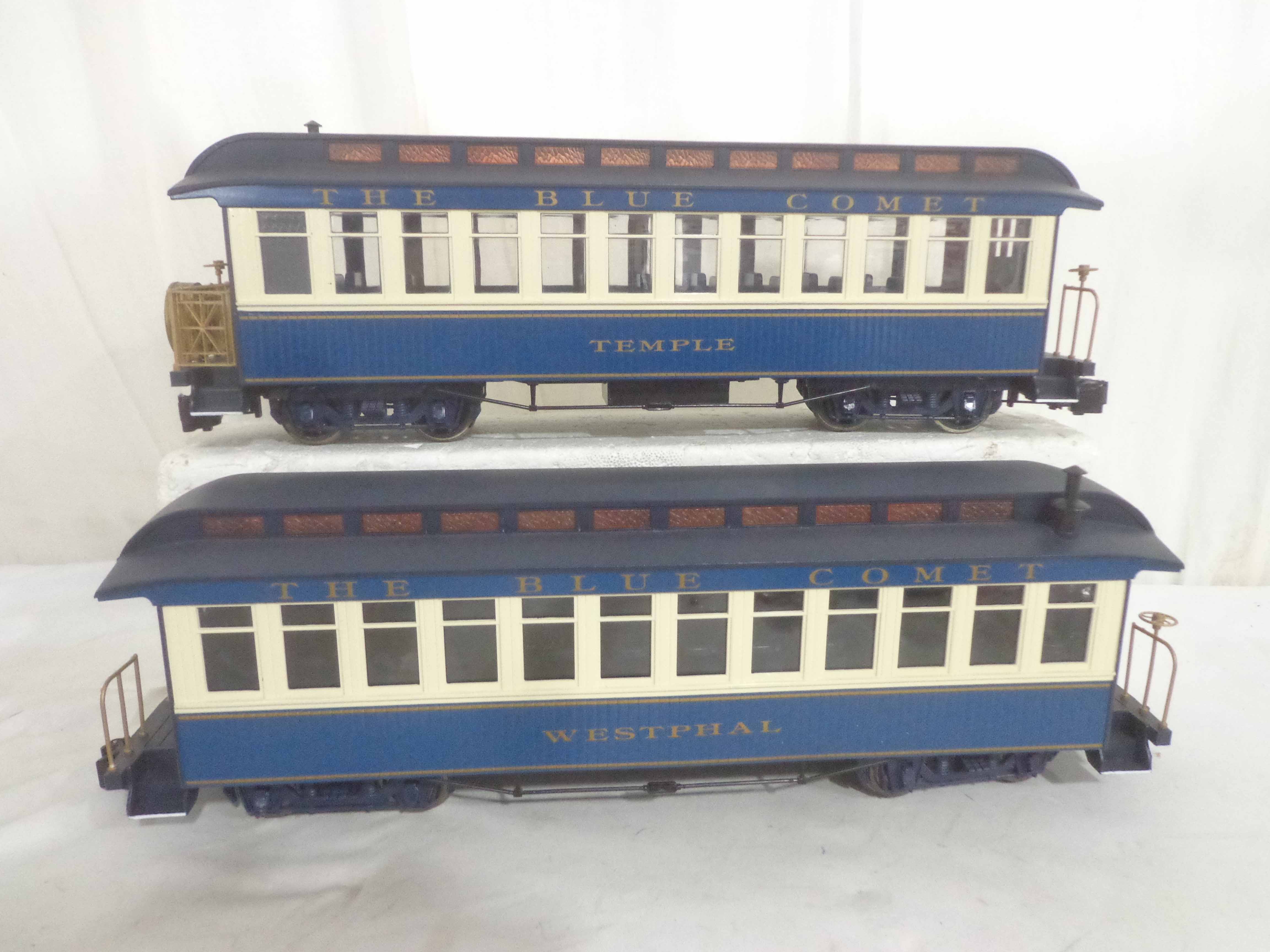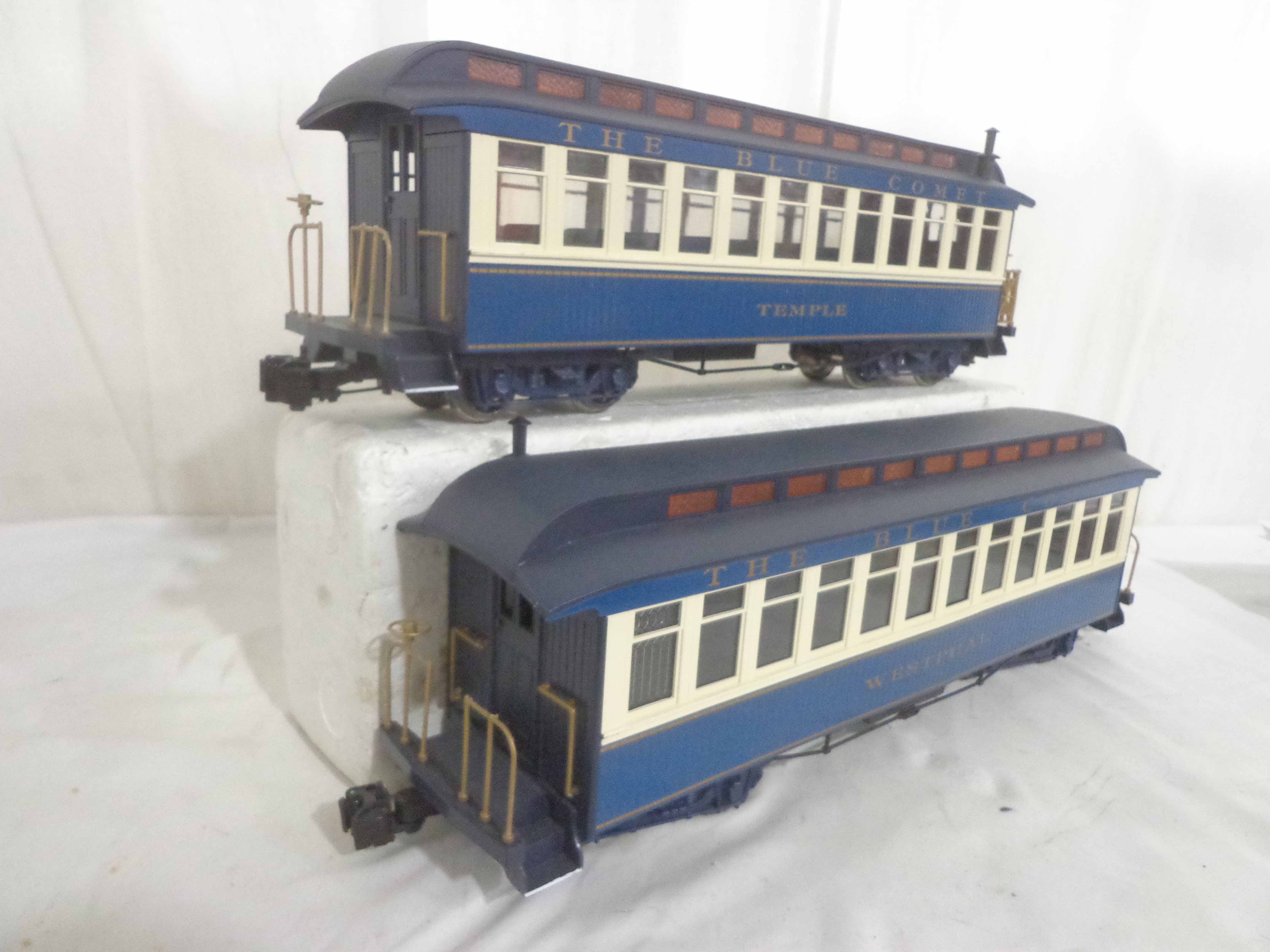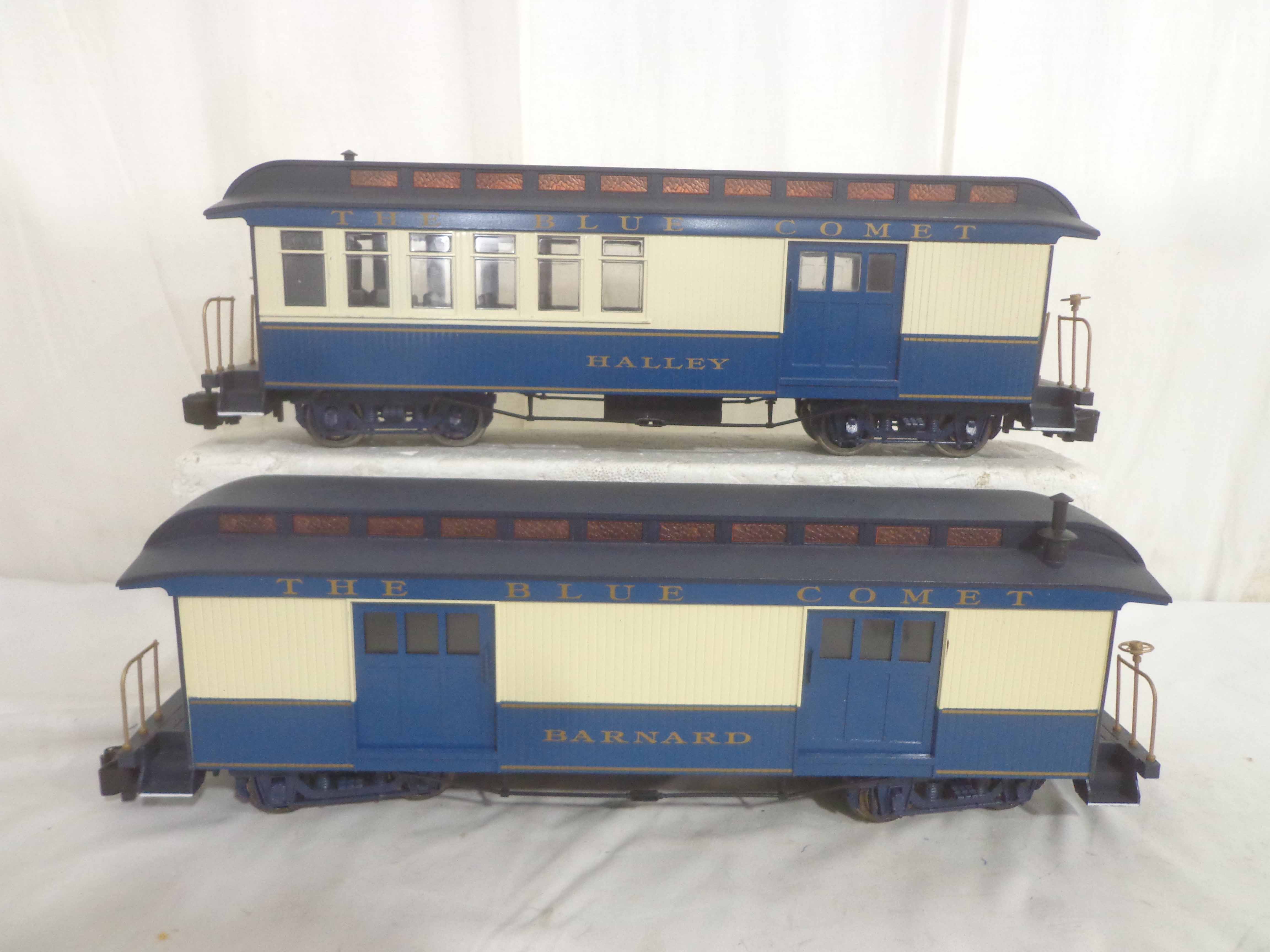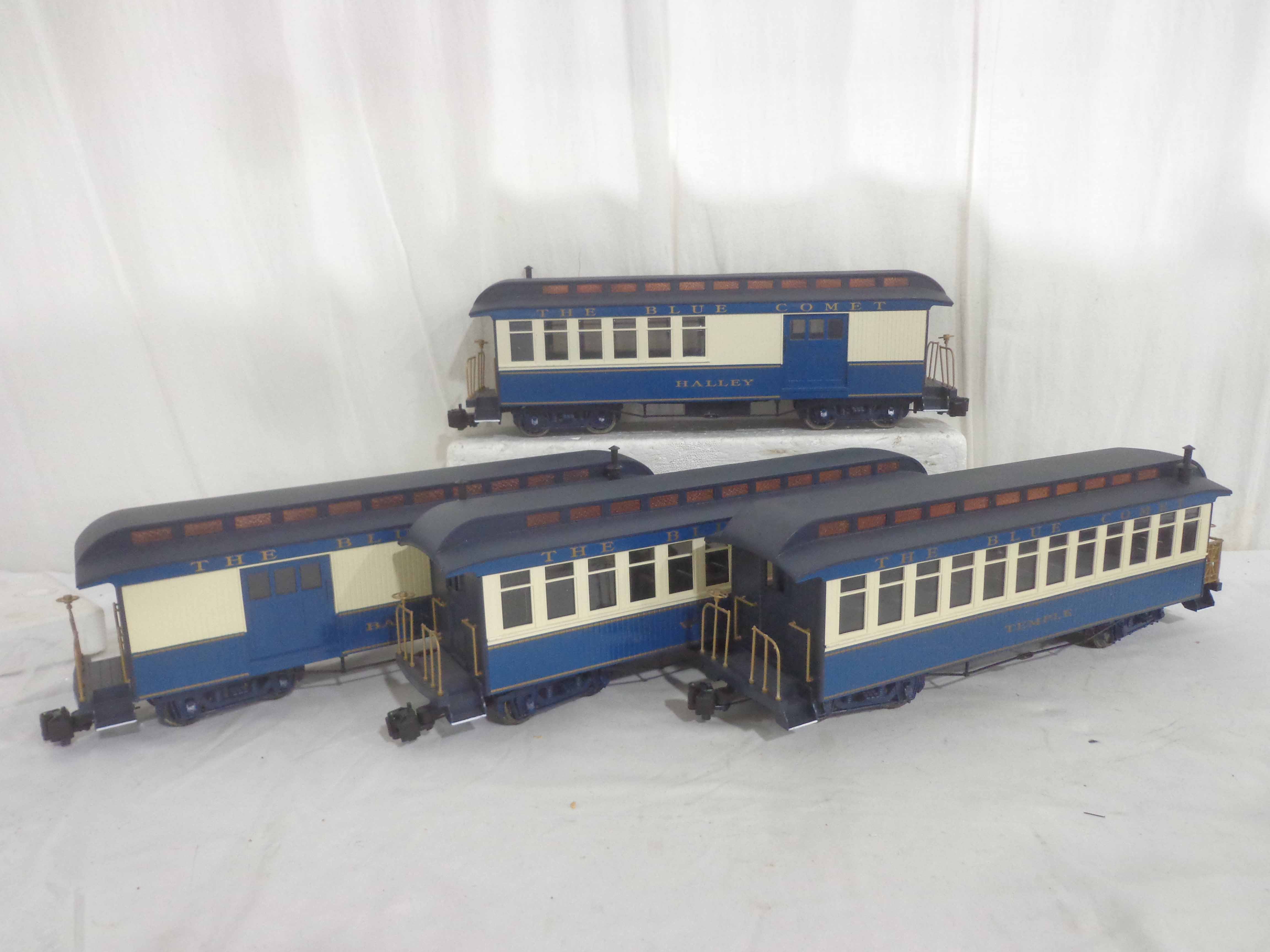 These are four Bachmann G Gauge Blue Comet Passenger Cars (no #s). Examine closely; what is pictured is what you will receive. Original Boxes. Please add $50.00 for US-48 Shipping and Insurance (more west of the Mississippi).