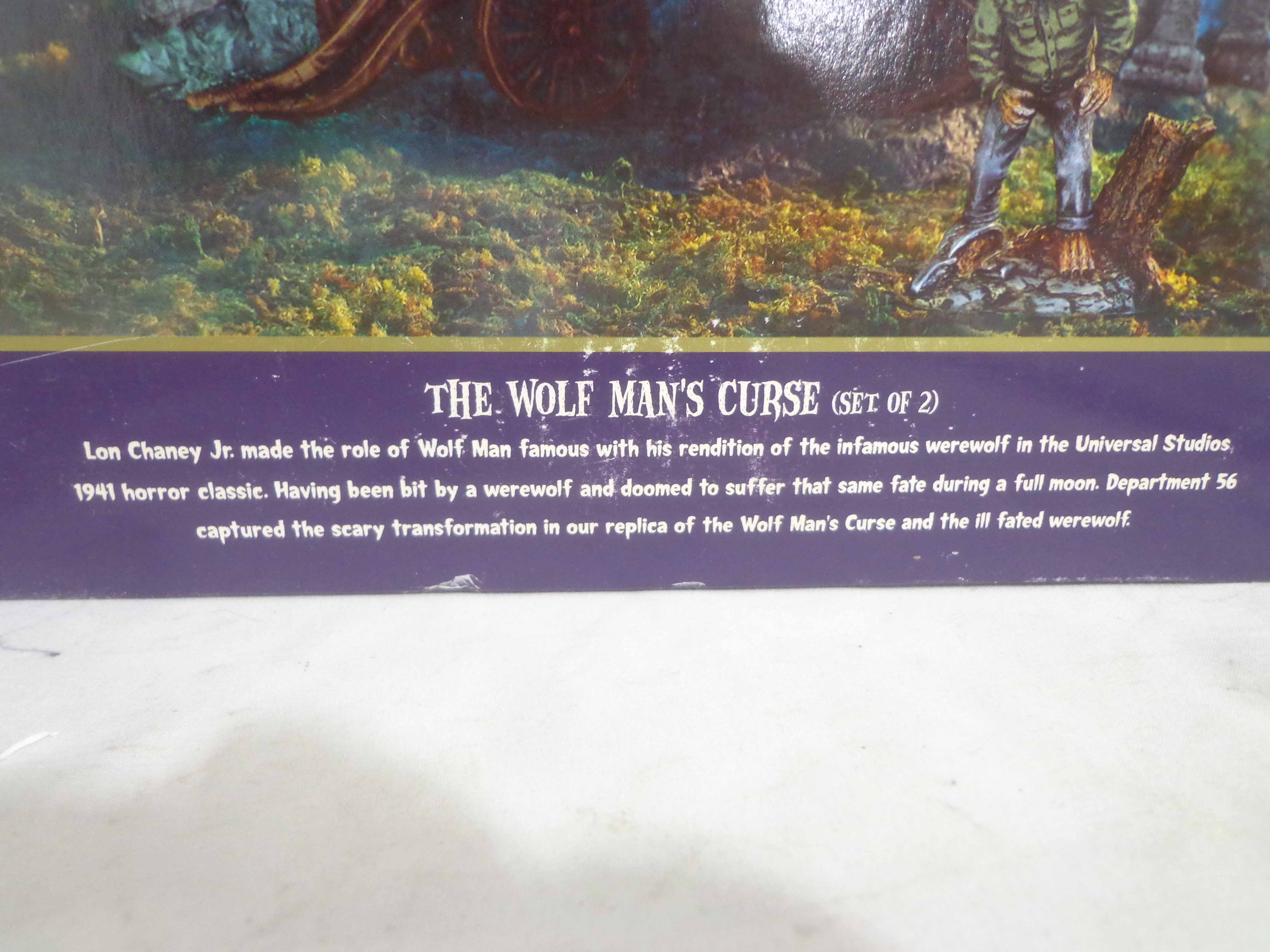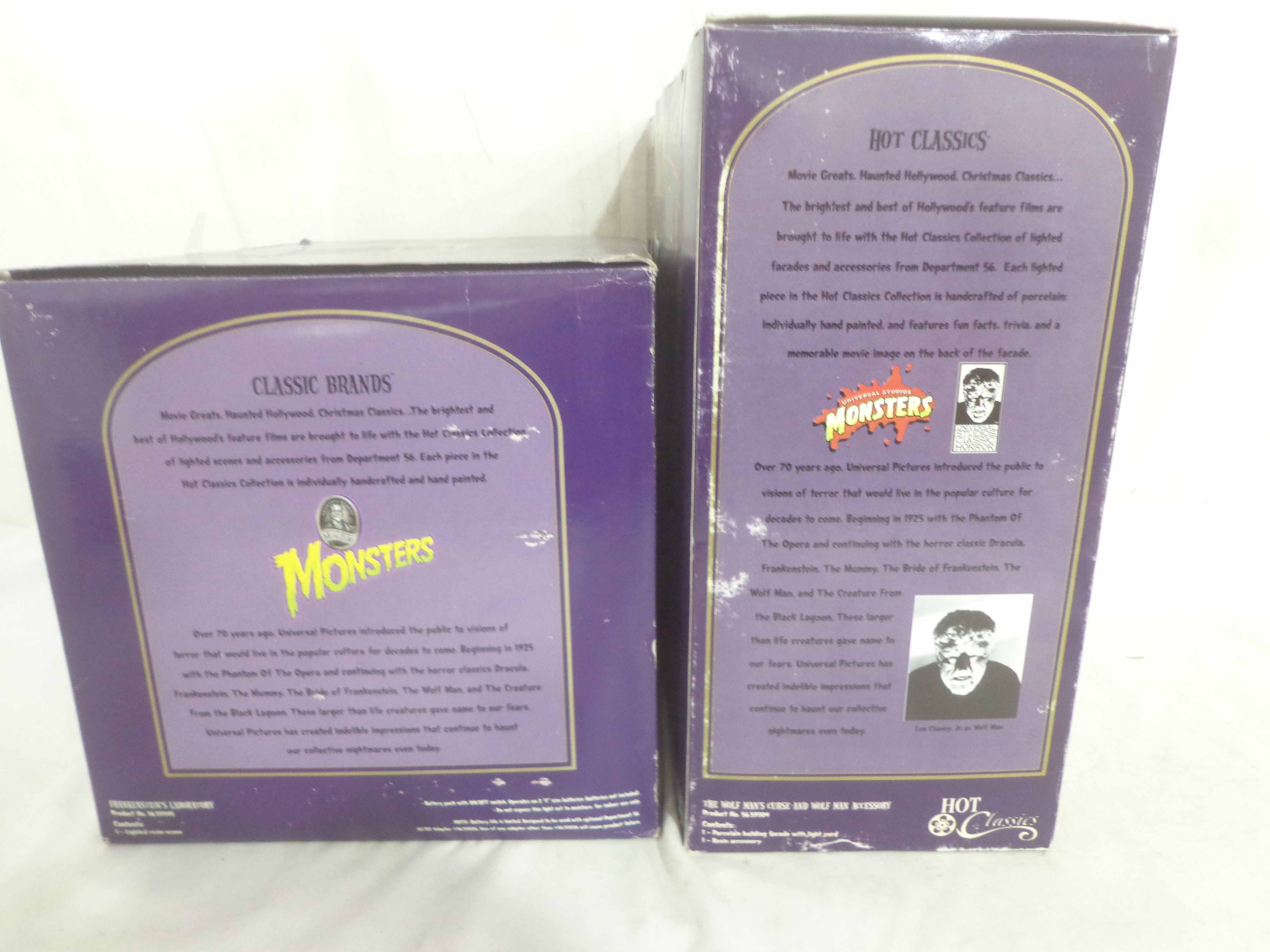 These are the Dept 56 Monsters #56.59345 Frankenstein Laboratory and #56.59304 Wolfman Curse. Original Boxes. Examine closely; what is pictured is what you will receive. Please add $40.00 for US-48 Shipping and Insurance (more west of the Mississippi). |