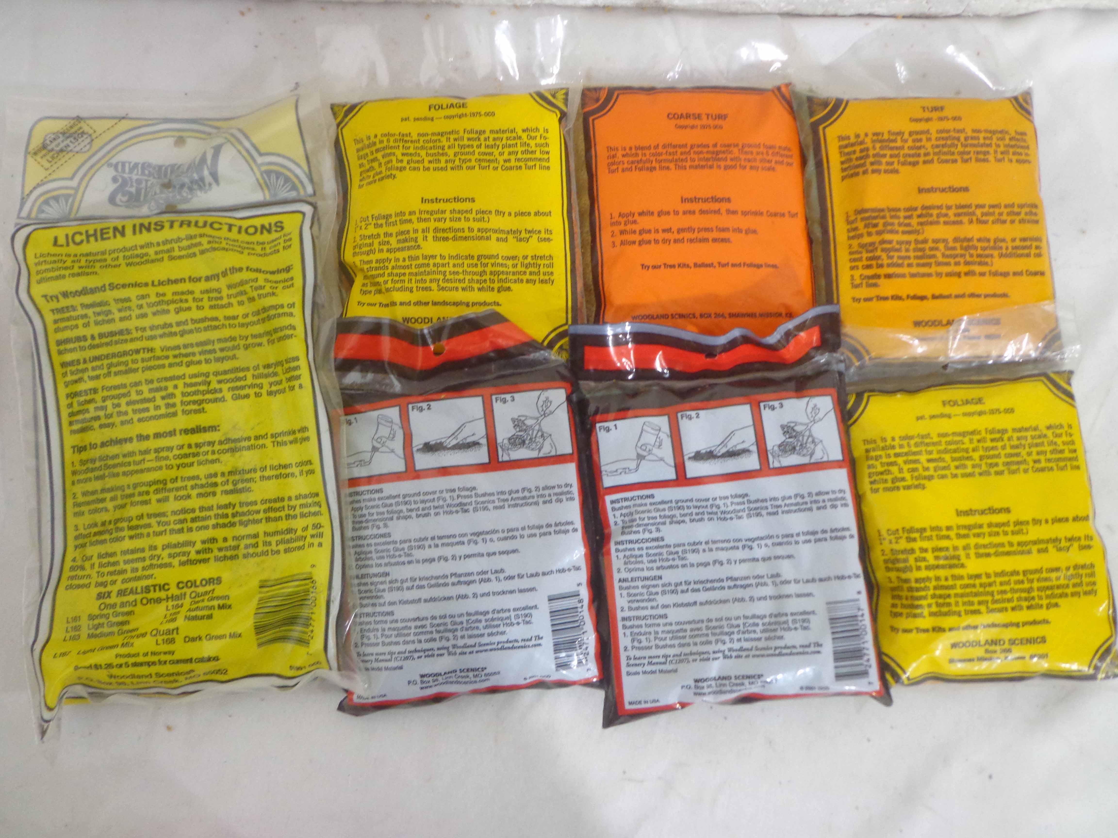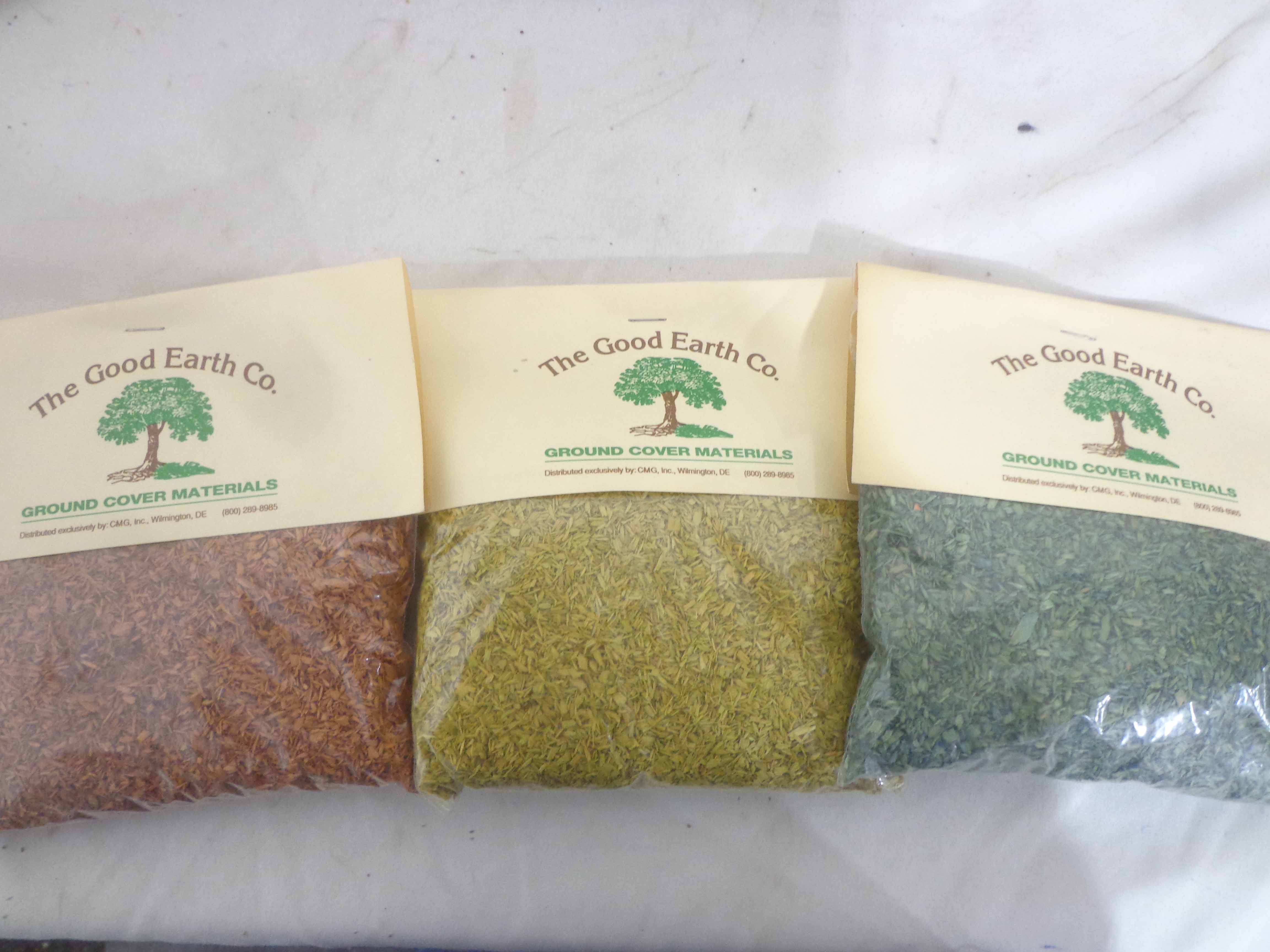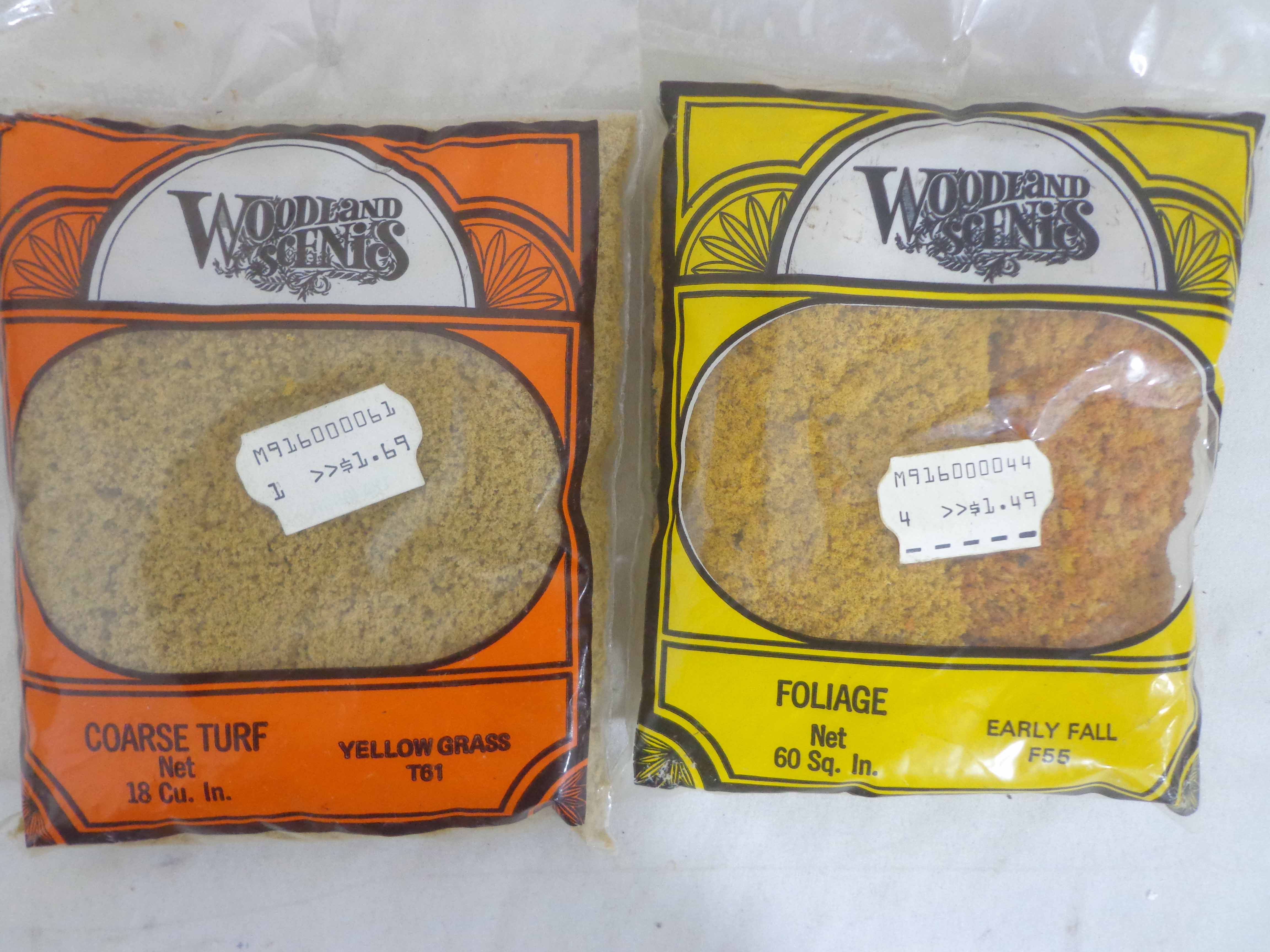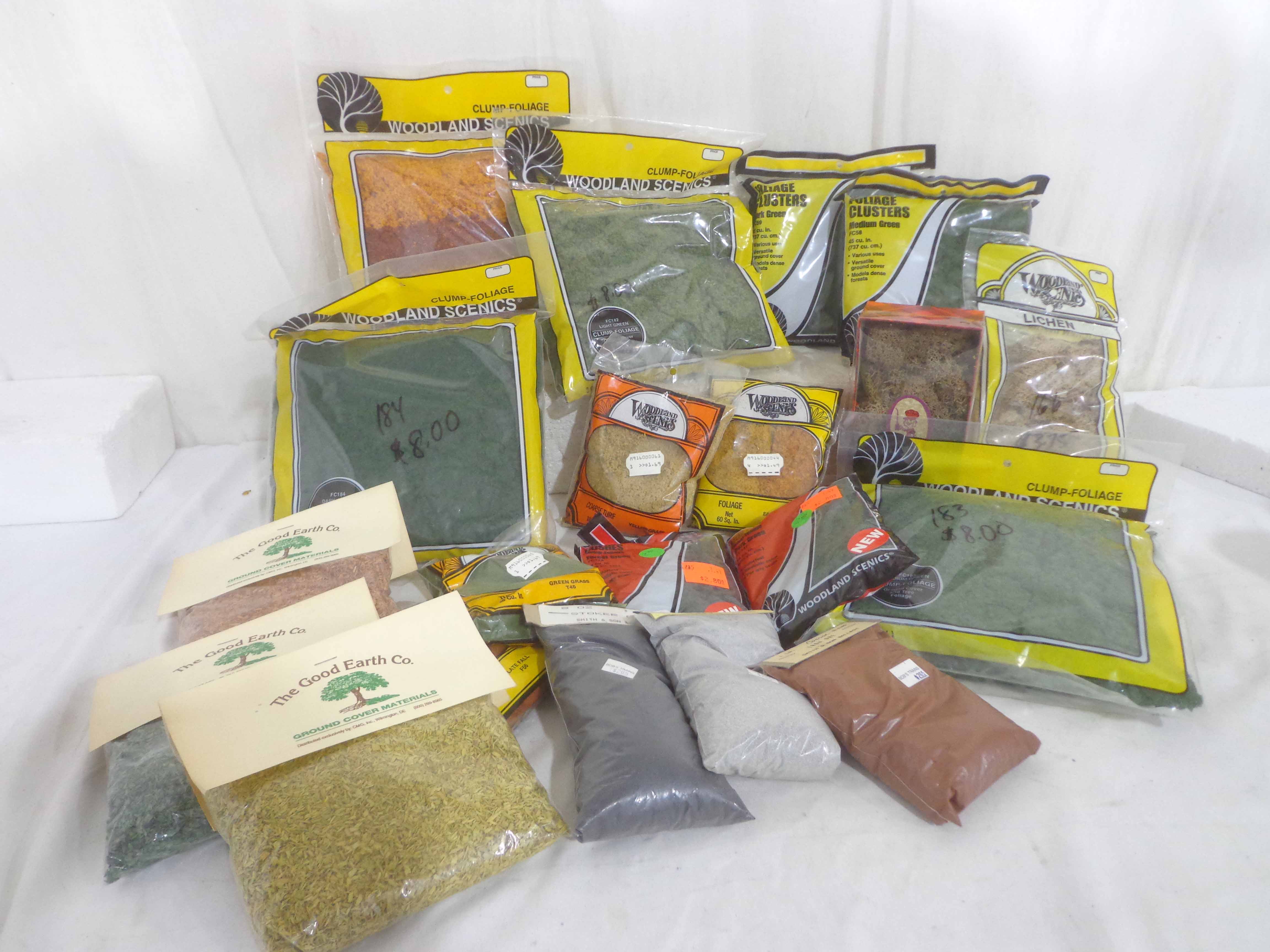 These are twenty-one Assorted Woodland Scenes/Good Earth Co. Landscaping Materials. Plastic Bags. Please look at all the pictures; what is pictured is what you will receive. Original Packages. Please add $45.00 for US-48 Shipping and Insurance (more west of the Mississippi).