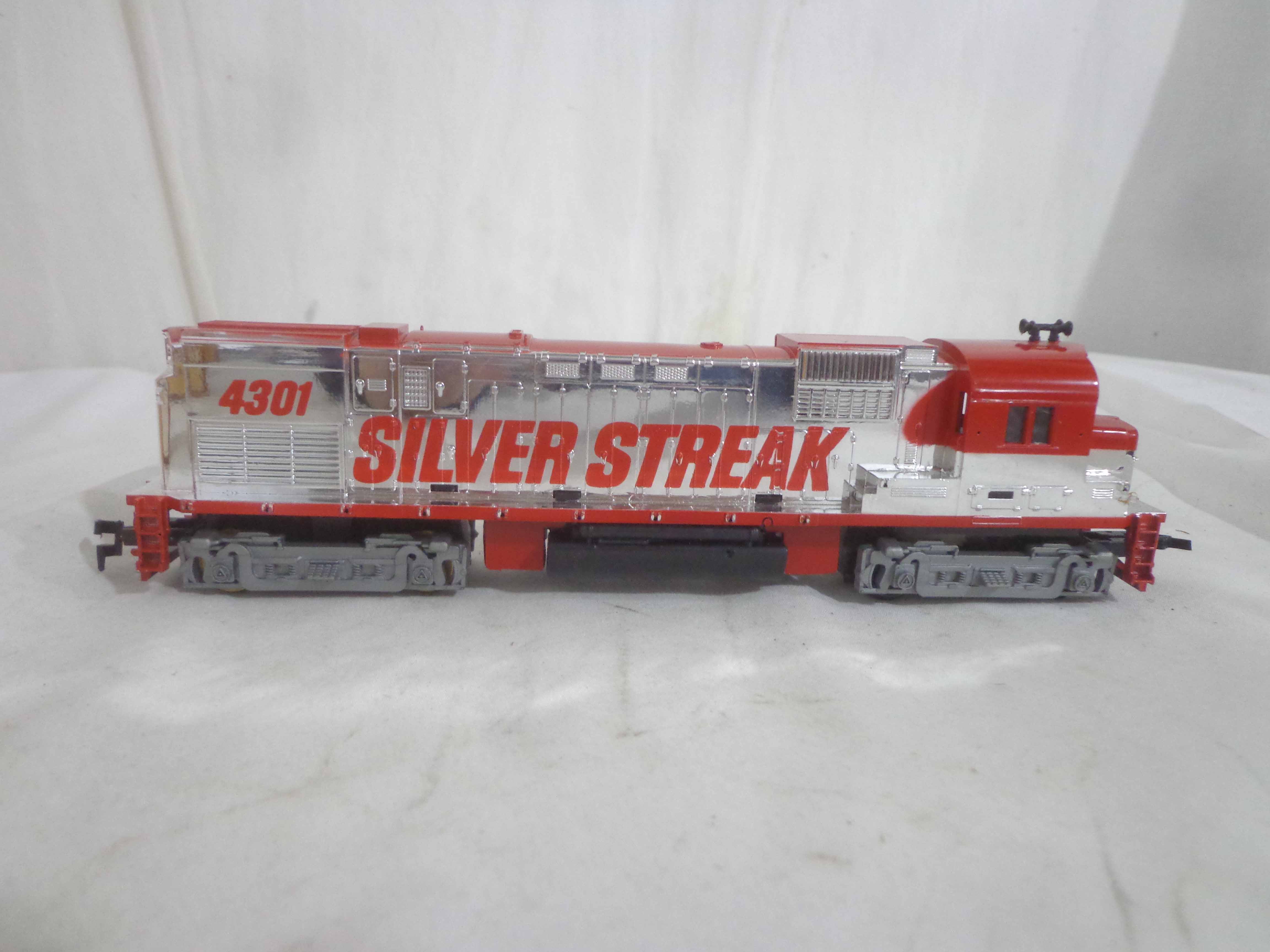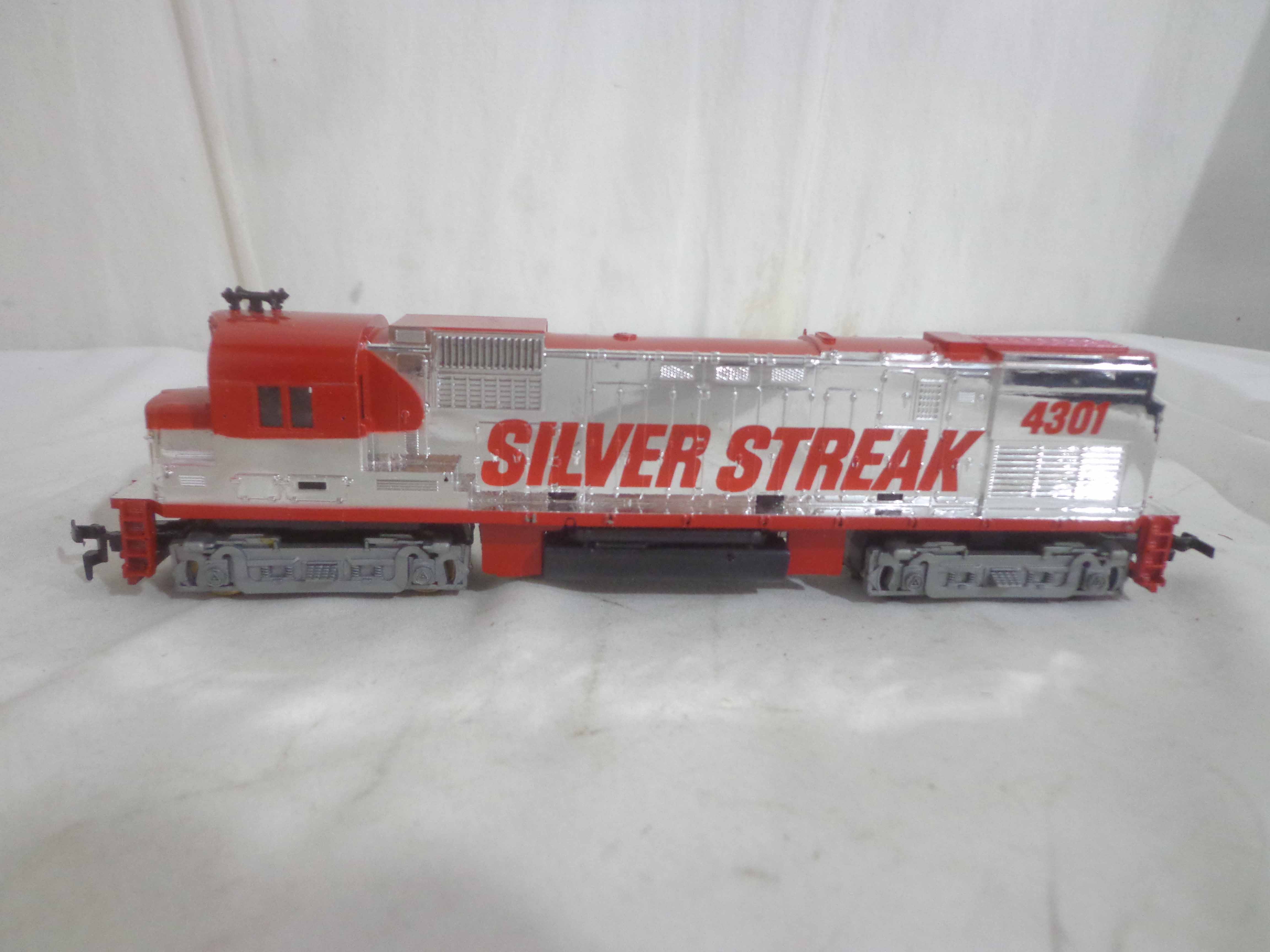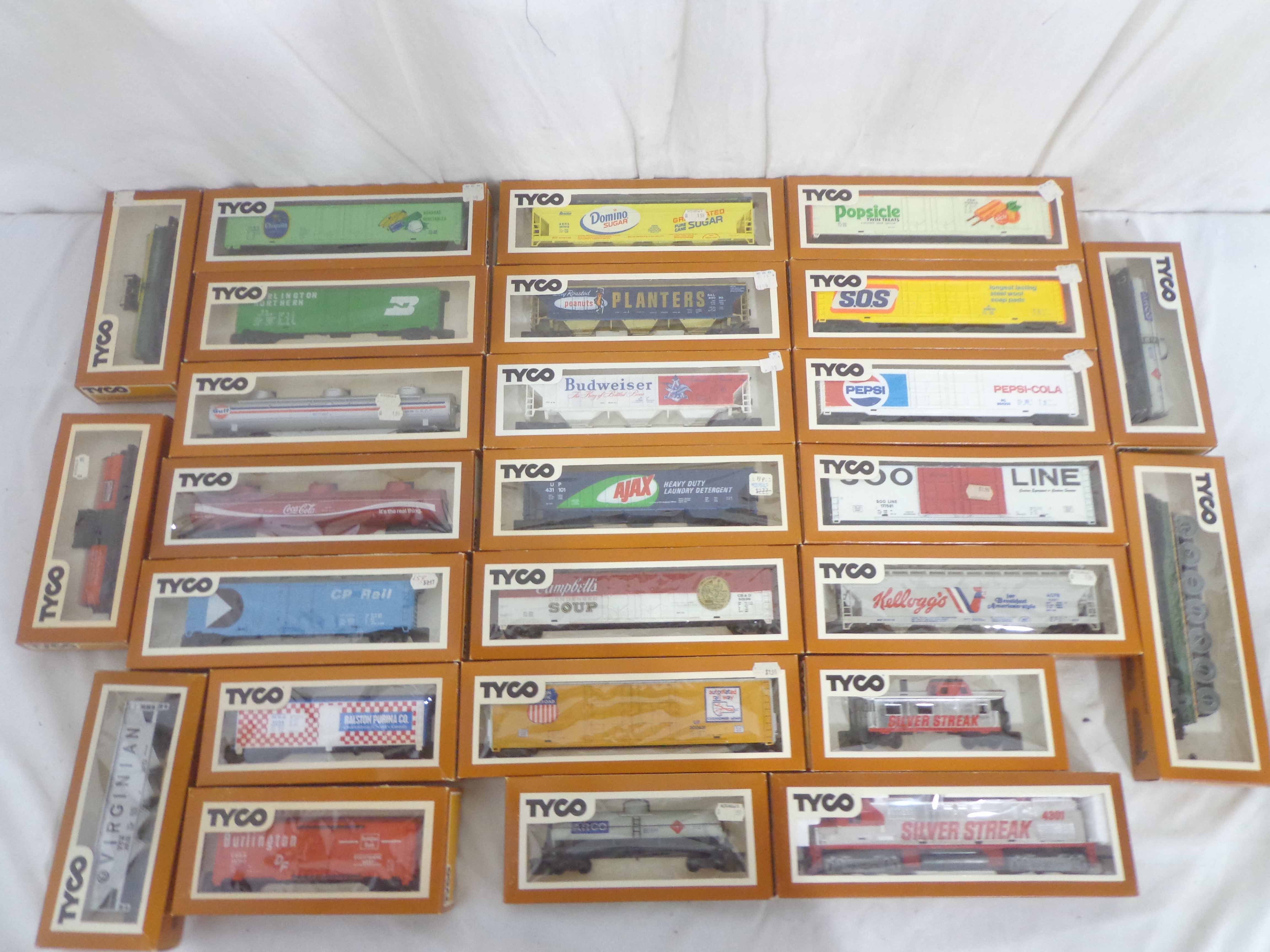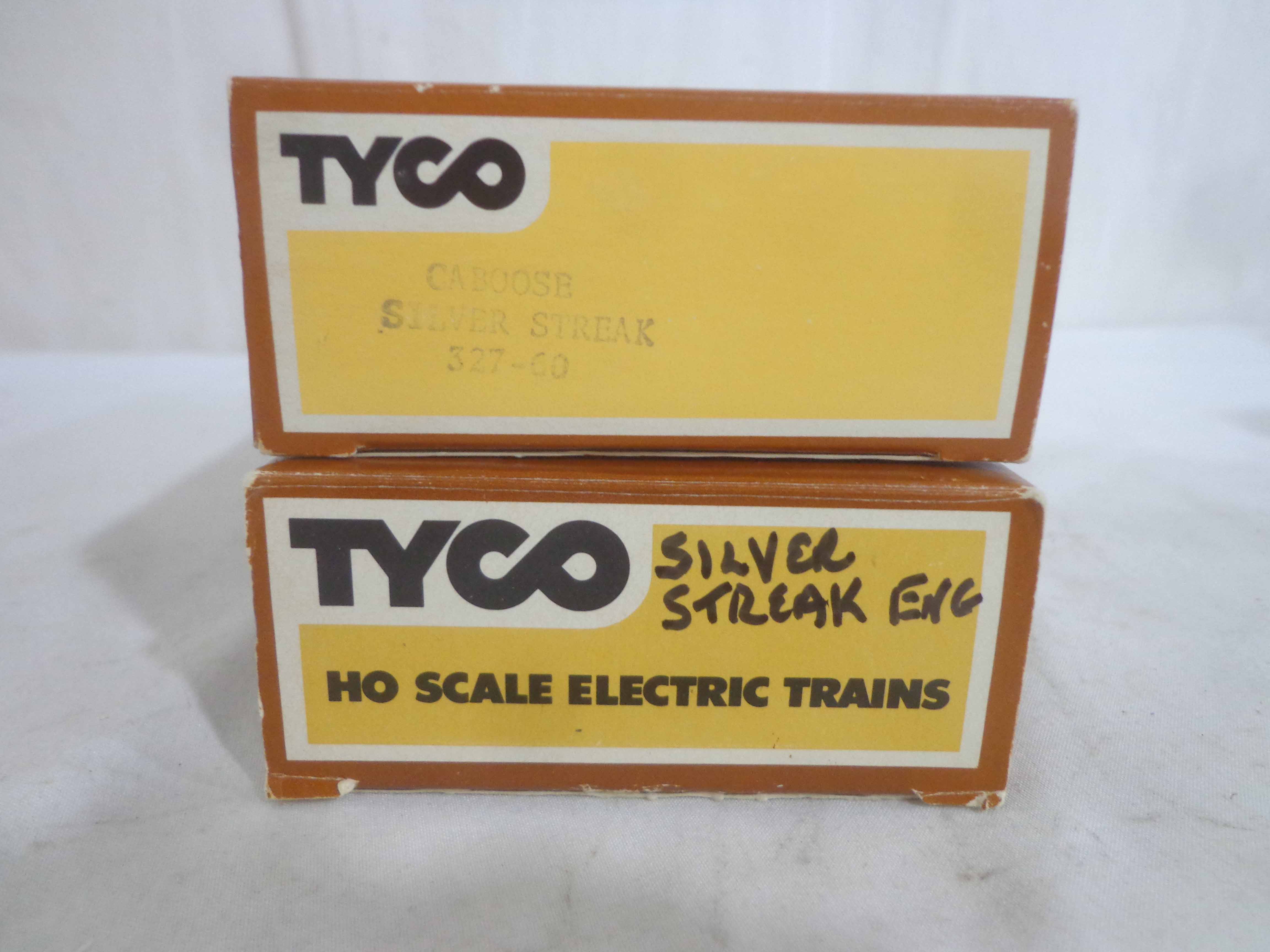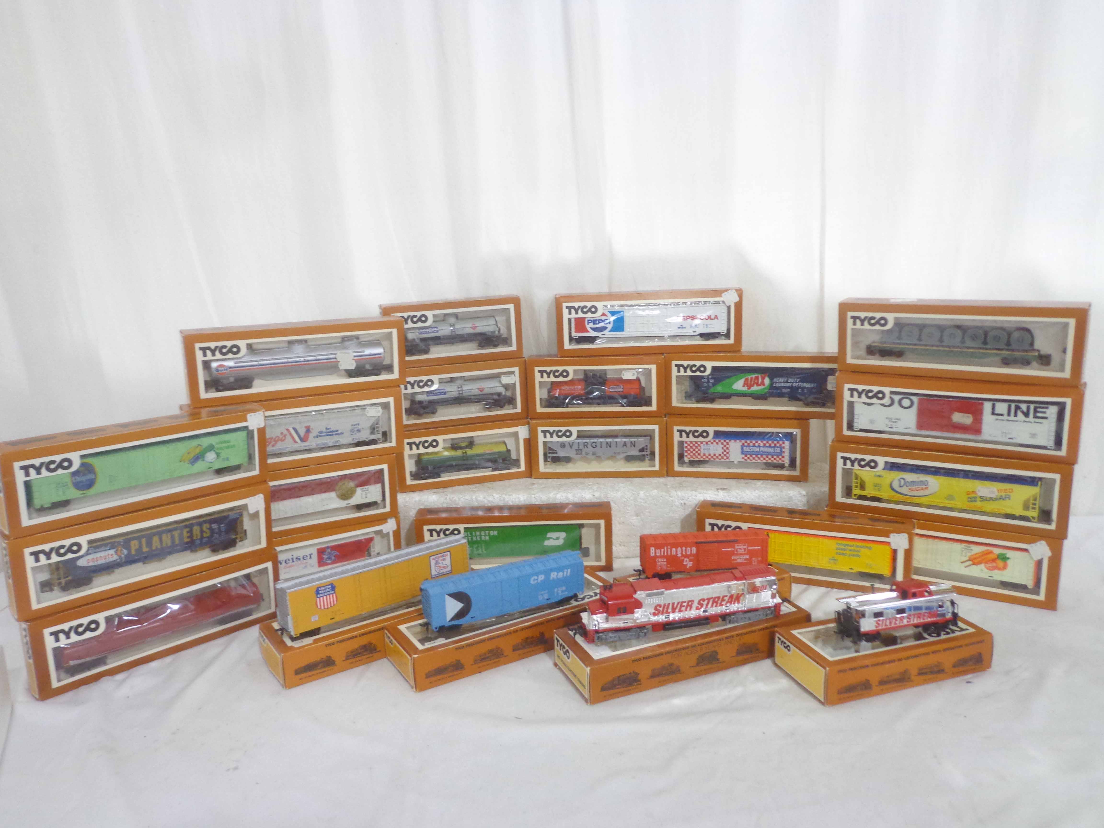 These are the Tyco HO Gauge #4301 Silver Streak Engine and twenty-five Assorted Freight Cars from the 1970s. Original Boxes. Examine closely; what is pictured is what you will receive. Please add $45.00 for US-48 Shipping and Insurance (more west of the Mississippi).