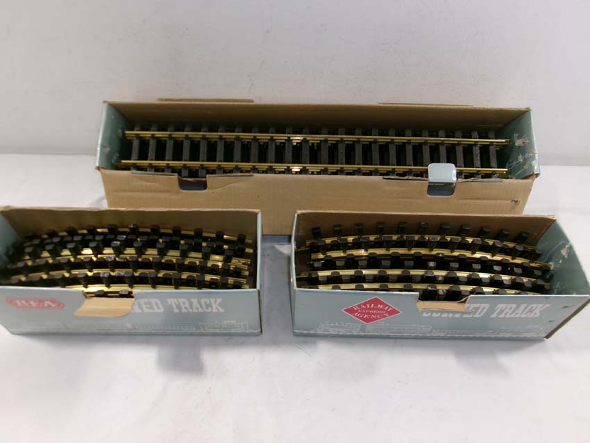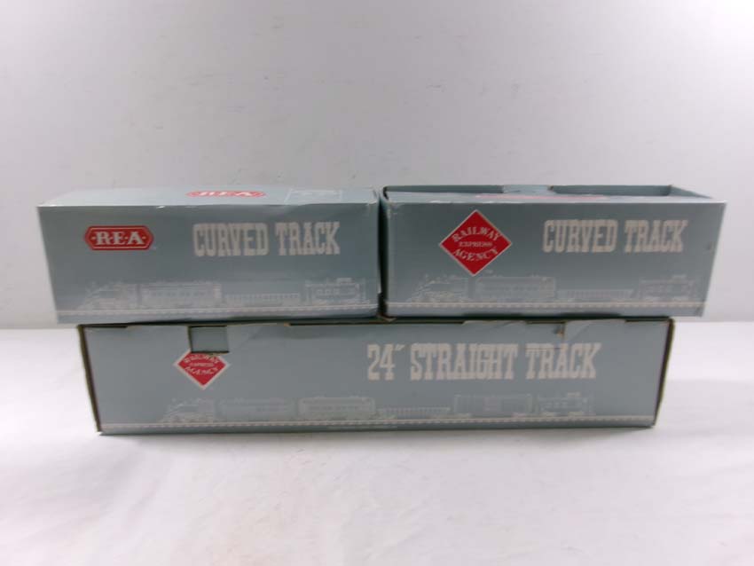These are two #REA-11100 Boxes of (12) Curved Track (both missing three sections) and #REA-11060 Box of (12) 24" Straight Track (missing three sections) that REA made in G Gauge in the past. Original Boxes. Examine closely; what is pictured is what you will receive. Please add $40.00 for US-48 Shipping and Insurance (more west of the Mississippi).