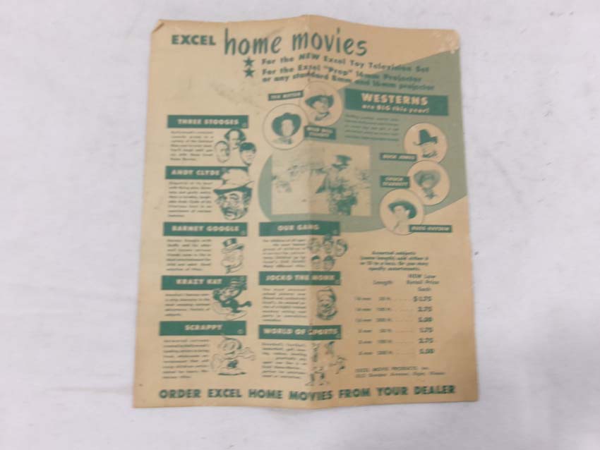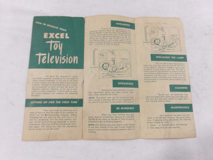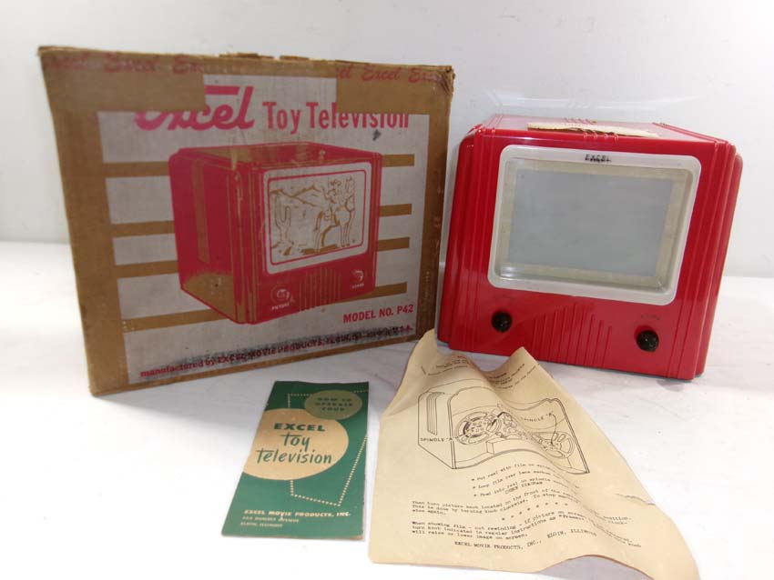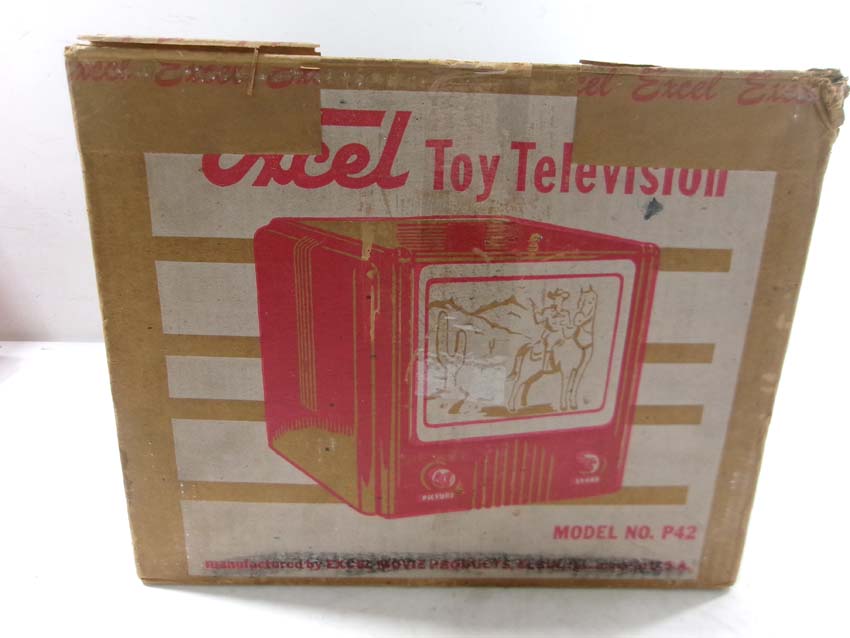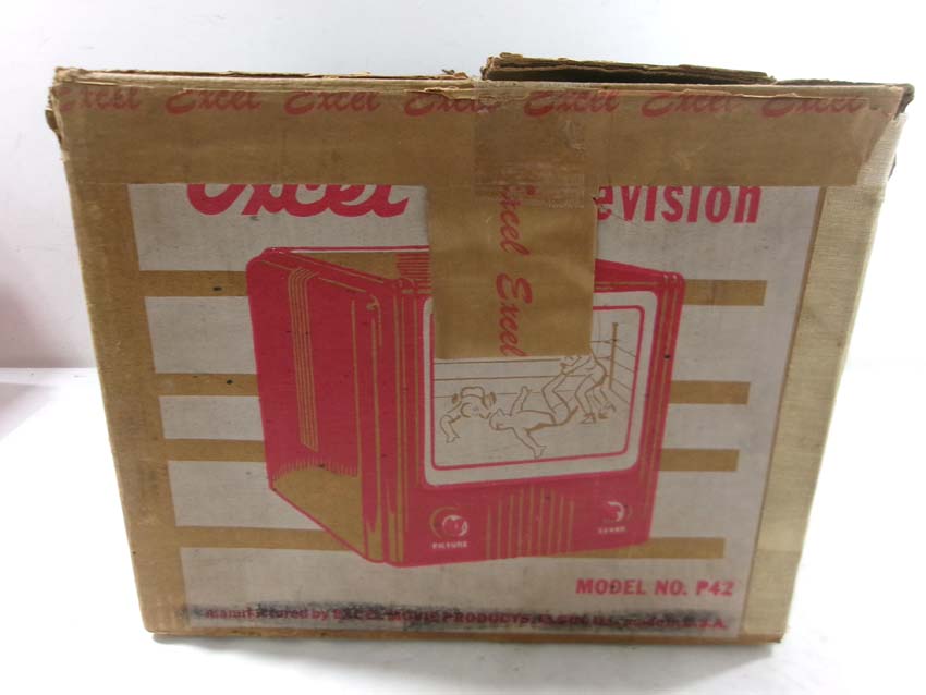 This is the Excel #P42 Toy Television from the 1960s. Original Box/two inserts. Examine closely; what is pictured is what you will receive. Please add $35.00 for US-48 Shipping and Insurance (more west of the Mississippi). |