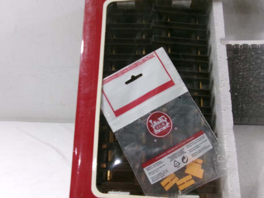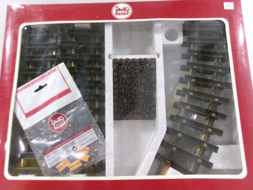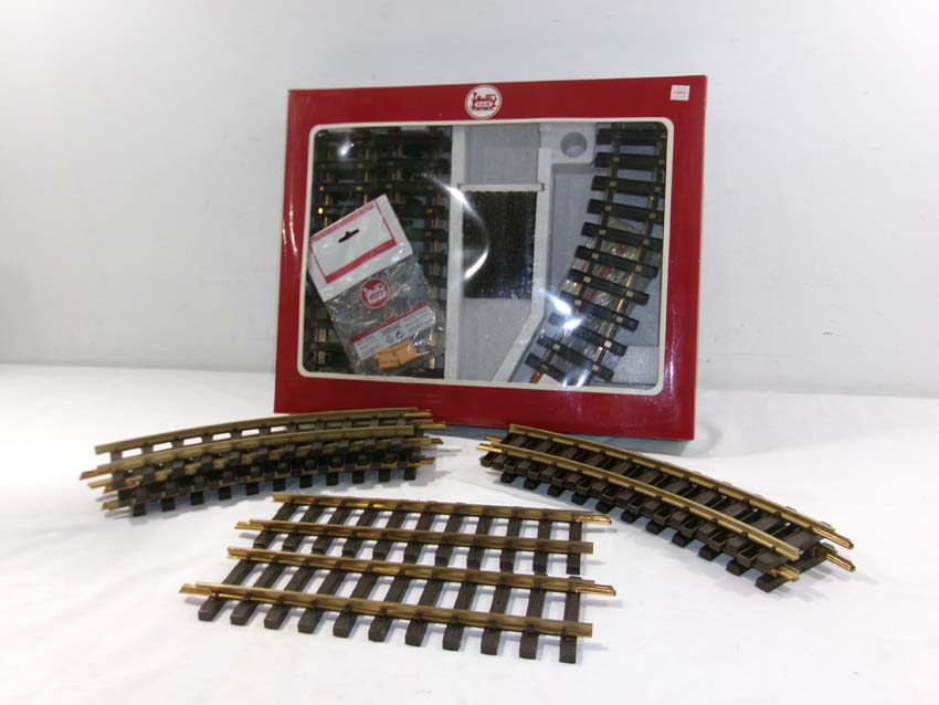 These are the LGB G Gauge #19901 Track Expansion Set, two #1000 Straight Track Sections and seven #11000 Curved Track Sections. Original Box. Examine closely; what is pictured is what you will receive. Please add $45.00 for US-48 Shipping and Insurance (more west of the Mississippi).