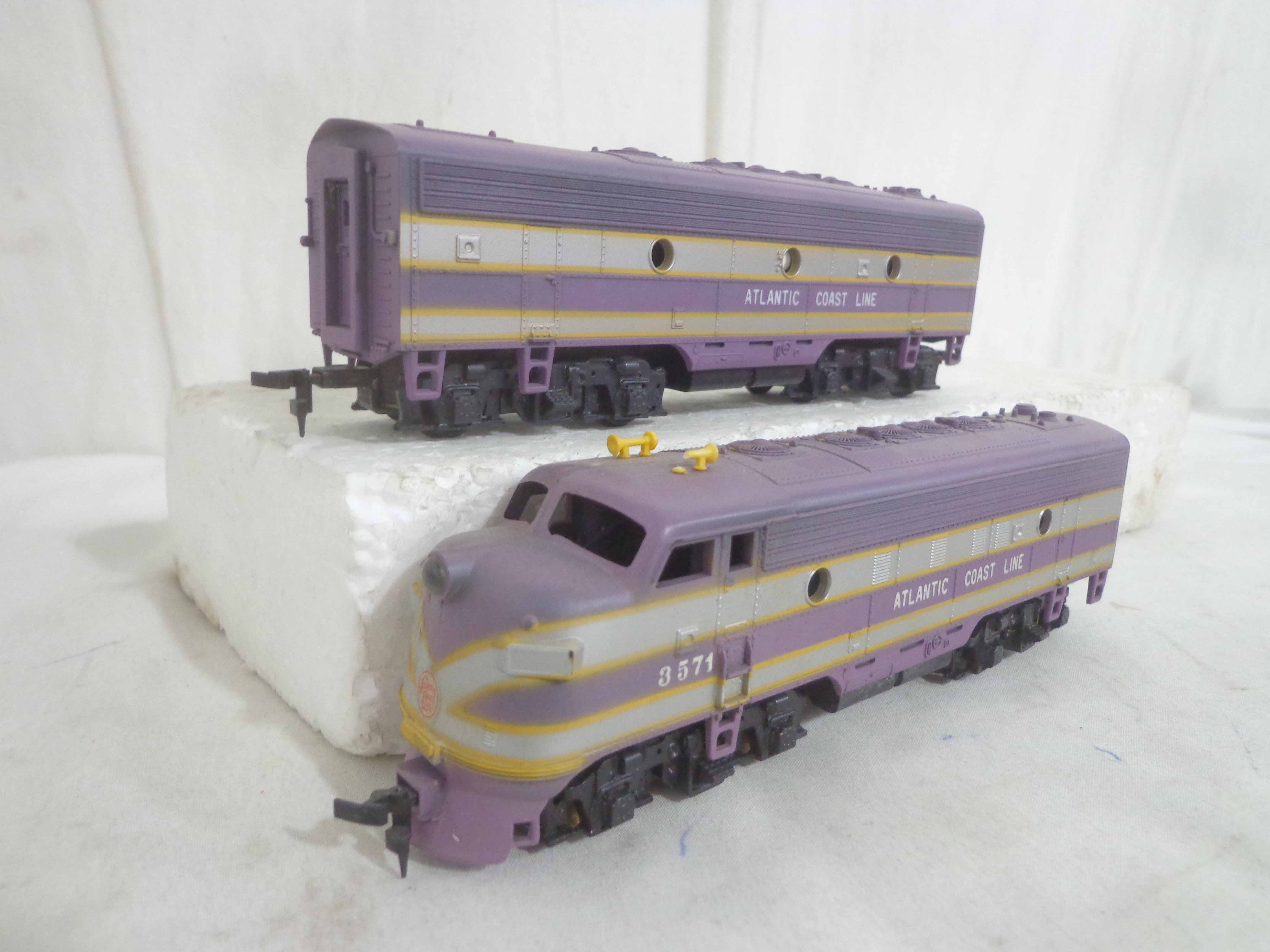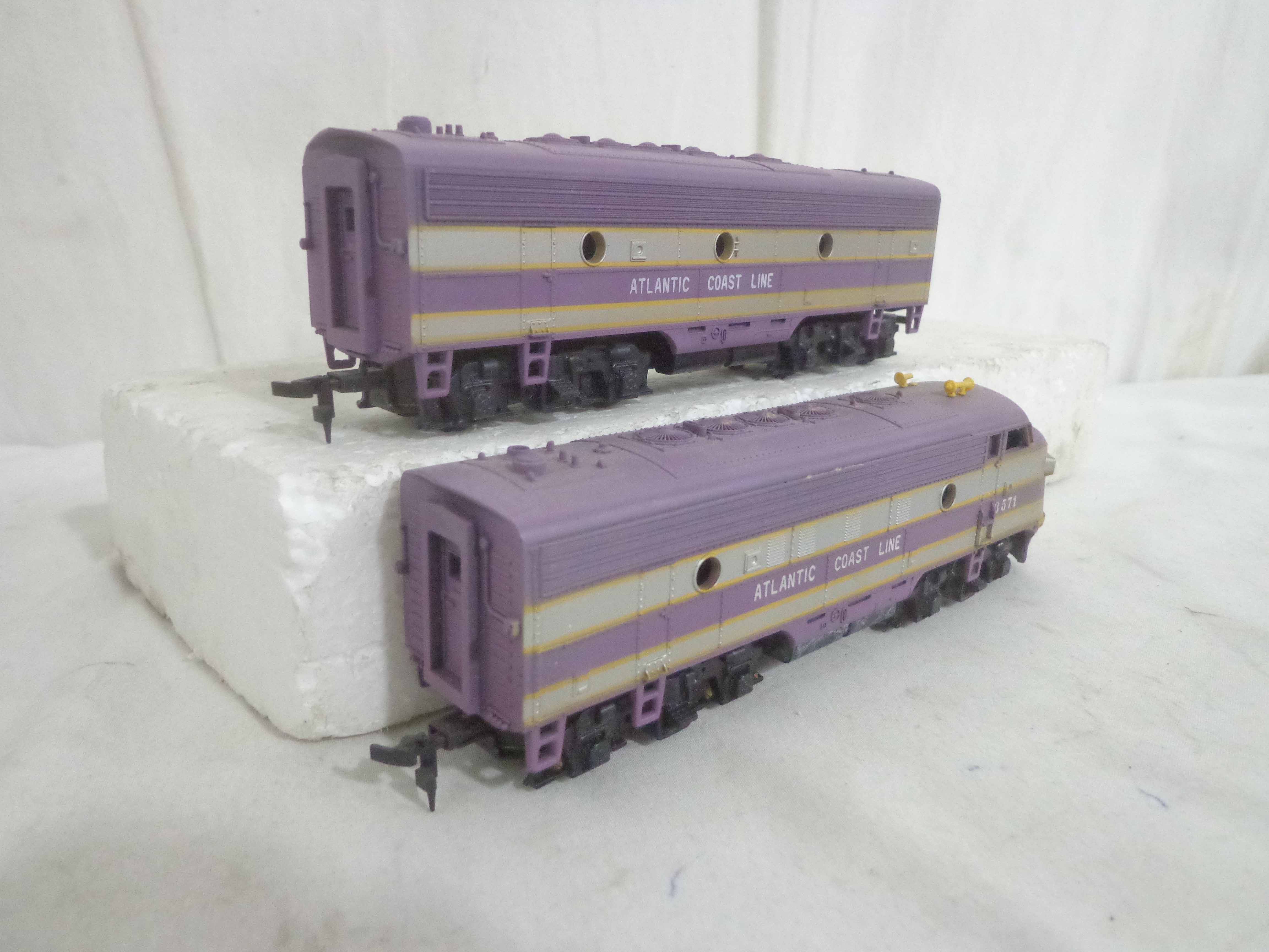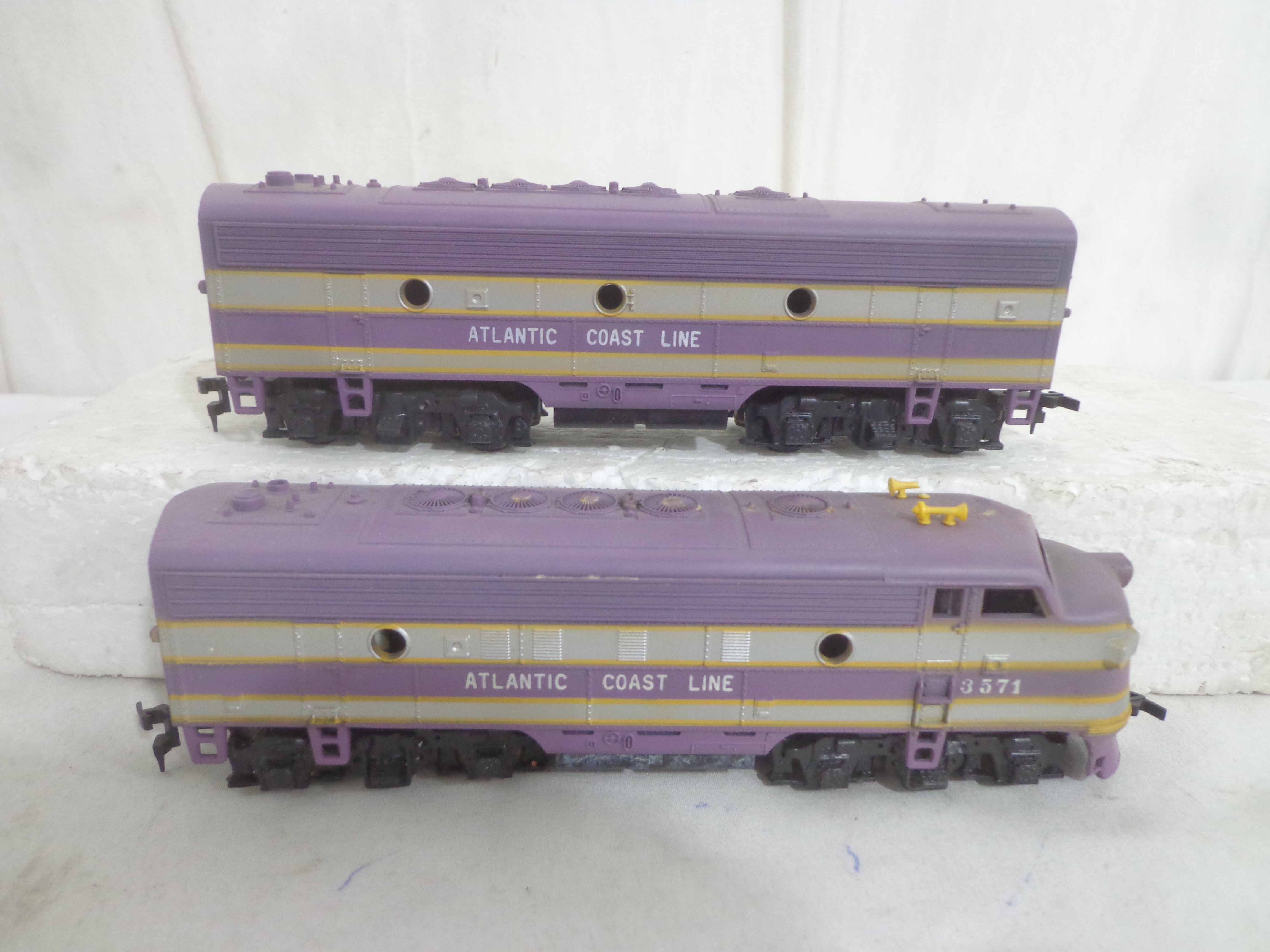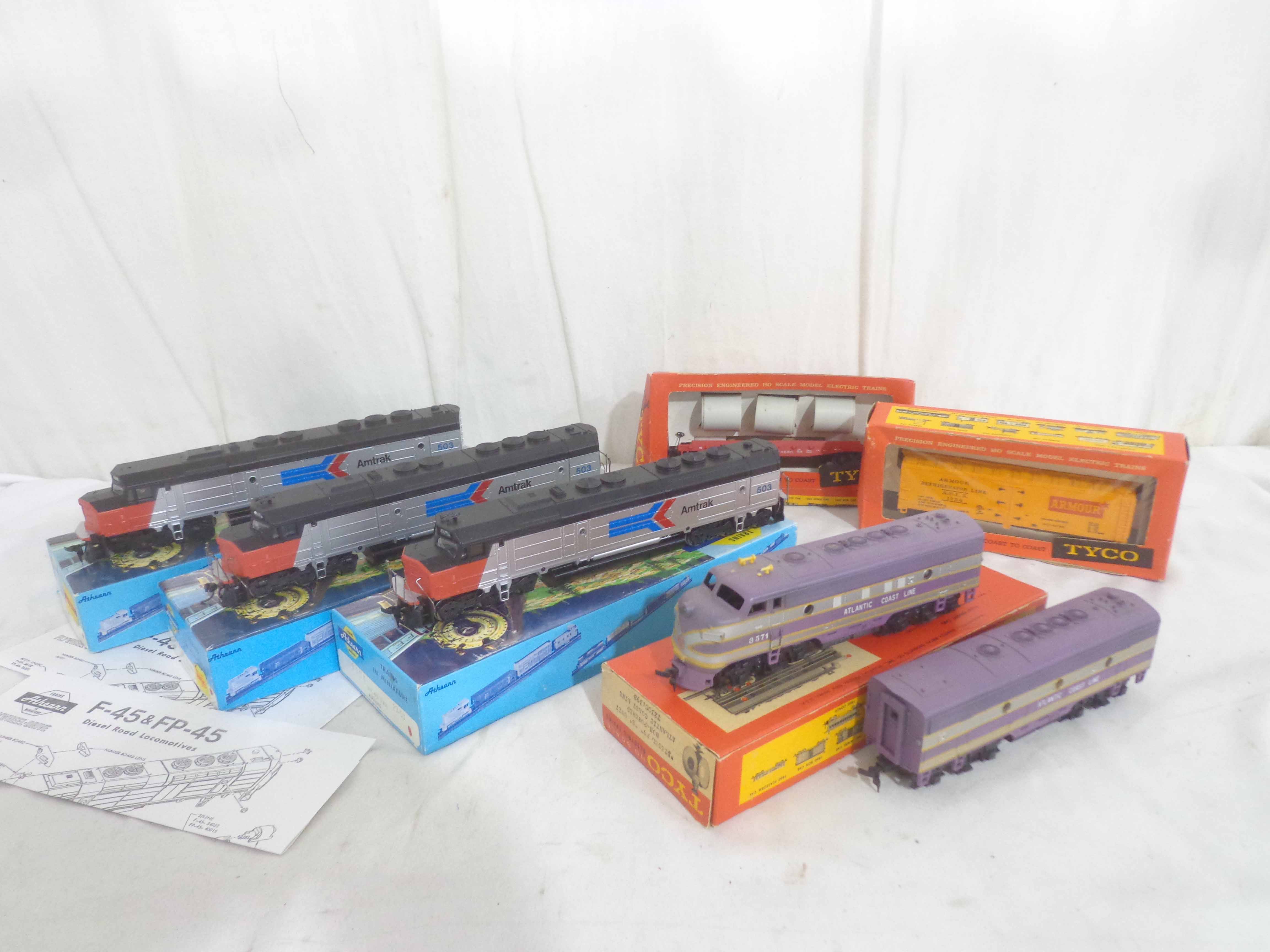 These are the Athearn/Tyco HO Gauge #3624/3624 Amtrak FP45 Engines, #3634 Amtrak Non-Powered Engine, #3571/T230C:398 Atlantic Coast Line AB Units and two Freight Cars. Six Original Boxes. Examine closely; what is pictured is what you will receive. Please add $40.00 for US-48 Shipping and Insurance (more west of the Mississippi).