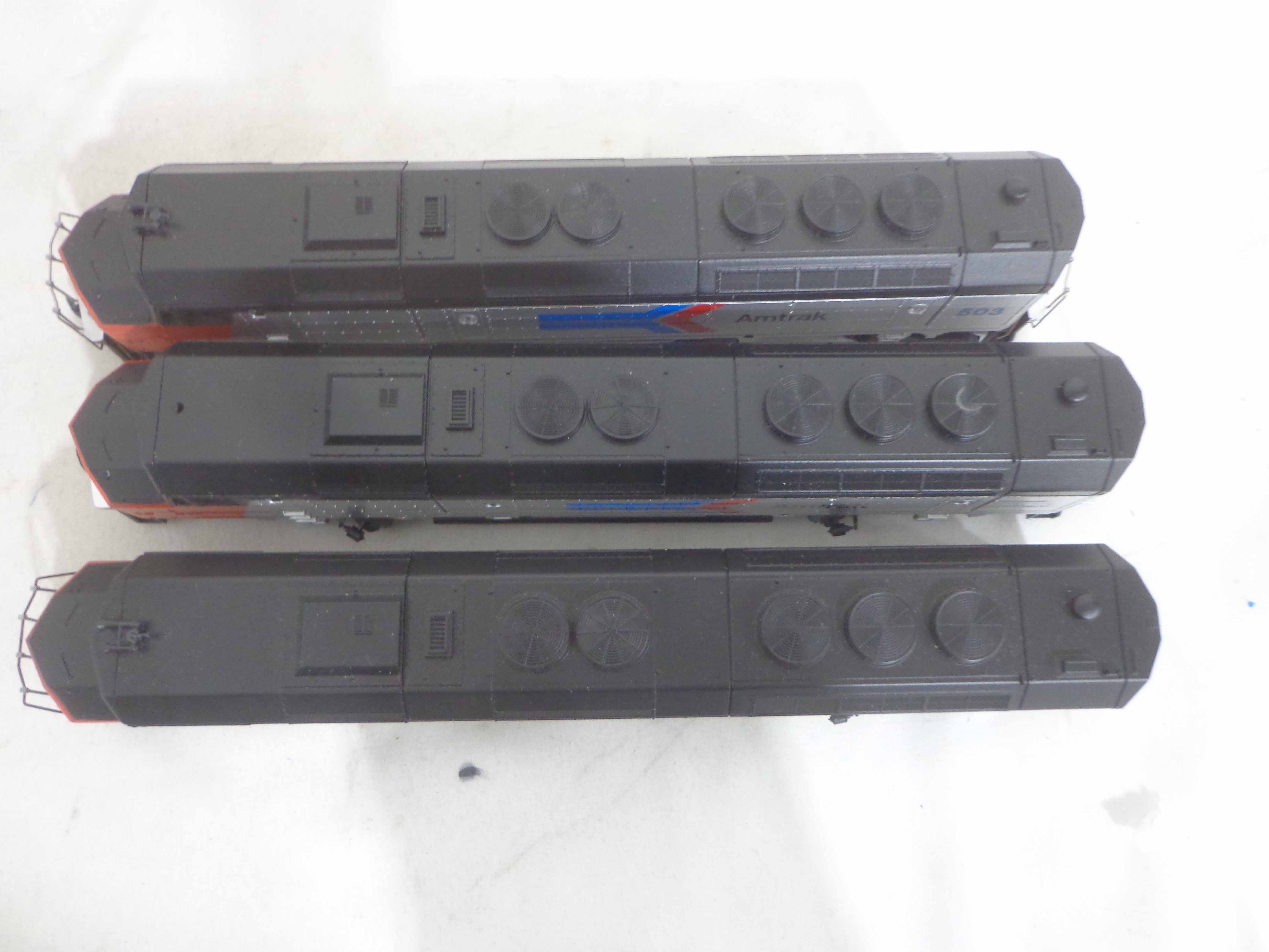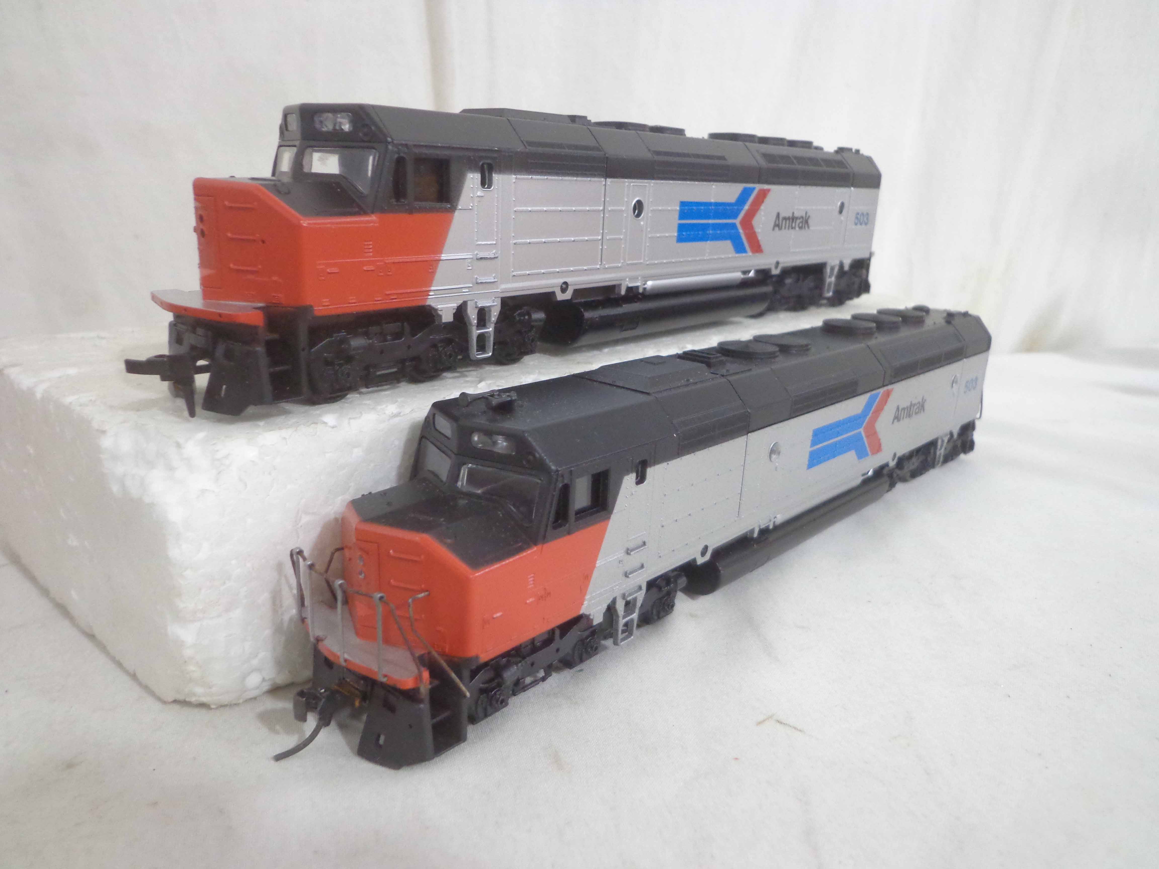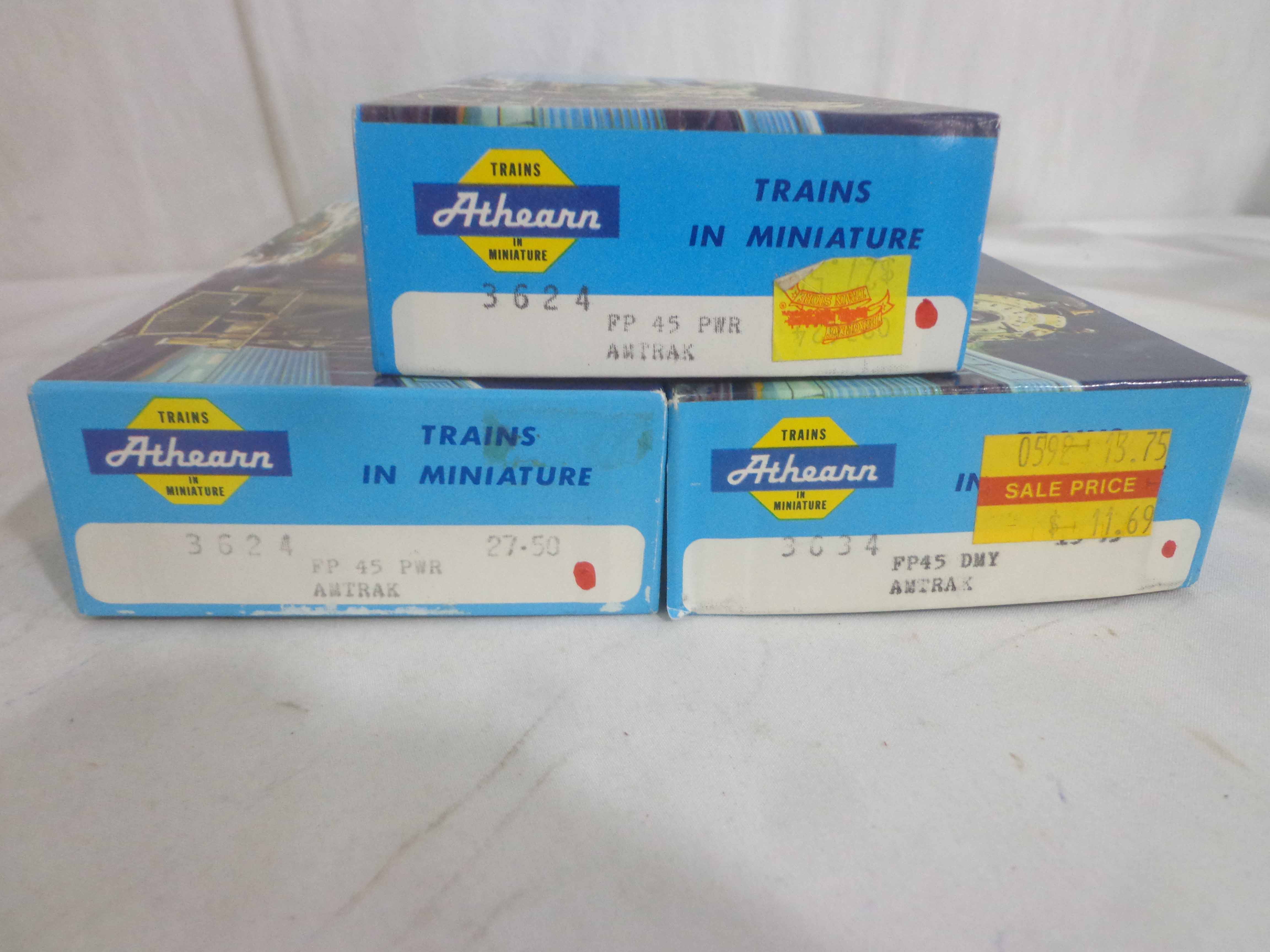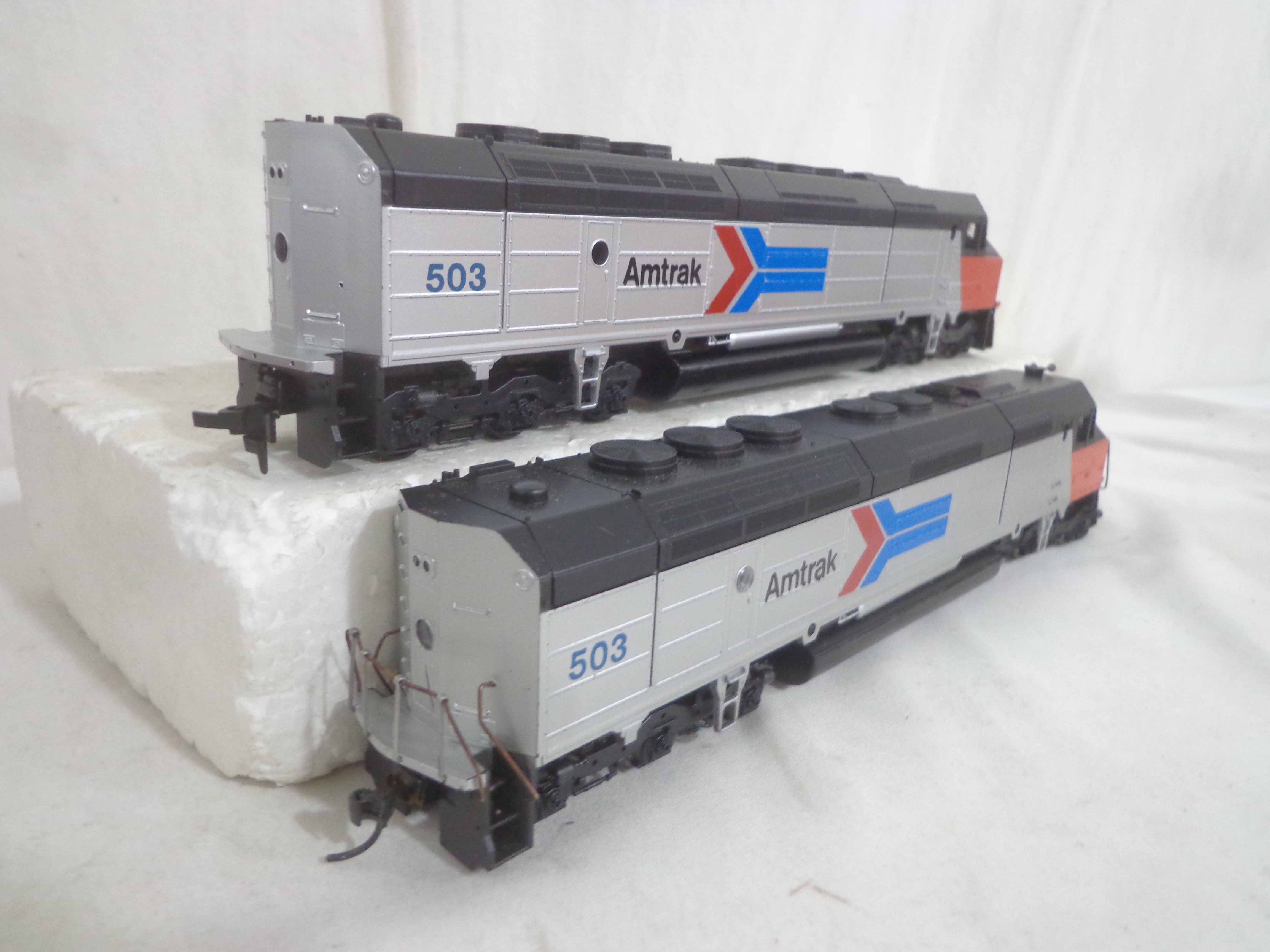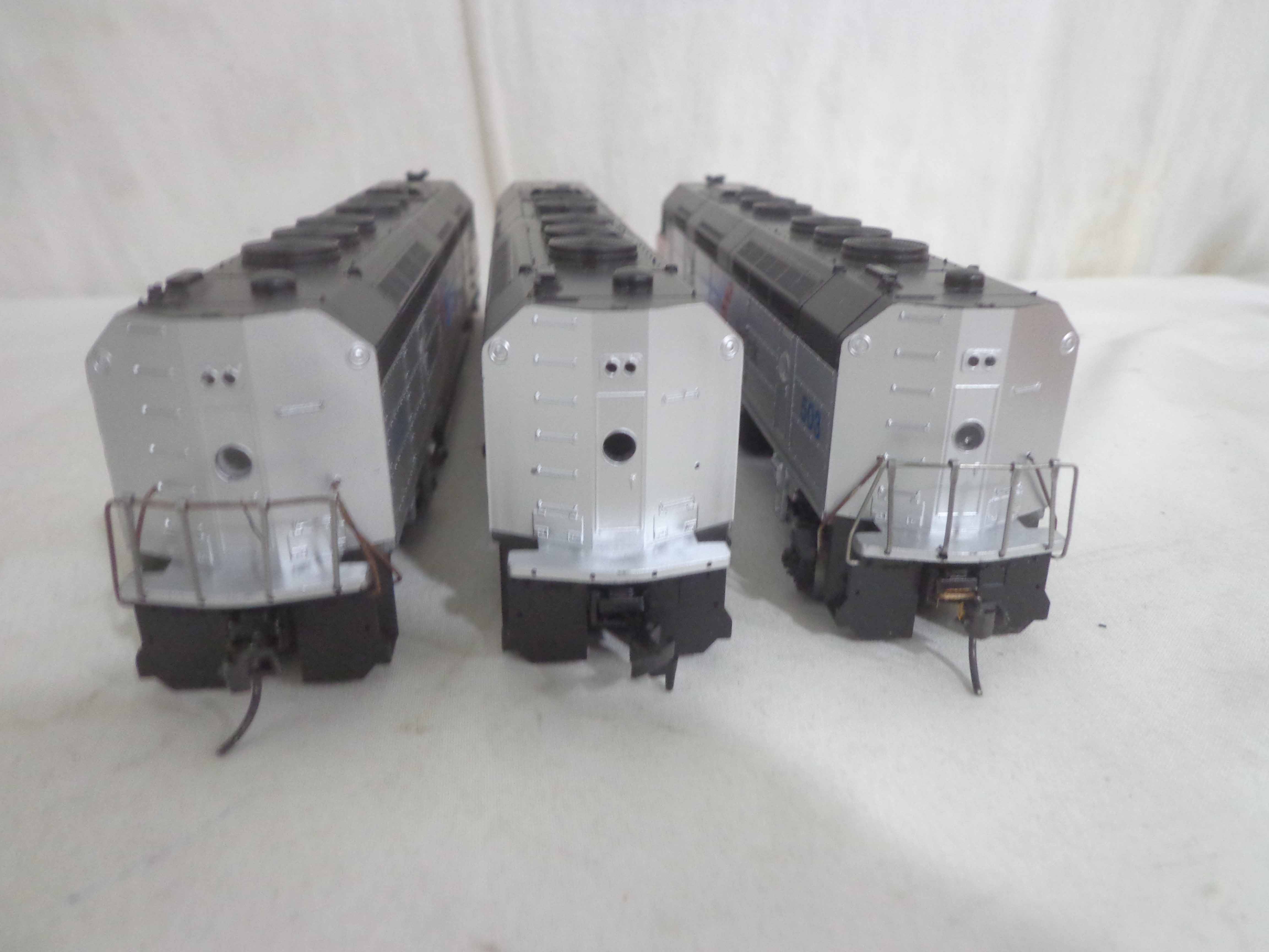 These are the Athearn/Tyco HO Gauge #3624/3624 Amtrak FP45 Engines, #3634 Amtrak Non-Powered Engine, #3571/T230C:398 Atlantic Coast Line AB Units and two Freight Cars. Six Original Boxes. Examine closely; what is pictured is what you will receive. Please add $40.00 for US-48 Shipping and Insurance (more west of the Mississippi).