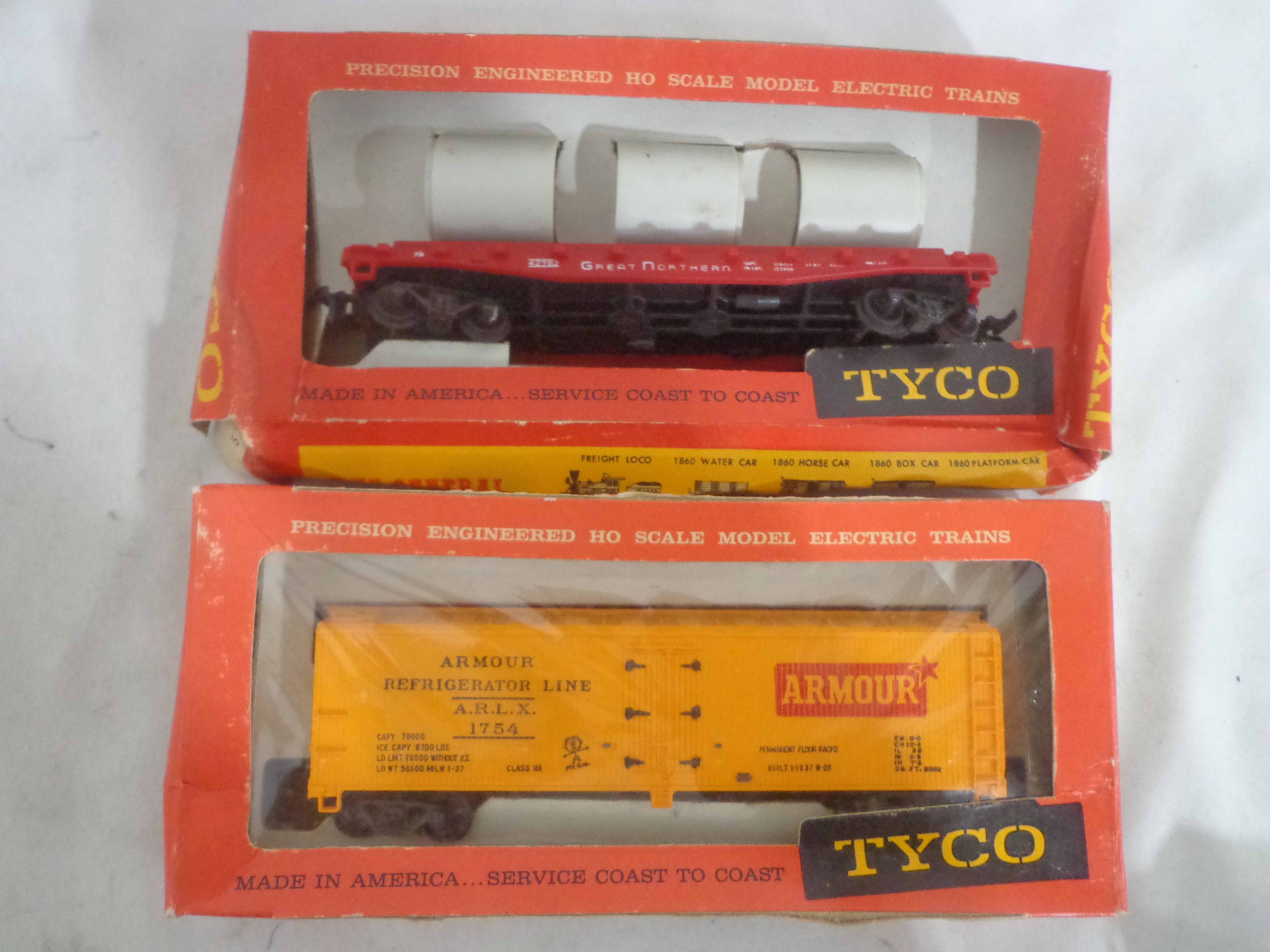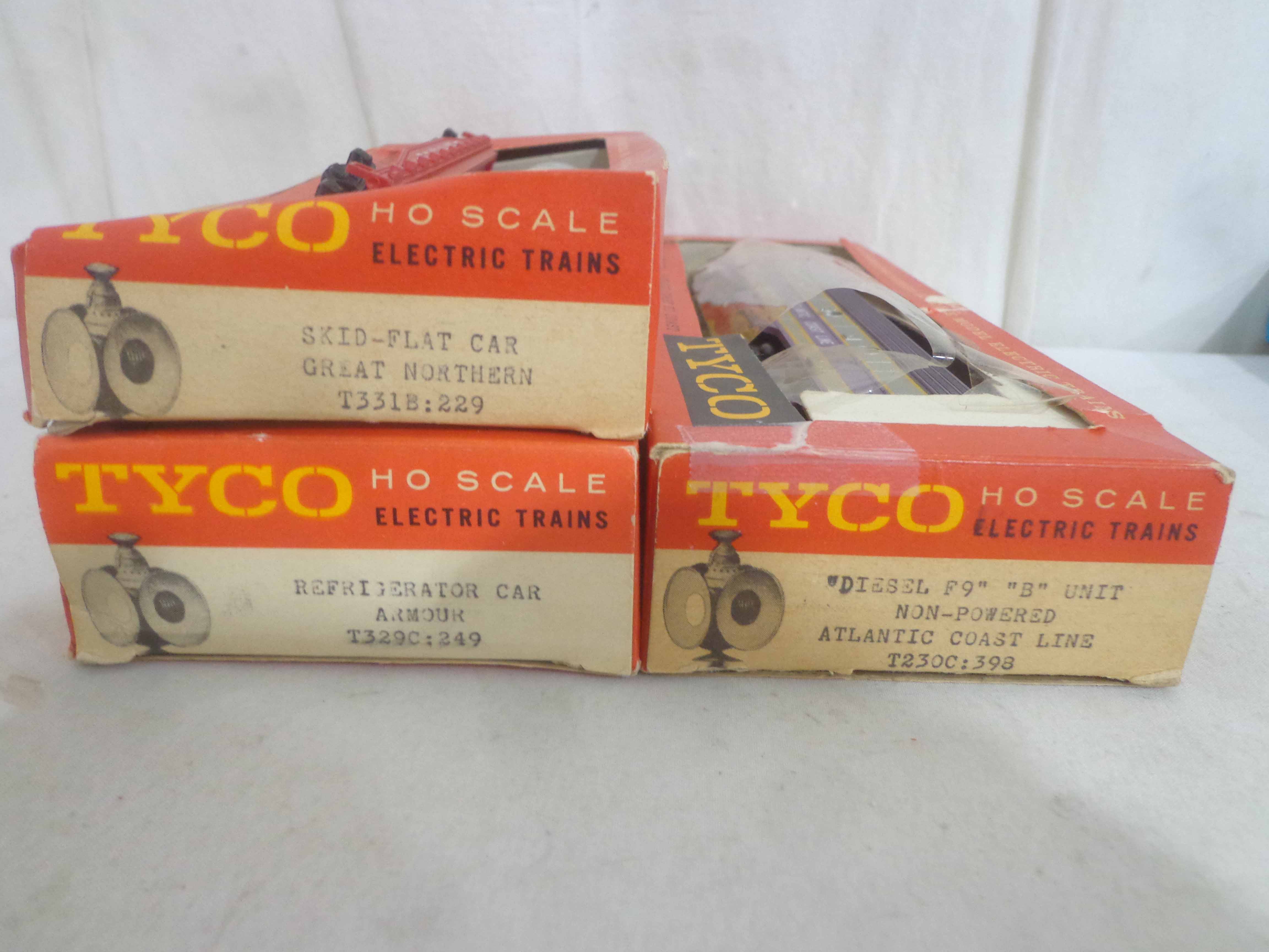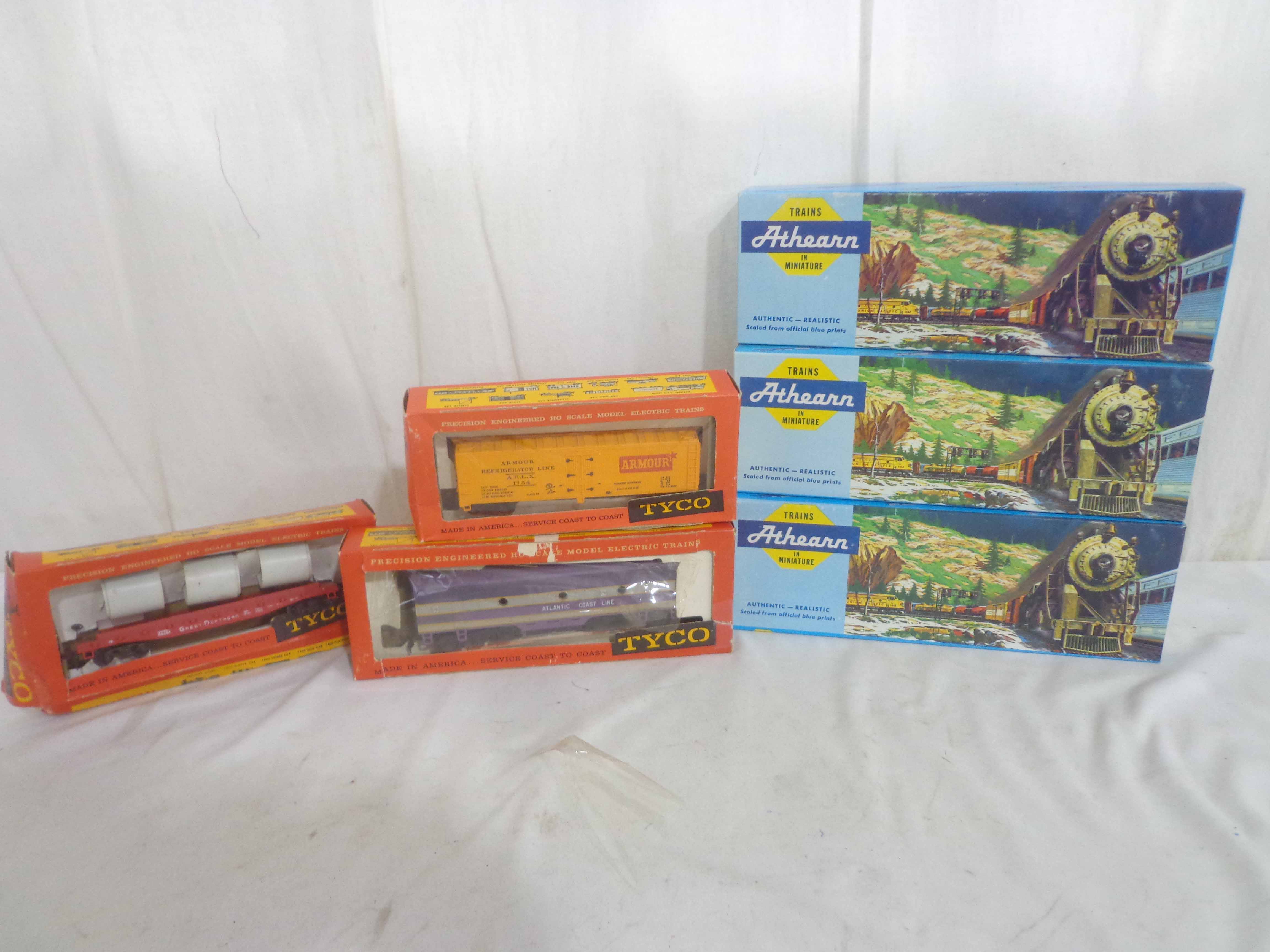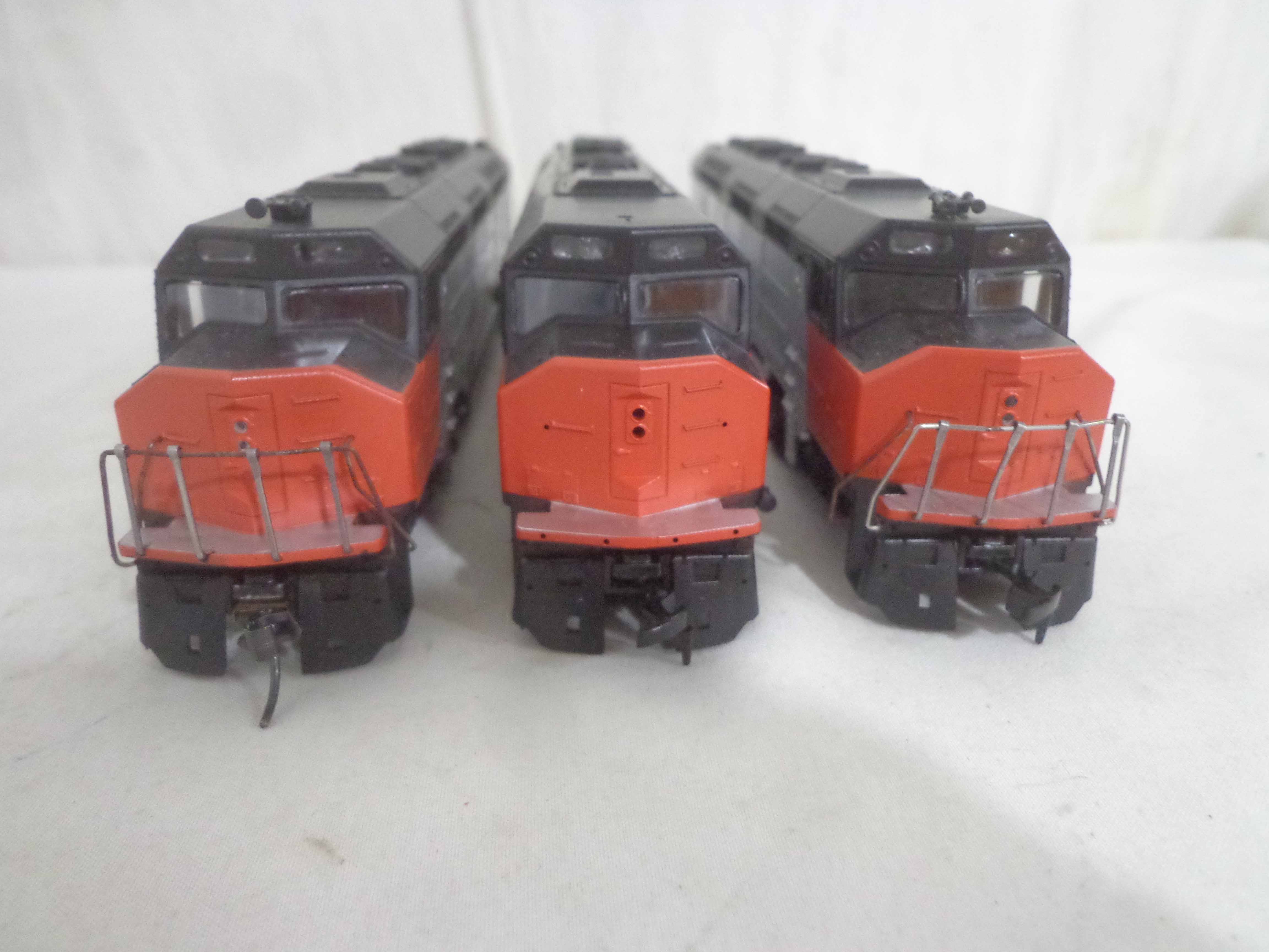 These are the Athearn/Tyco HO Gauge #3624/3624 Amtrak FP45 Engines, #3634 Amtrak Non-Powered Engine, #3571/T230C:398 Atlantic Coast Line AB Units and two Freight Cars. Six Original Boxes. Examine closely; what is pictured is what you will receive. Please add $40.00 for US-48 Shipping and Insurance (more west of the Mississippi).