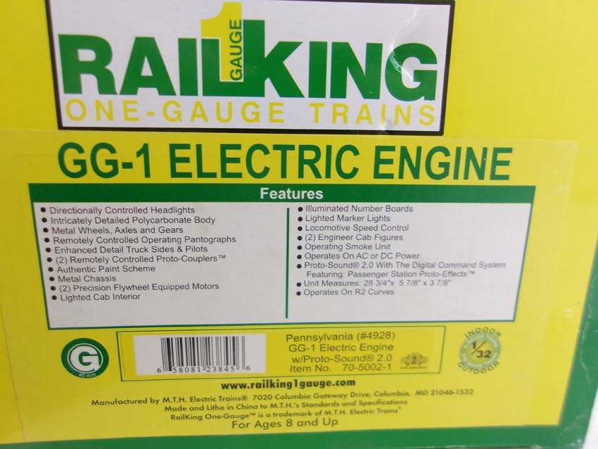 This is the #70-5002-1 PRR GG-1 Electric Engine (protosounds 2) that MTH/Railking made in G Gauge a few years ago. Original Box. Examine closely; what it pictured is what you will receive. Please add $50.00 for US-48 Shipping and Insurance (more west of the Mississippi).