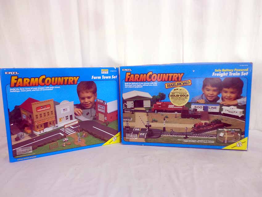 These are the Ertl Farm Country #3401 Farm Country Railroad Set and #4299 Farm Town Kit Set. Original Boxes. Examine closely; what is pictured is what you will receive. Please add $40.00 for US-48 Shipping and Insurance (more west of the Mississippi). |