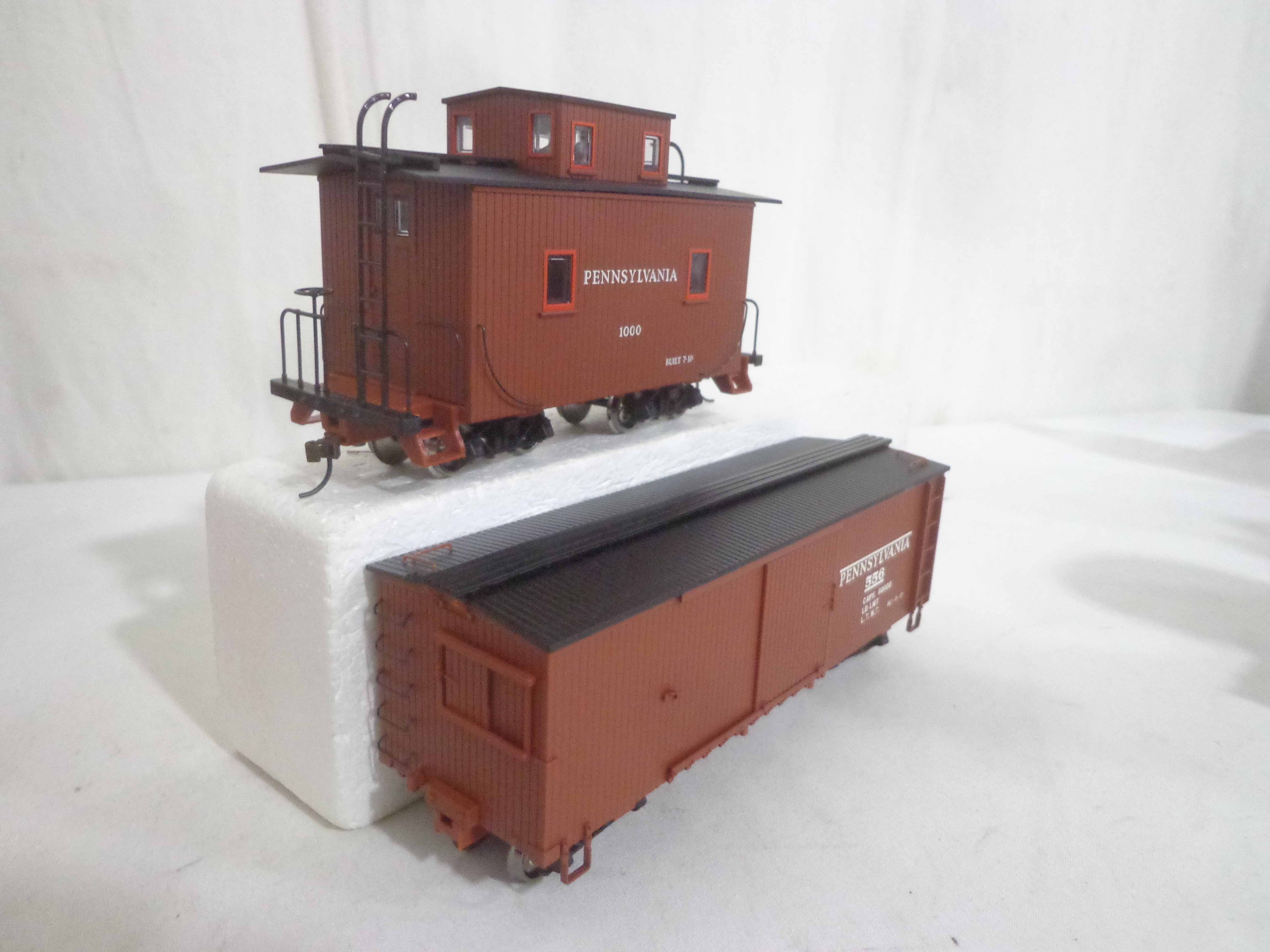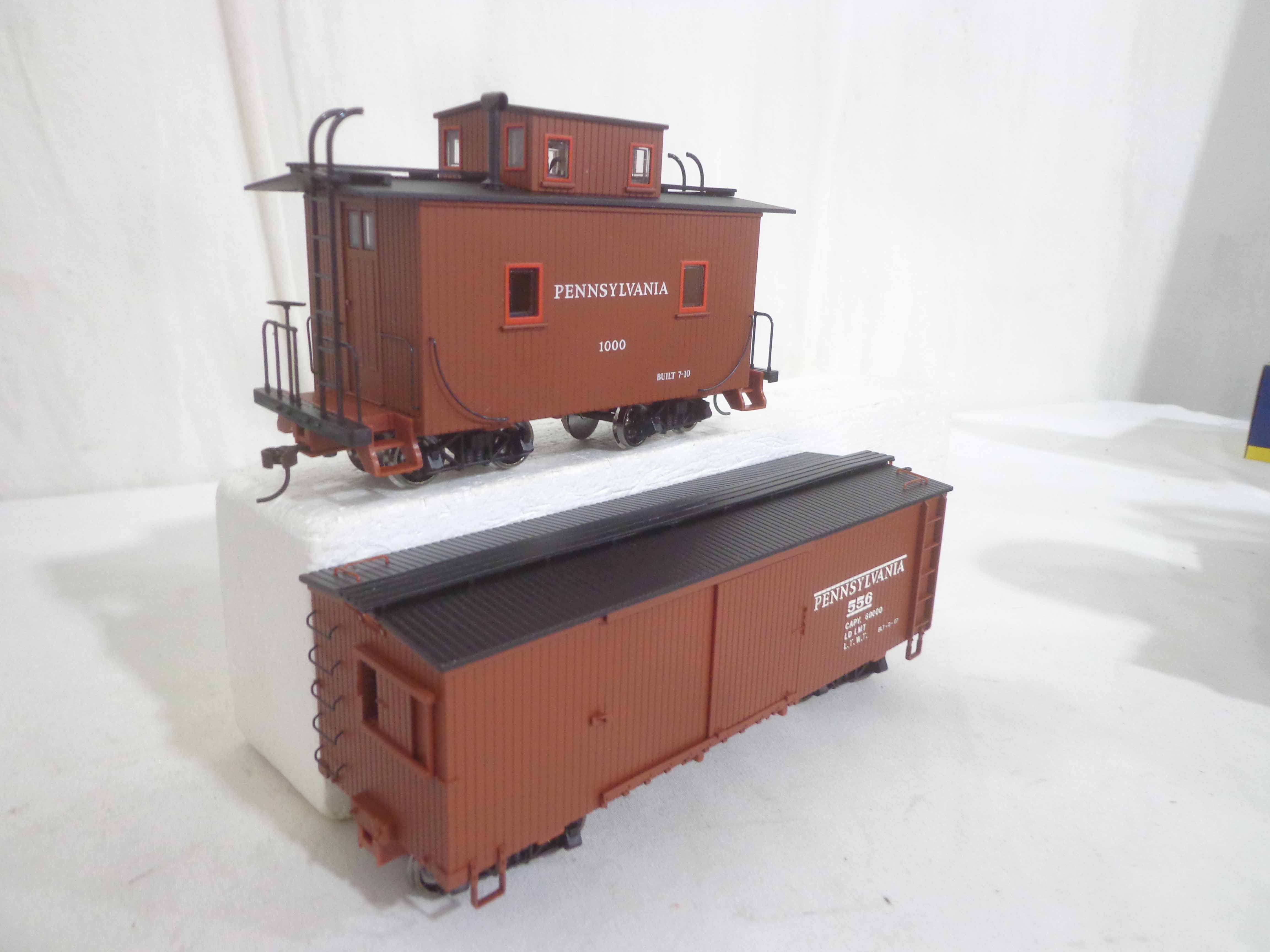 These are the #25314 Pennsylvania Porter 0-4-0 Engine, #27014 Pennsylvania Box Car, #27214 Pennsylvania Gondola, #27314 Pennsylvania Flat Car and #27714 Pennsylvania Caboose that Spectrum made in On30 Scale a few years ago. Original Boxes. Examine closely; what is pictured is what you will receive. Please add $35.00 for US-48 Shipping and Insurance (more west of the Mississippi). |