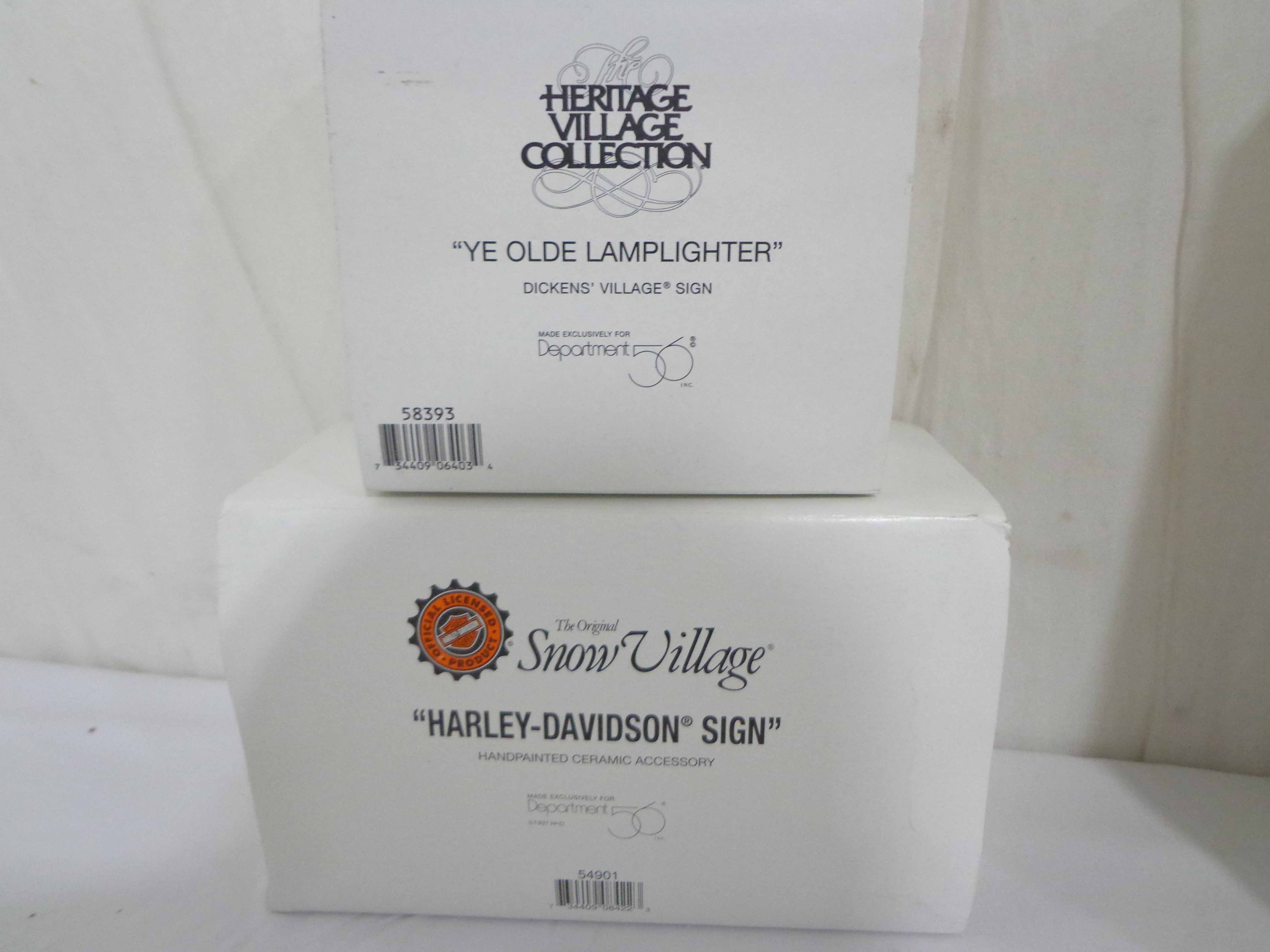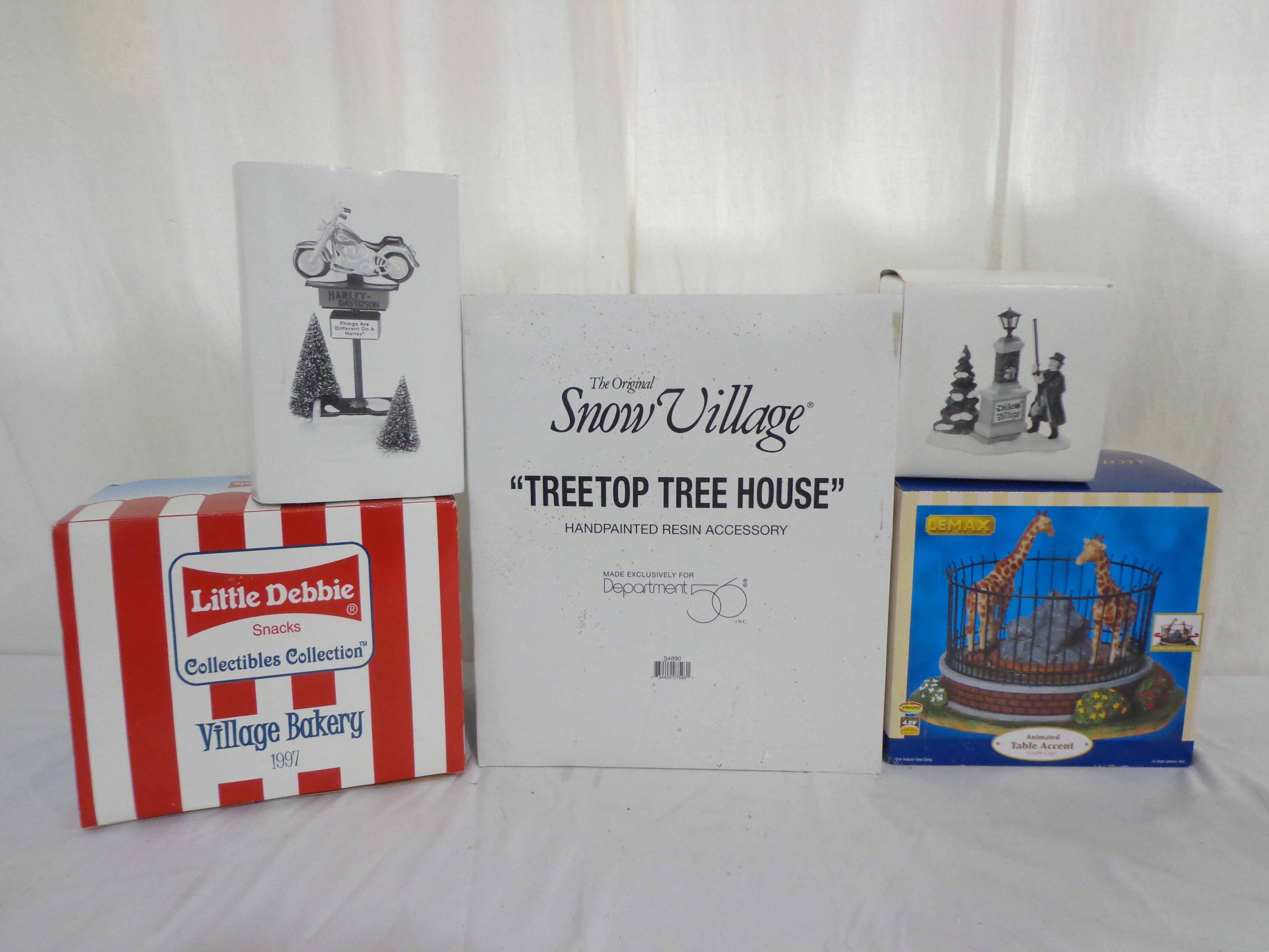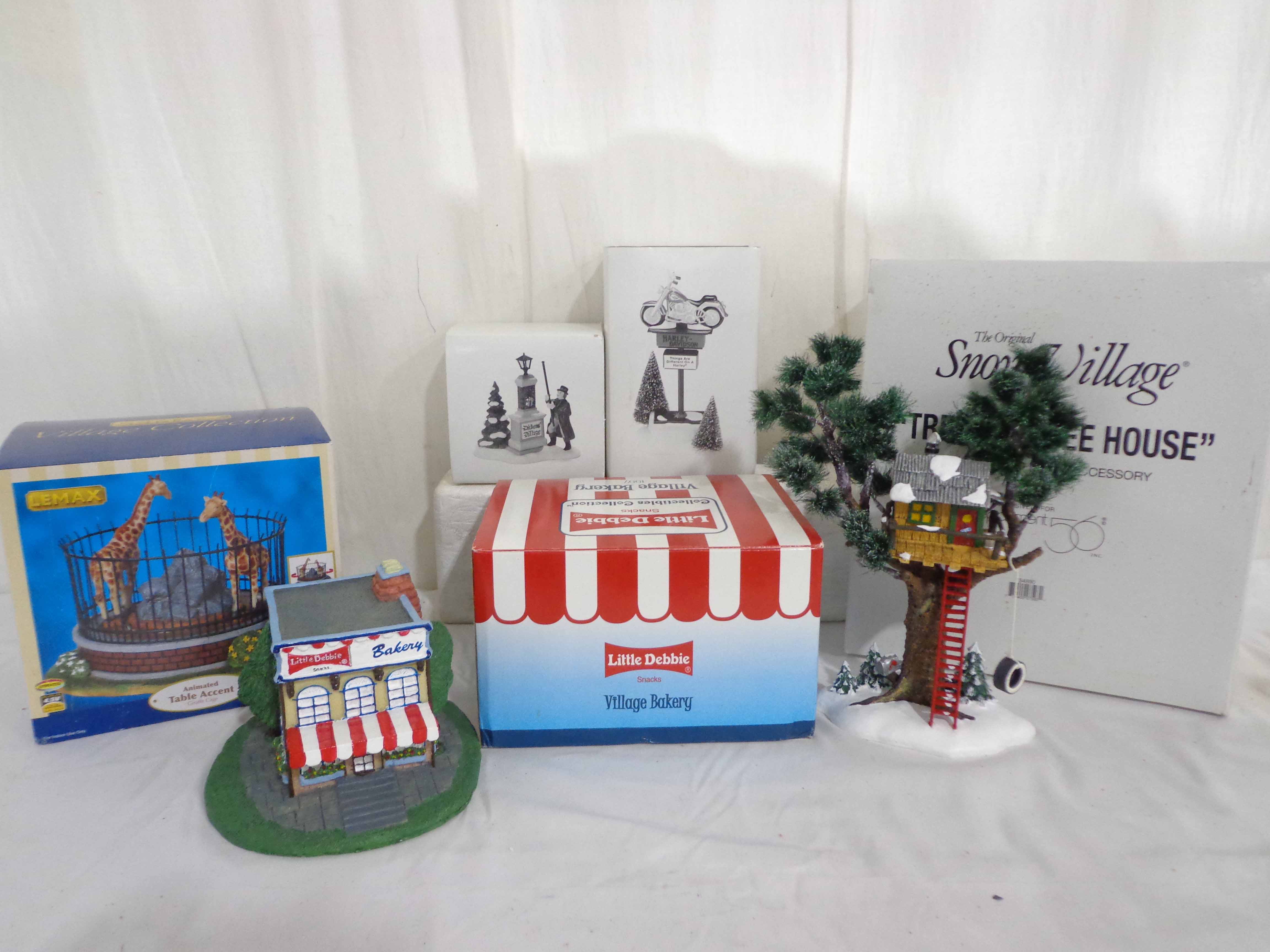 These are Dept 56/Lemax #54890 Treetop Tree House, #58393 Ye Old Lamplighter, #54901 Harley Davidson Sign, #84848 Animated Giraffe Cage and Little Debbie Village Bakery. Original Boxes. What you see is what you get. Please add $45.00 for US-48 Shipping and Insurance (more west of the Mississippi).