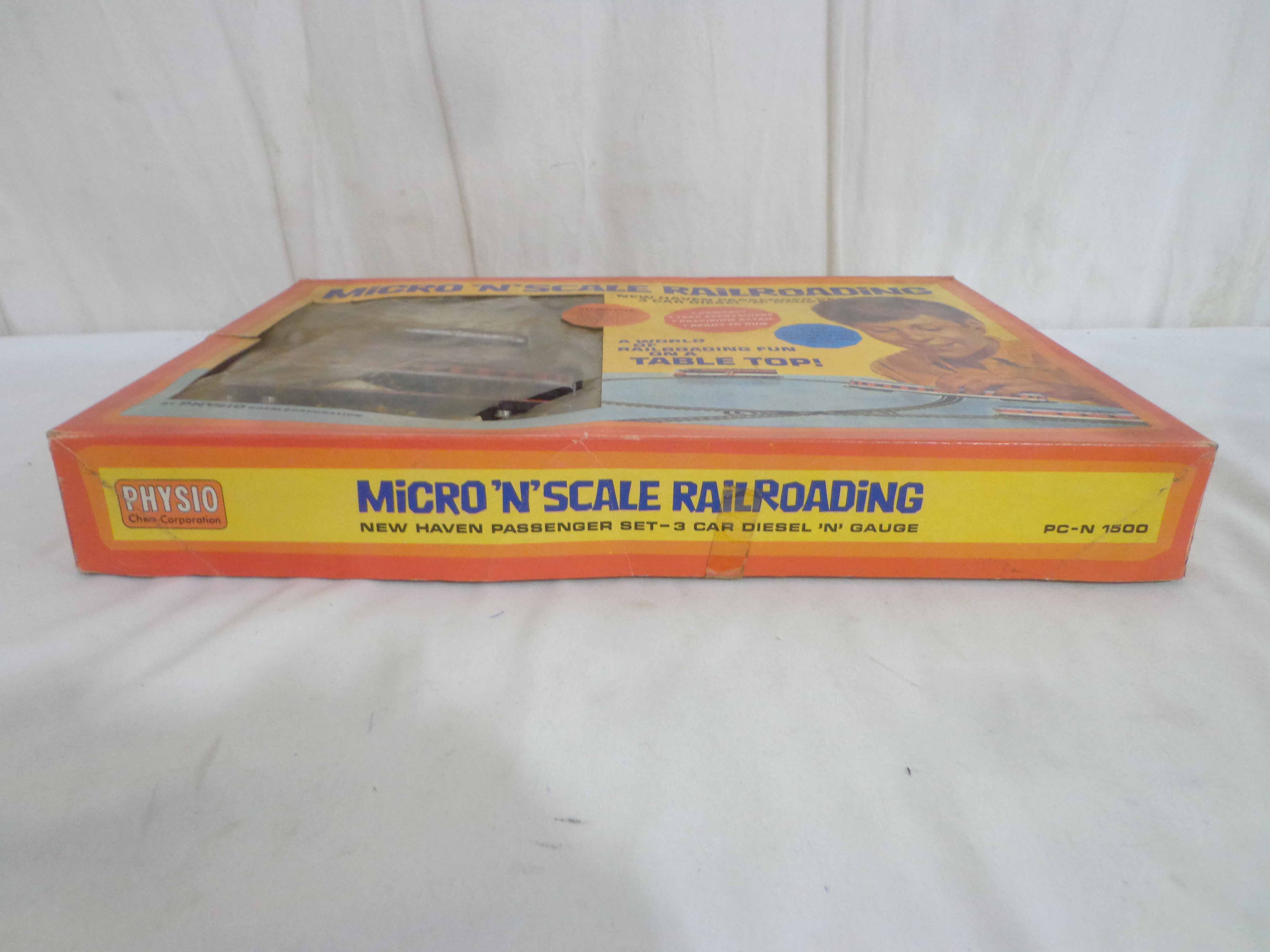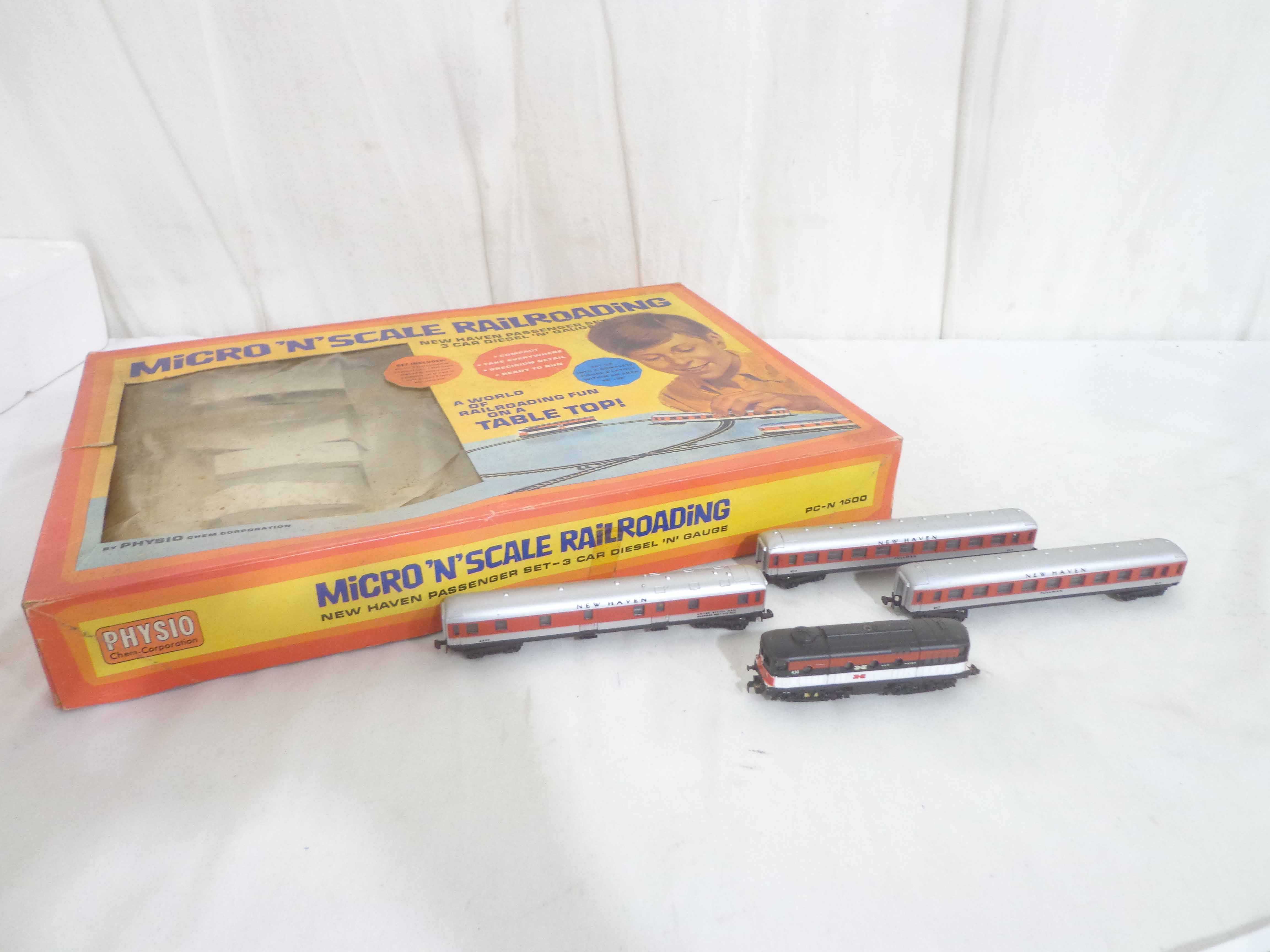 This is the Physio N Gauge #PC-N 1500 New Haven Passenger Train Set. Original Box. Examine closely; what is pictured is what you will receive. Please add $30.00 for US-48 Shipping and Insurance (more west of the Mississippi).