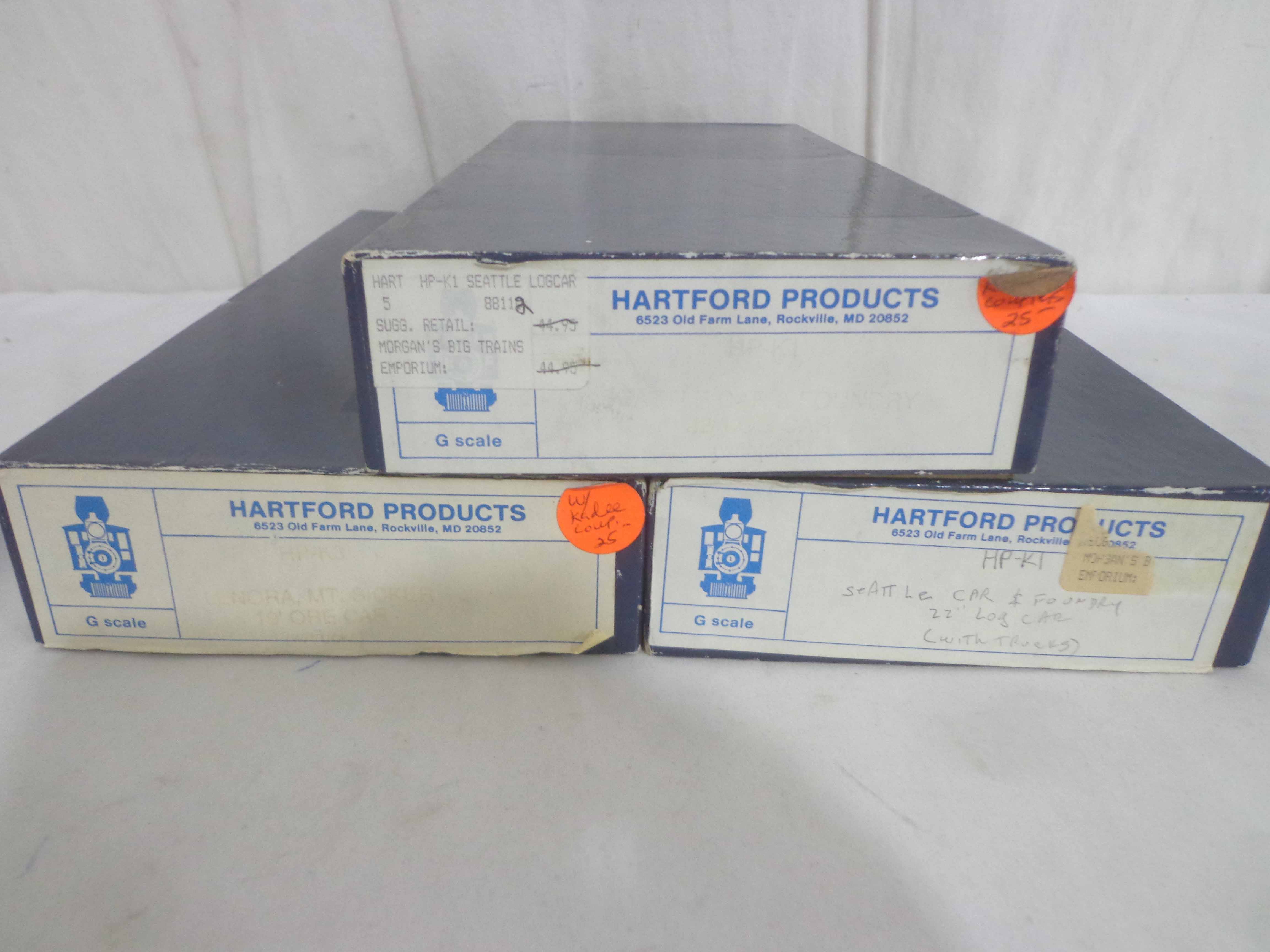 These are three Hartford G Gauge Incomplete Car Kits. Original Boxes. Examine closely; what is pictured is what you will receive. Please add $40.00 for US-48 Shipping and Insurance (more west of the Mississippi). |