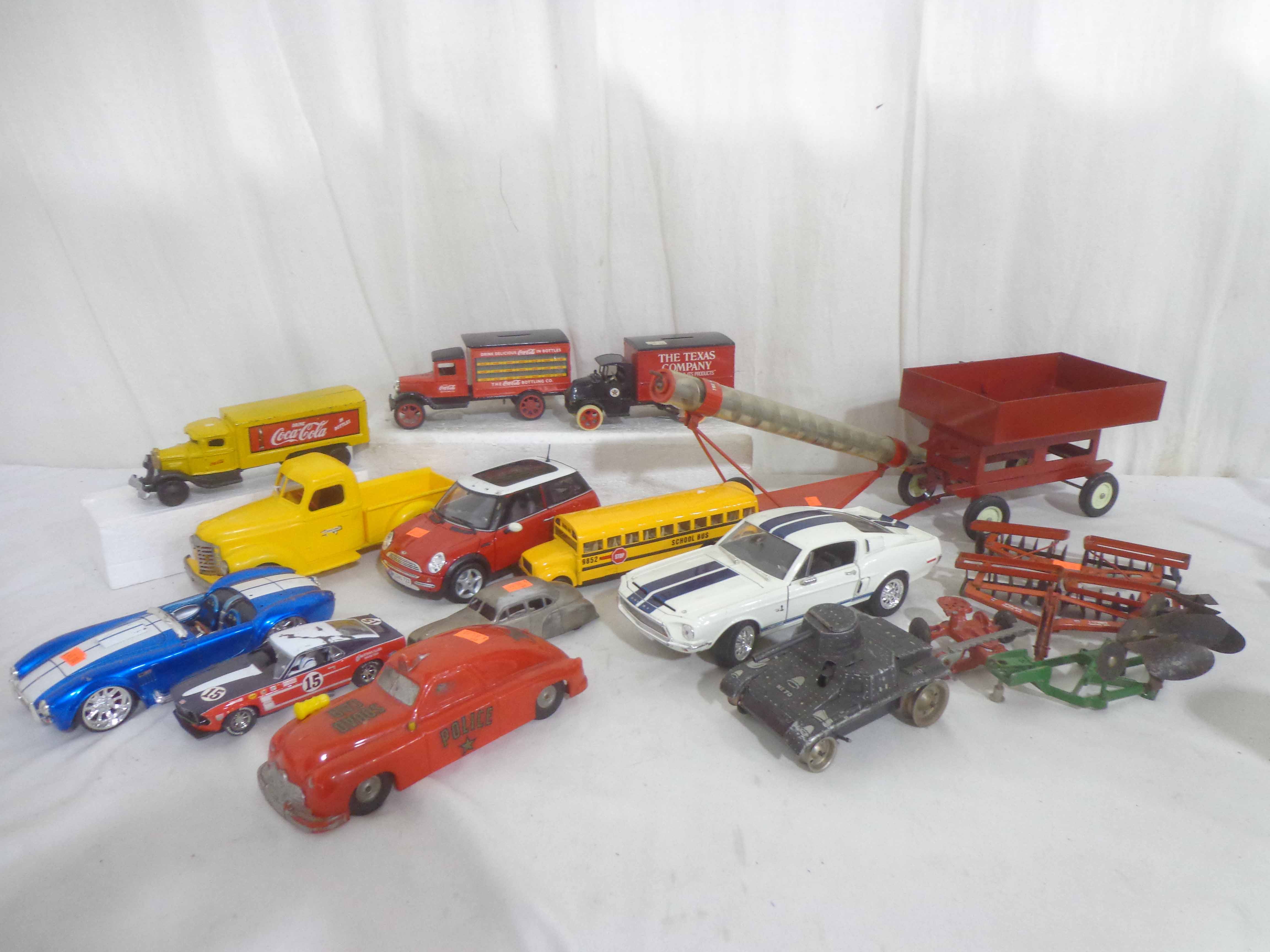 These are thirteen Assorted Manufactures Assorted Scale Die-cast/Metal/Plastic Vehicles. No Boxes. Examine closely; what is pictured is what you will receive. Please add $45.00 for US-48 Shipping and Insurance (more west of the Mississippi). |