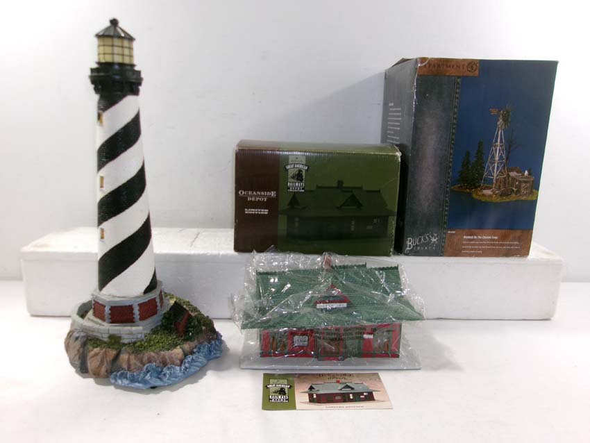 These are the Dept 56/ Hallmark/Unknown #56-52867 Windmill By Chicken Coop, #QHT3501 Oceanside Depot and#? Cape Hatteras Lighthouse. Two Original Boxes. Examine very, very closely; what is clearly pictured is what you will receive. Please add $45.00 for US-48 Shipping and Insurance (more west of the Mississippi).