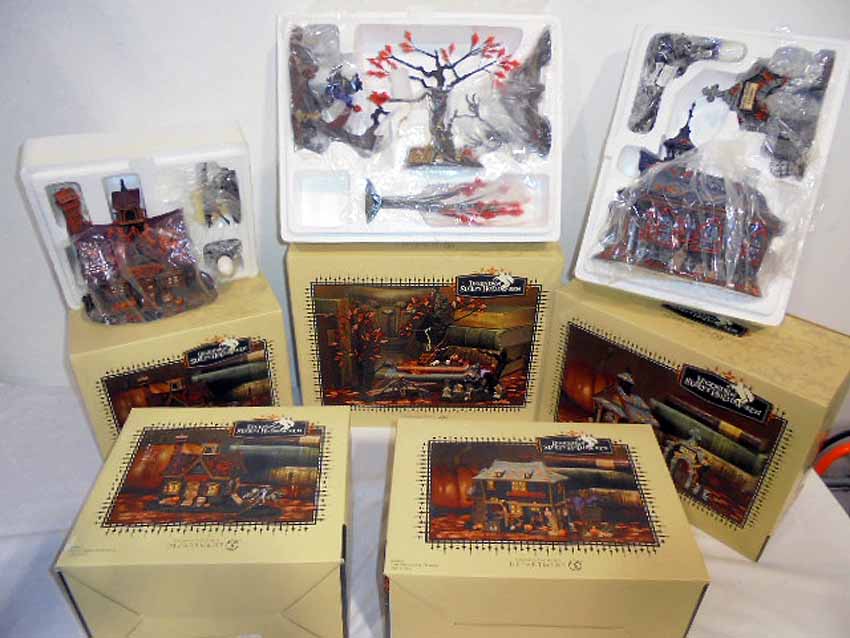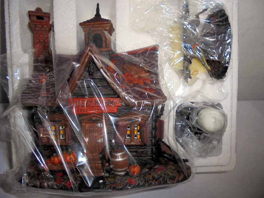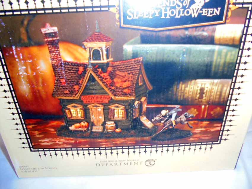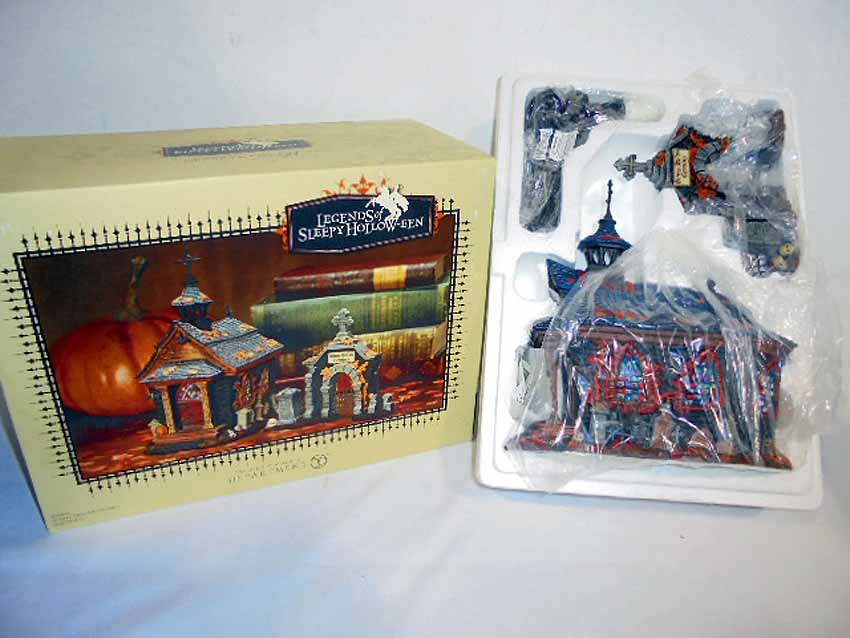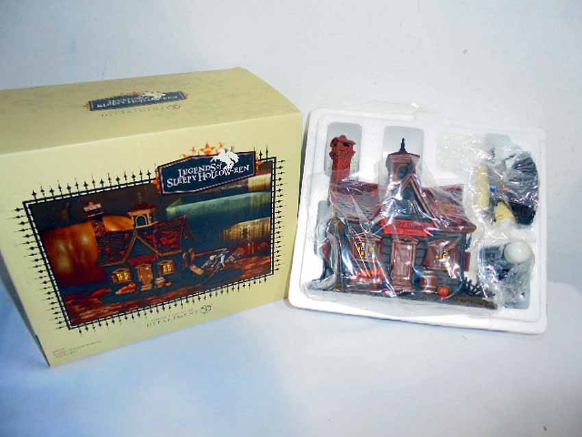 These are the Dept 56 Legends of Sleepy Hollow Ceramic Scenes, two #806457 Sleepy Hollow School, #806459 The Headless Horseman, #806456 Sleepy Hollow Church and #806458 The Witches Hat Tavern. Original Boxes. Examine closely; what is pictured is what you will receive. Please add $50.00 for US-48 Shipping and Insurance (more west of the Mississippi).
