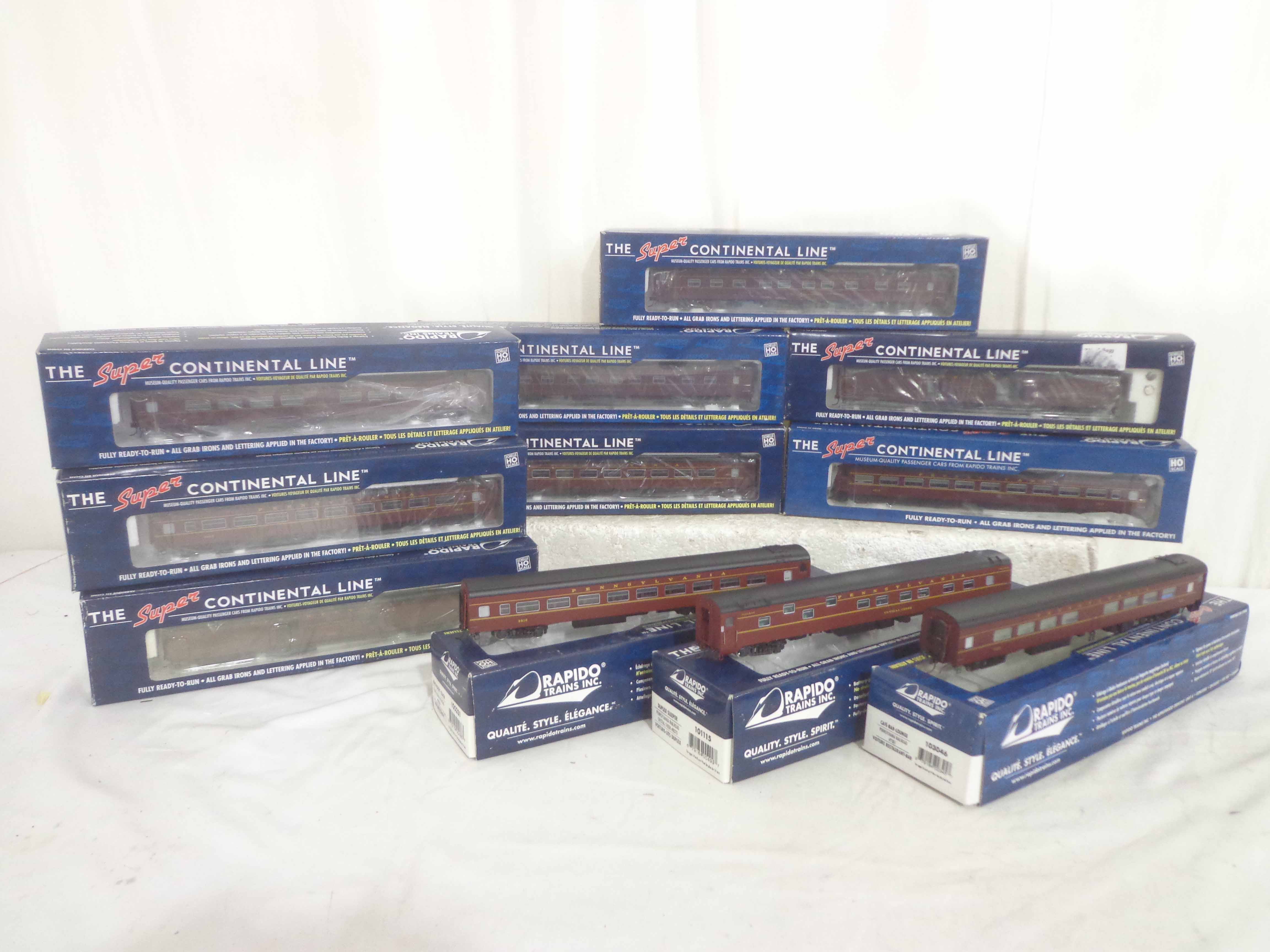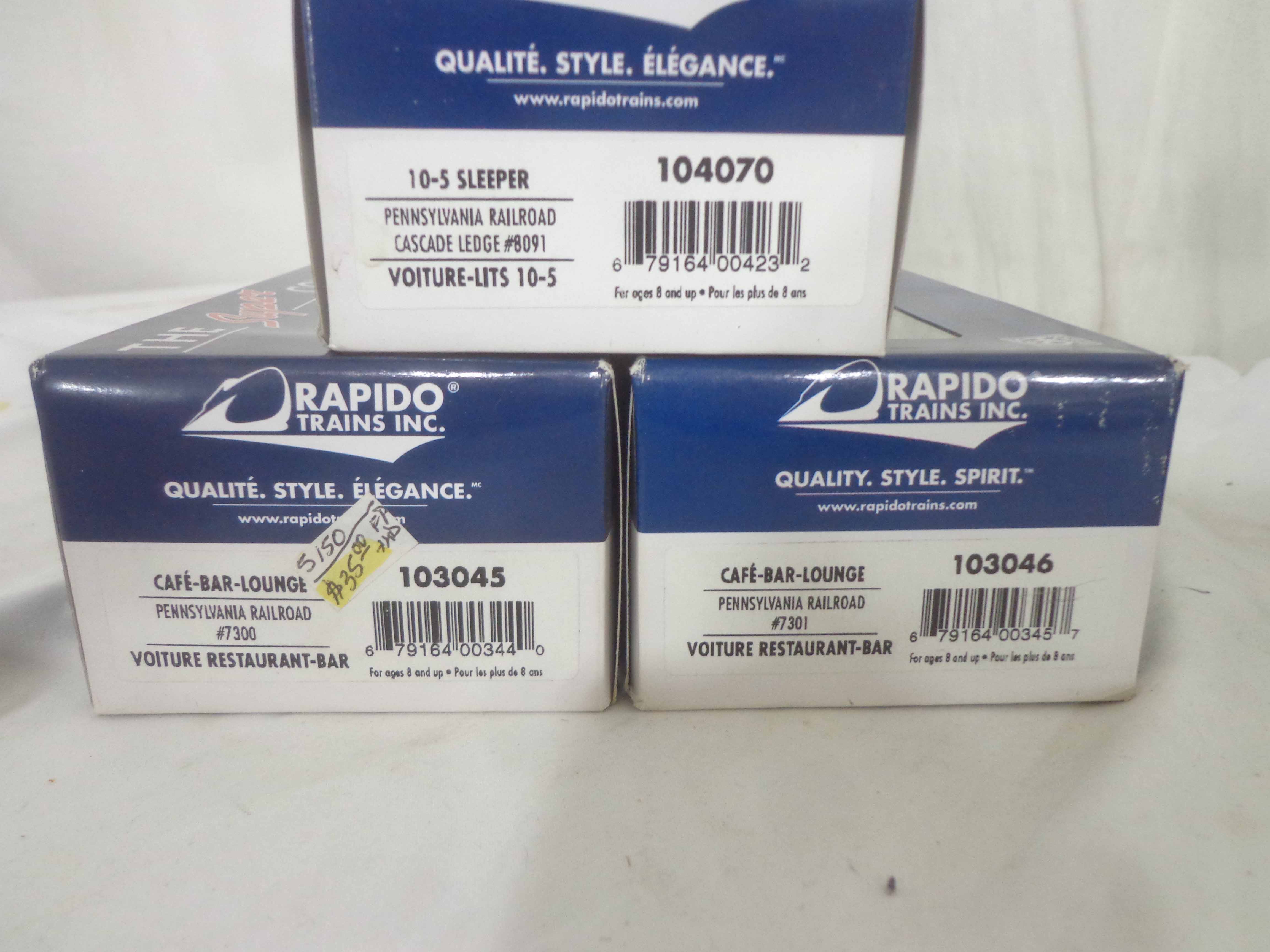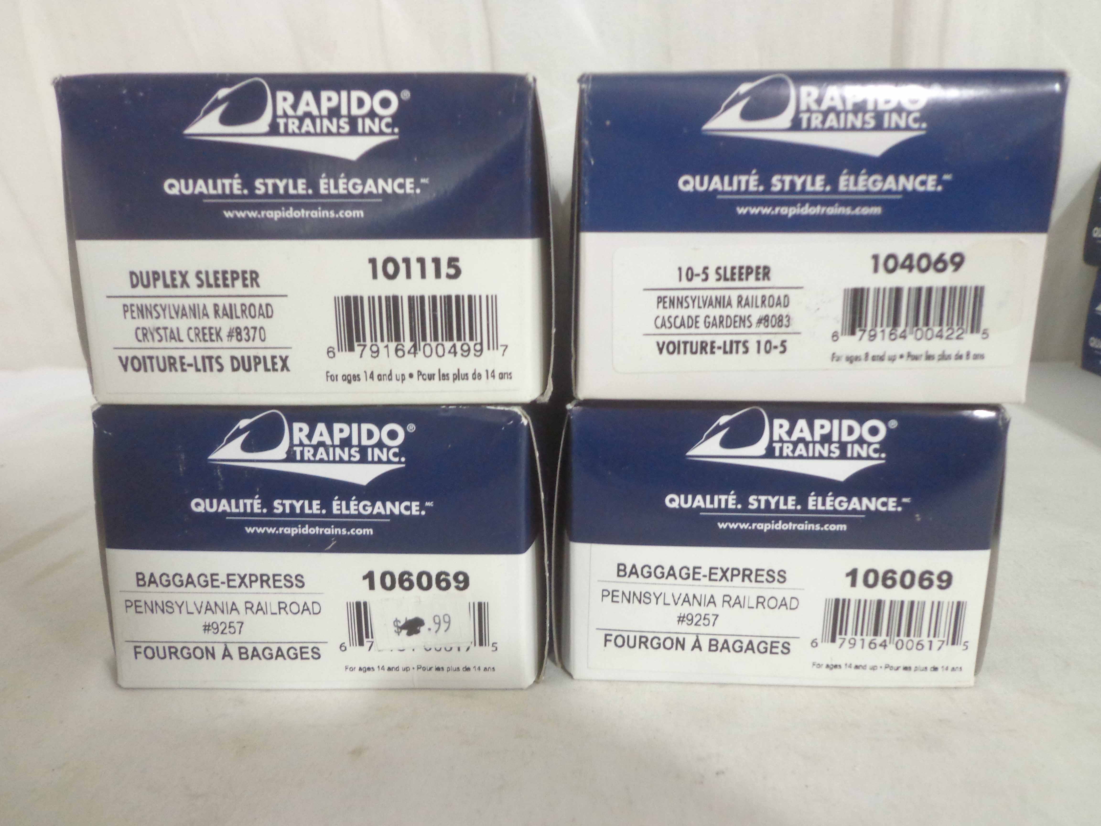 These are the #100060/100230/100231/100234/101115/103045/103046/104069/104070/106069/106069/106069 Pennsylvania Passenger Cars that Rapido Trains made in HO Gauge some time in the past. Original Boxes. Examine closely; what is pictured is what you will receive. Please add $40.00 for US-48 Shipping and Insurance (more west of the Mississippi).