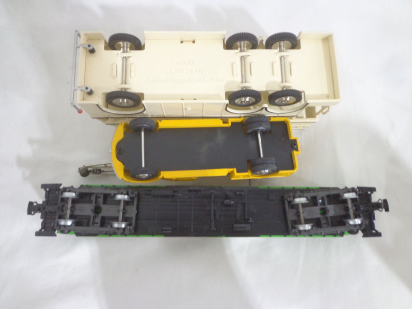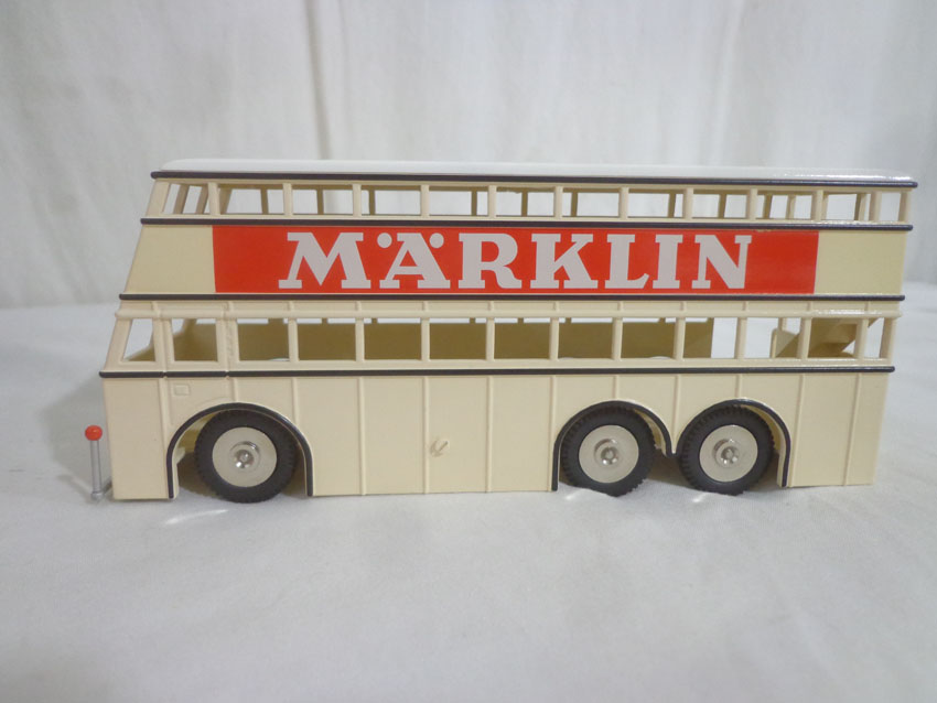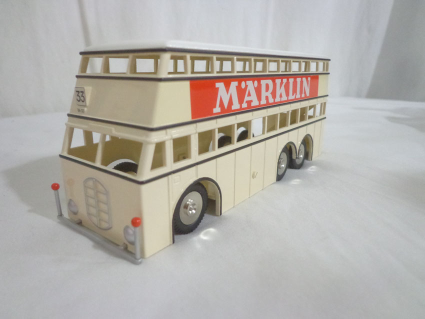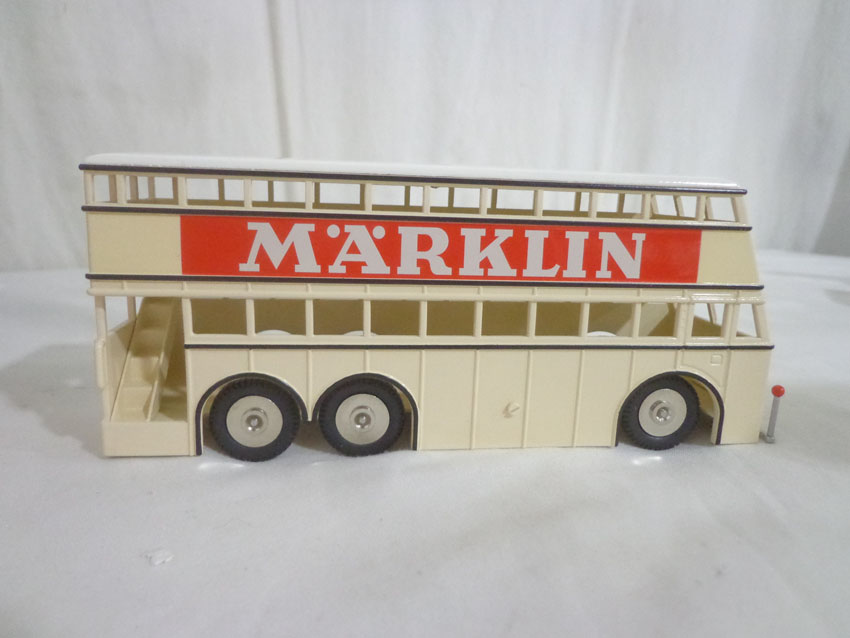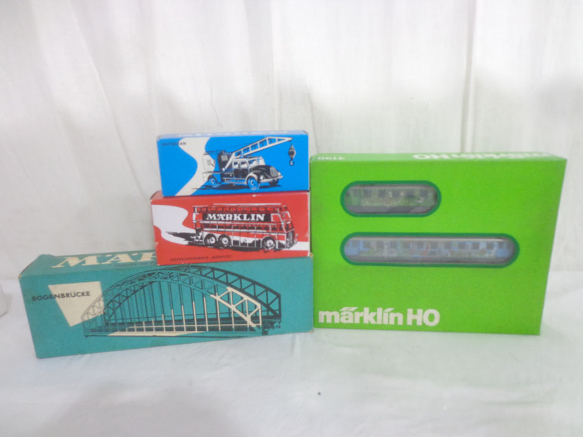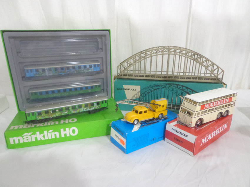 Marklin HO Gauge: #4190 Set of 3 Passenger Cars, #18080 Double Decker Bus, #18031 Magirus Crane Truck and #7163 Bridge/OBs