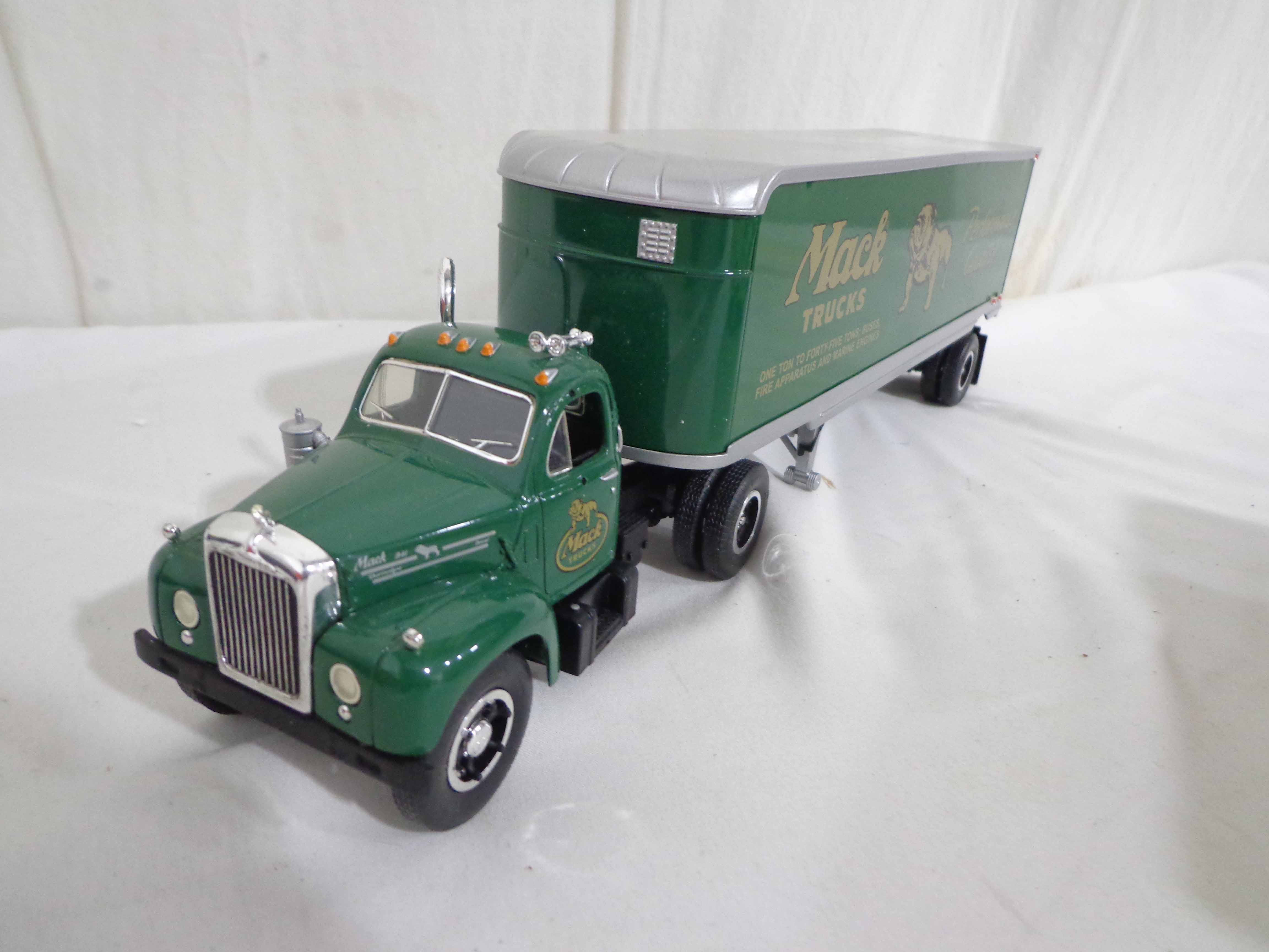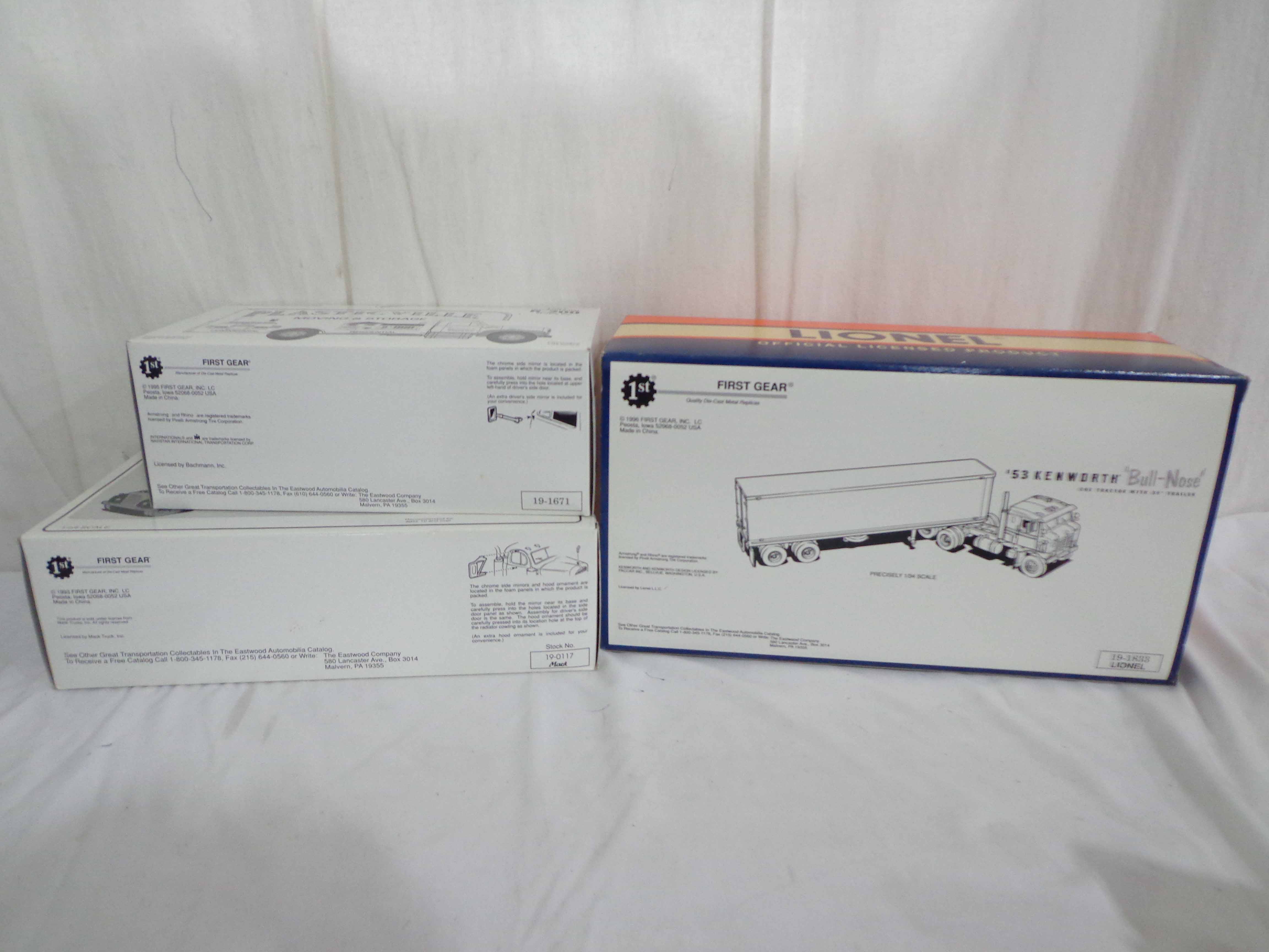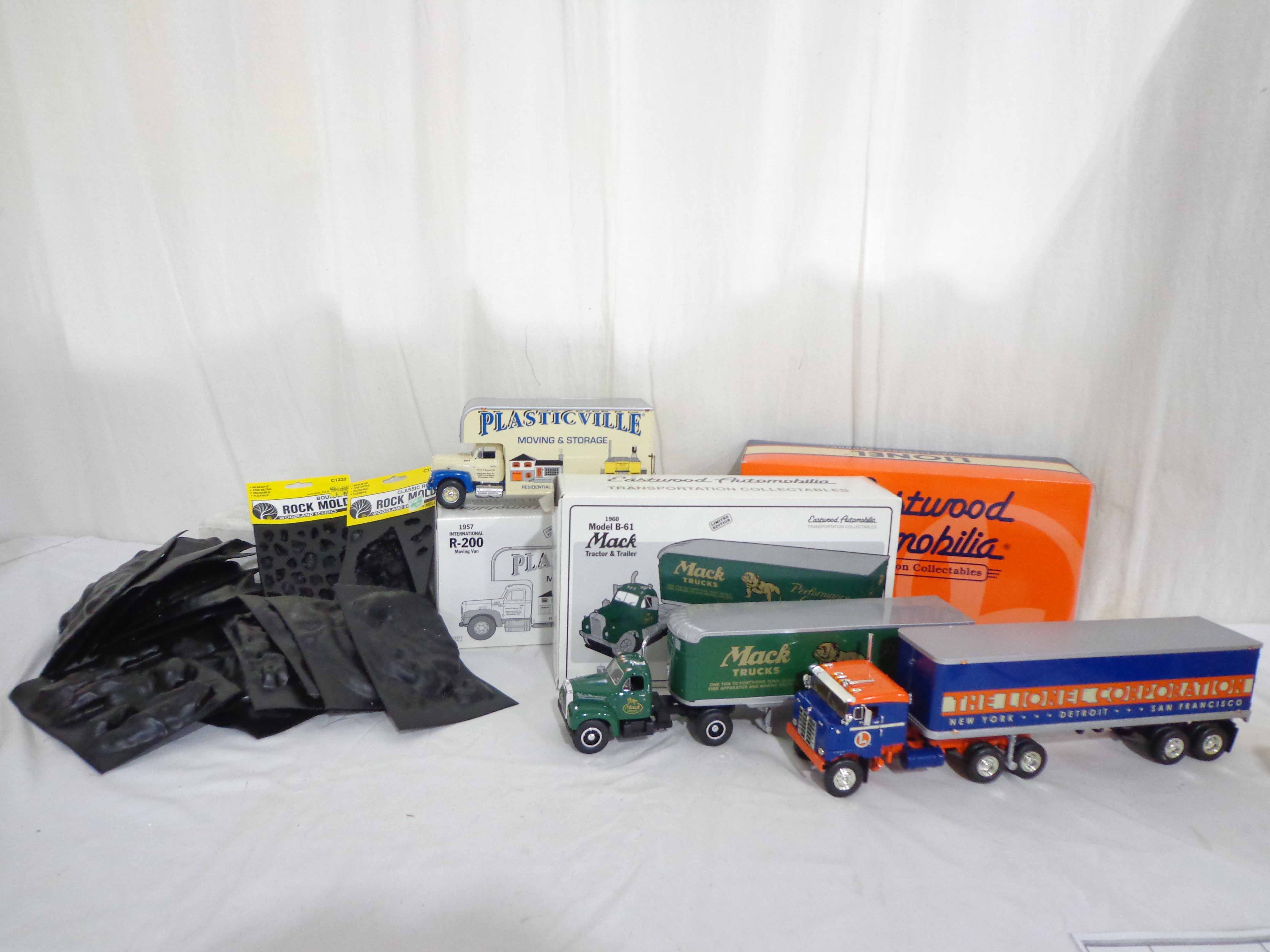 First Gear/Woodland Scenes 1:34 Scale #19-1671 International Moving Van, #19-0117 Mack Tractor Trailer, #19-1833 Bull Nose Lionel Tractor Trailer and 15 Plastic Rock Molds/OBs