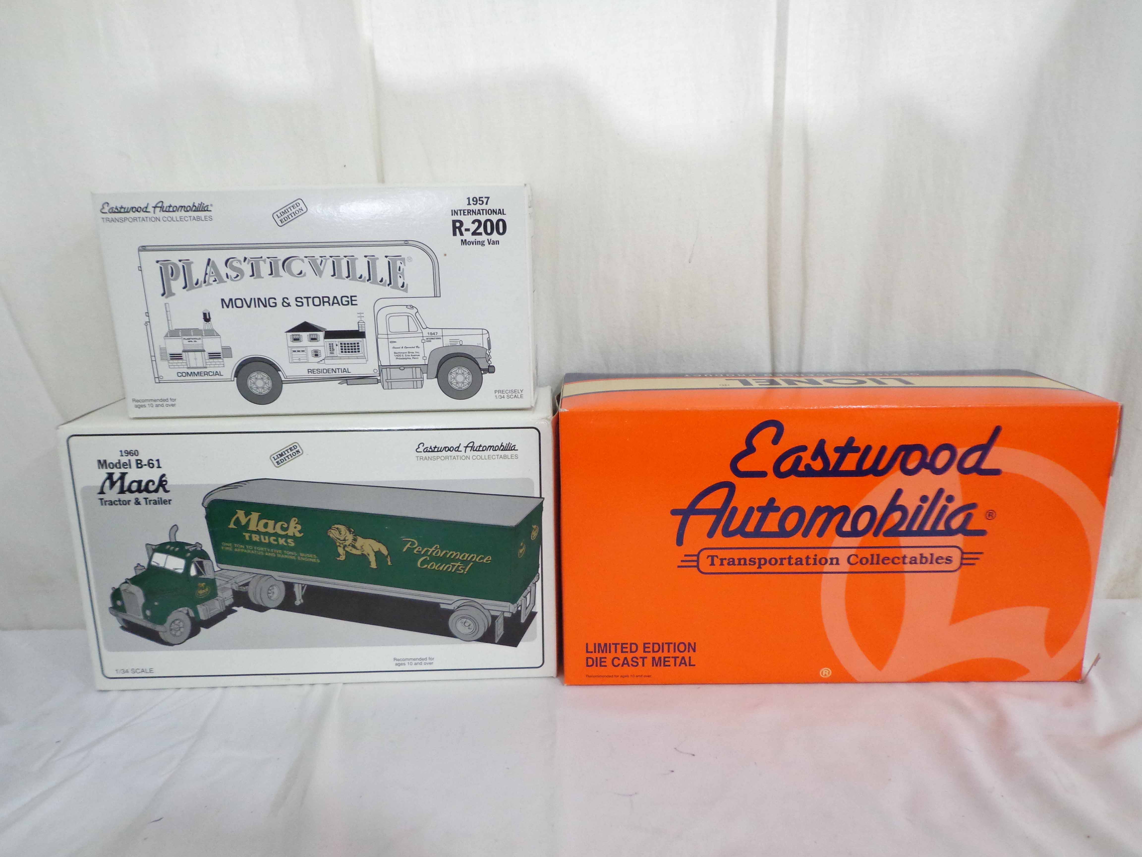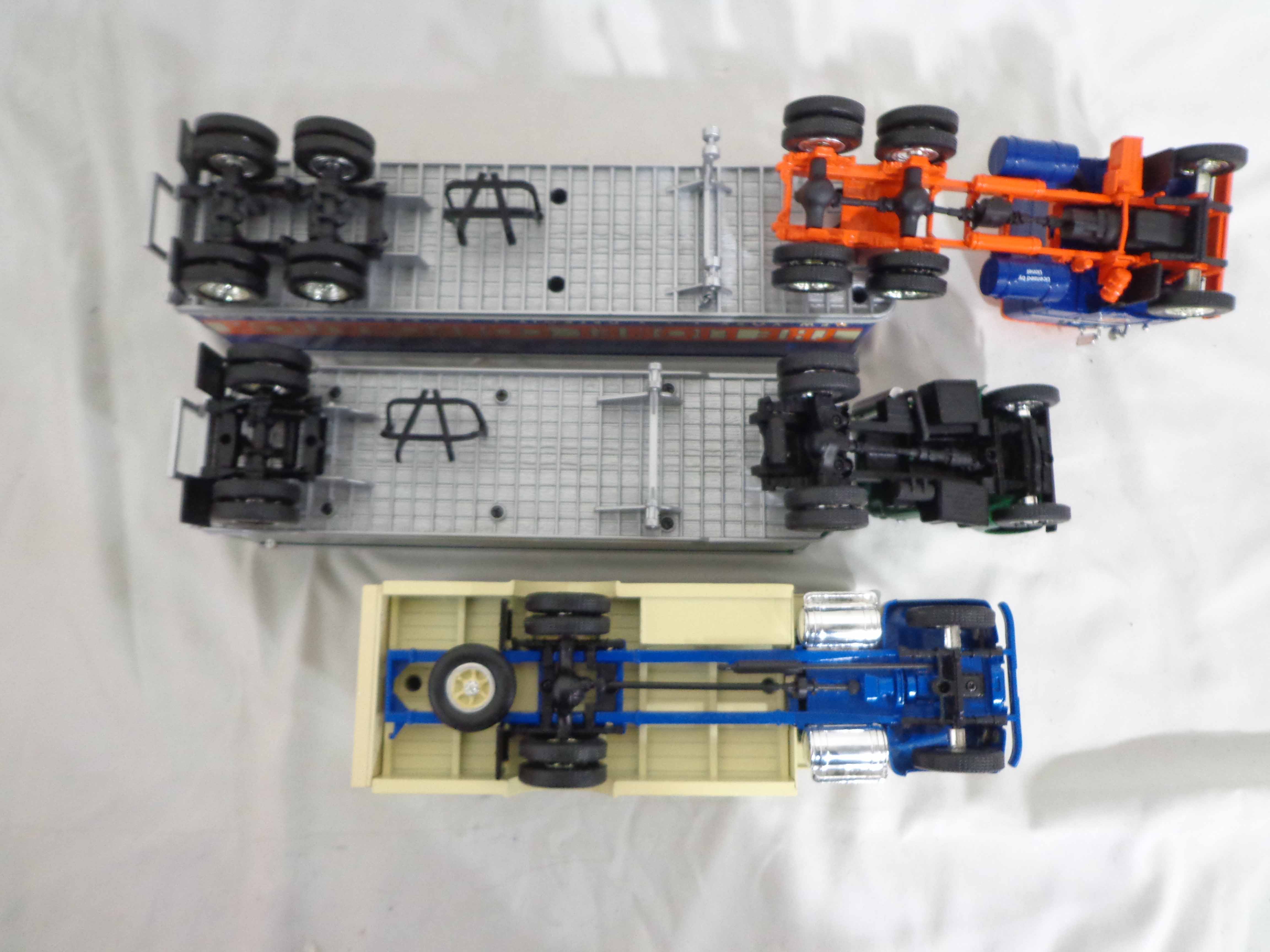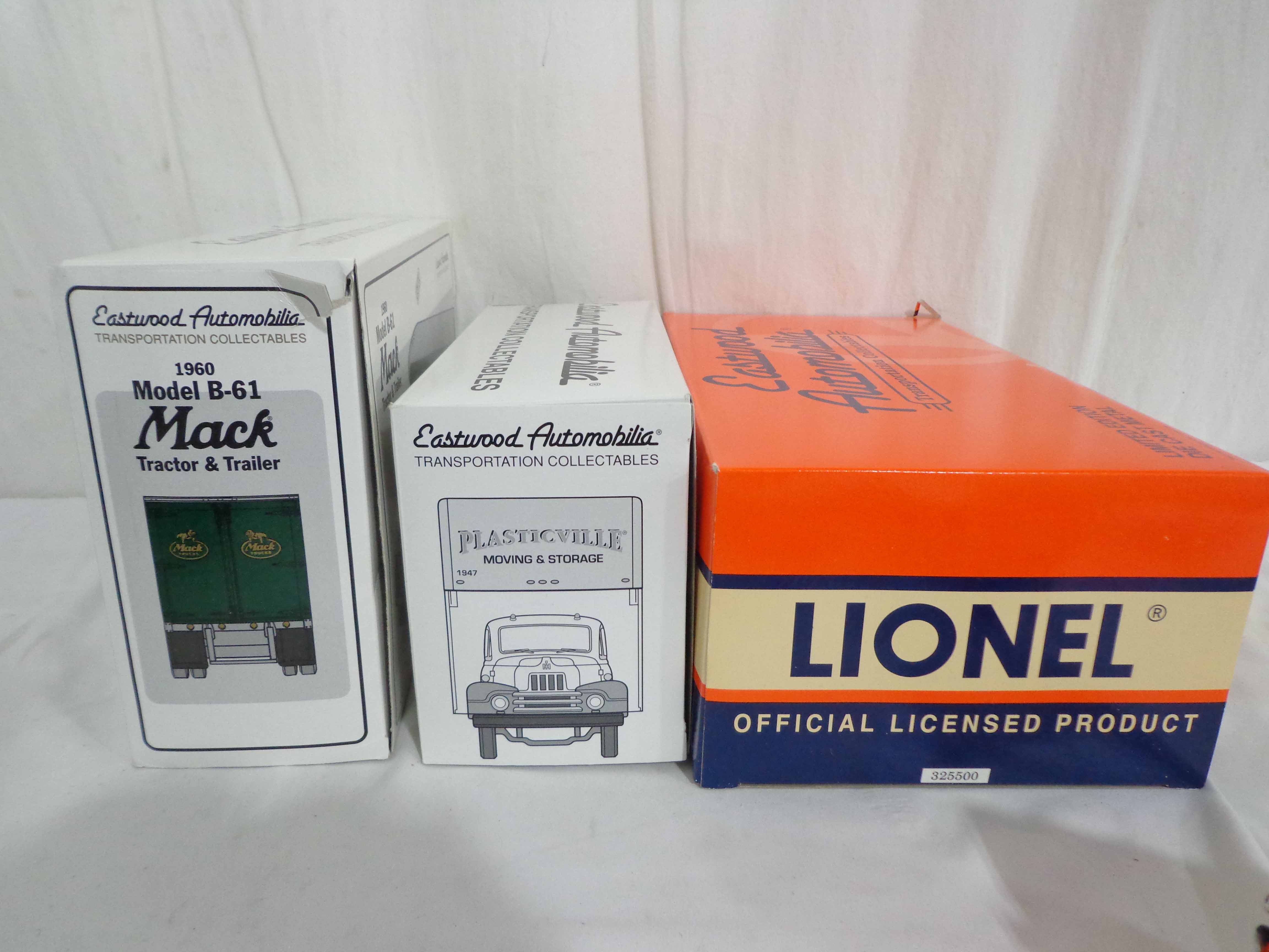 These are the First Gear/Woodland Scenes 1:34 Scale #19-1671 International Moving Van, #19-0117 Mack Tractor Trailer, #19-1833 Bull Nose Lionel Tractor Trailer and fifteen Plastic Rock Molds. Original Boxes. Examine closely; what is pictured is what you will receive. Please add $40.00 for US-48 Shipping and Insurance (more west of the Mississippi).