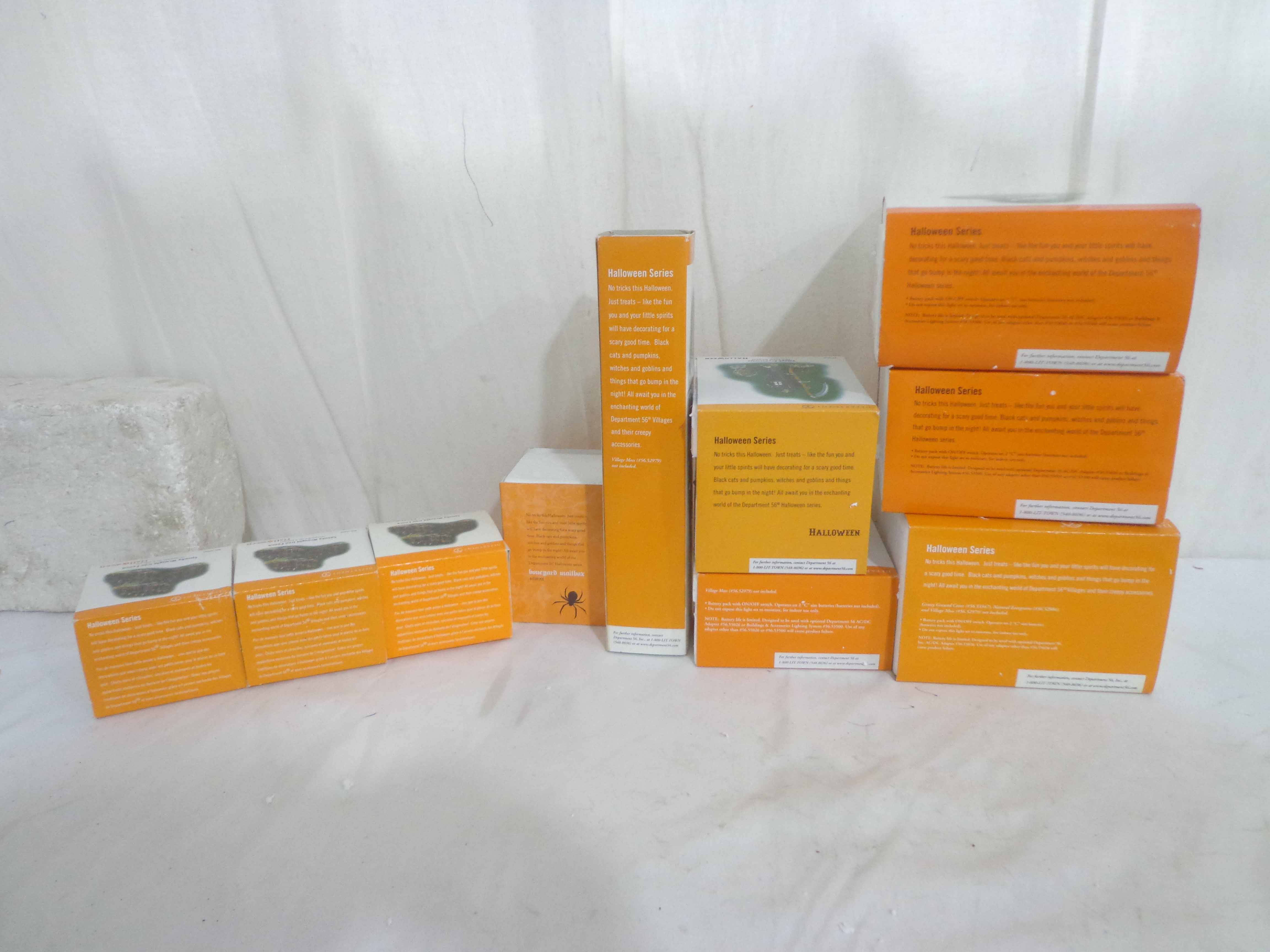 These are ten Assorted Dept 56 Halloween Series Accessories. Original Boxes. Examine closely; what is pictured is what you will receive. Please add $50.00 for US-48 Shipping and Insurance (more west of the Mississippi).