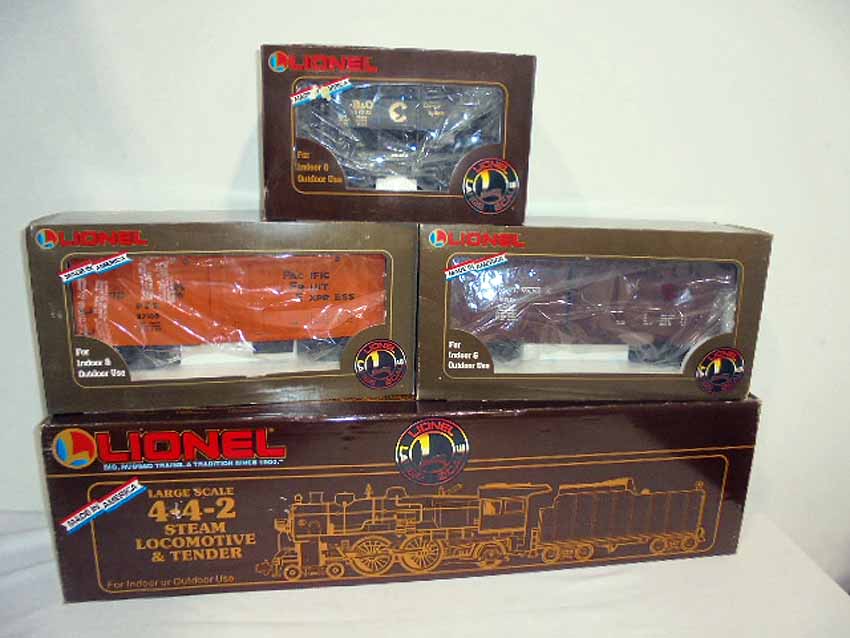 Lionel Large Gauge: #85102 NYC 4-4-2 Steam Locomotive & Tender, #87100 UP Reefer, #87203 B&O Ore Car and #87001 PA Box Car/OBs