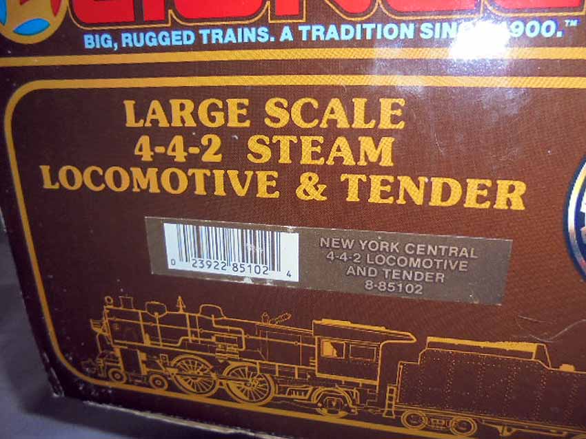 These are the #85102 NYC 4-4-2 Locomotive & Tender, the 87100 UP Reefer, the #87203 B&O Ore Car, and the #87001 PA Box Car that Lionel made for G (Large) Gauge in the 1980s. Original Boxes. All Original in our Opinion. Please add $60.00 for US-48 Shipping and Insurance (more west of the Mississippi).