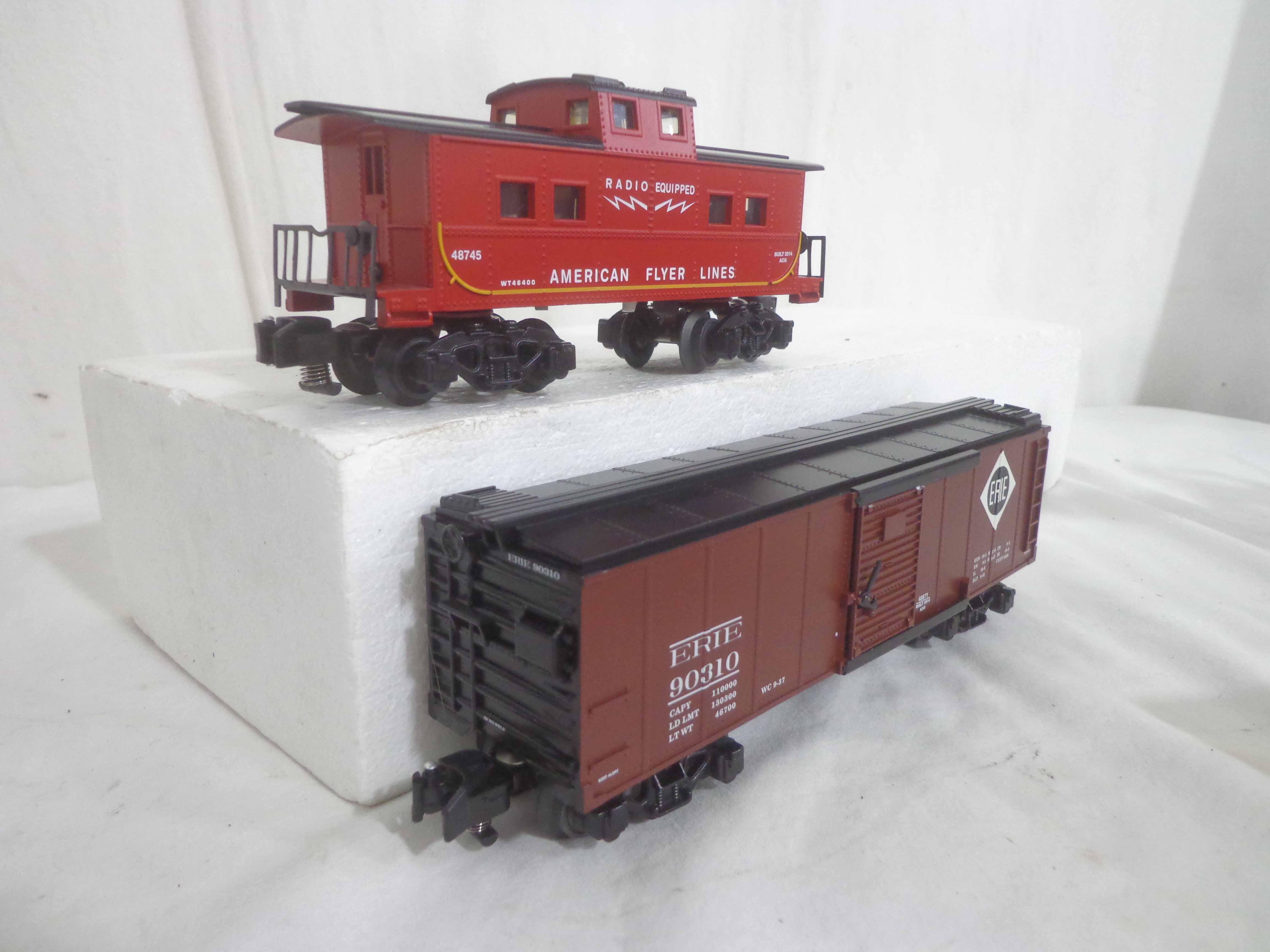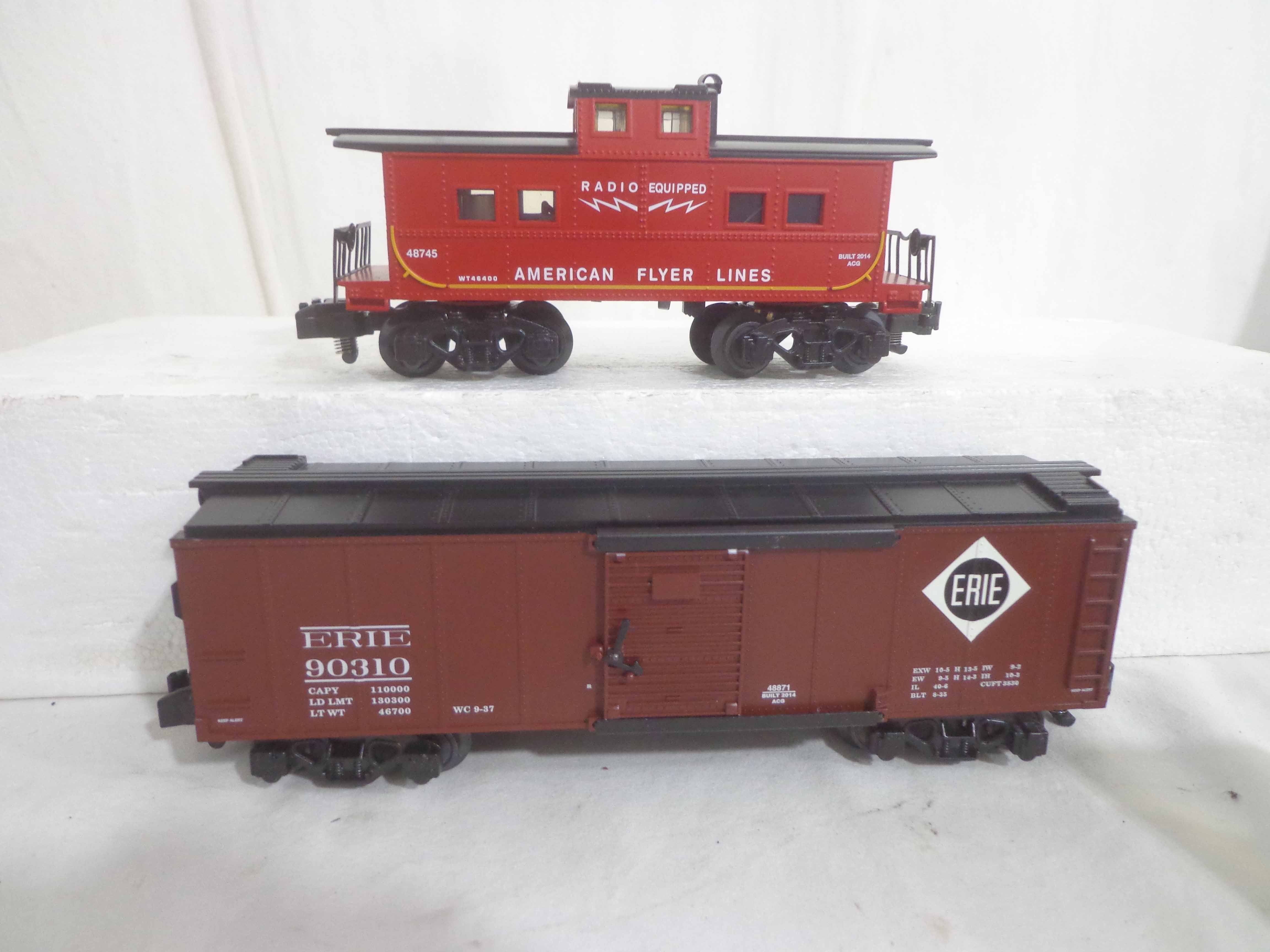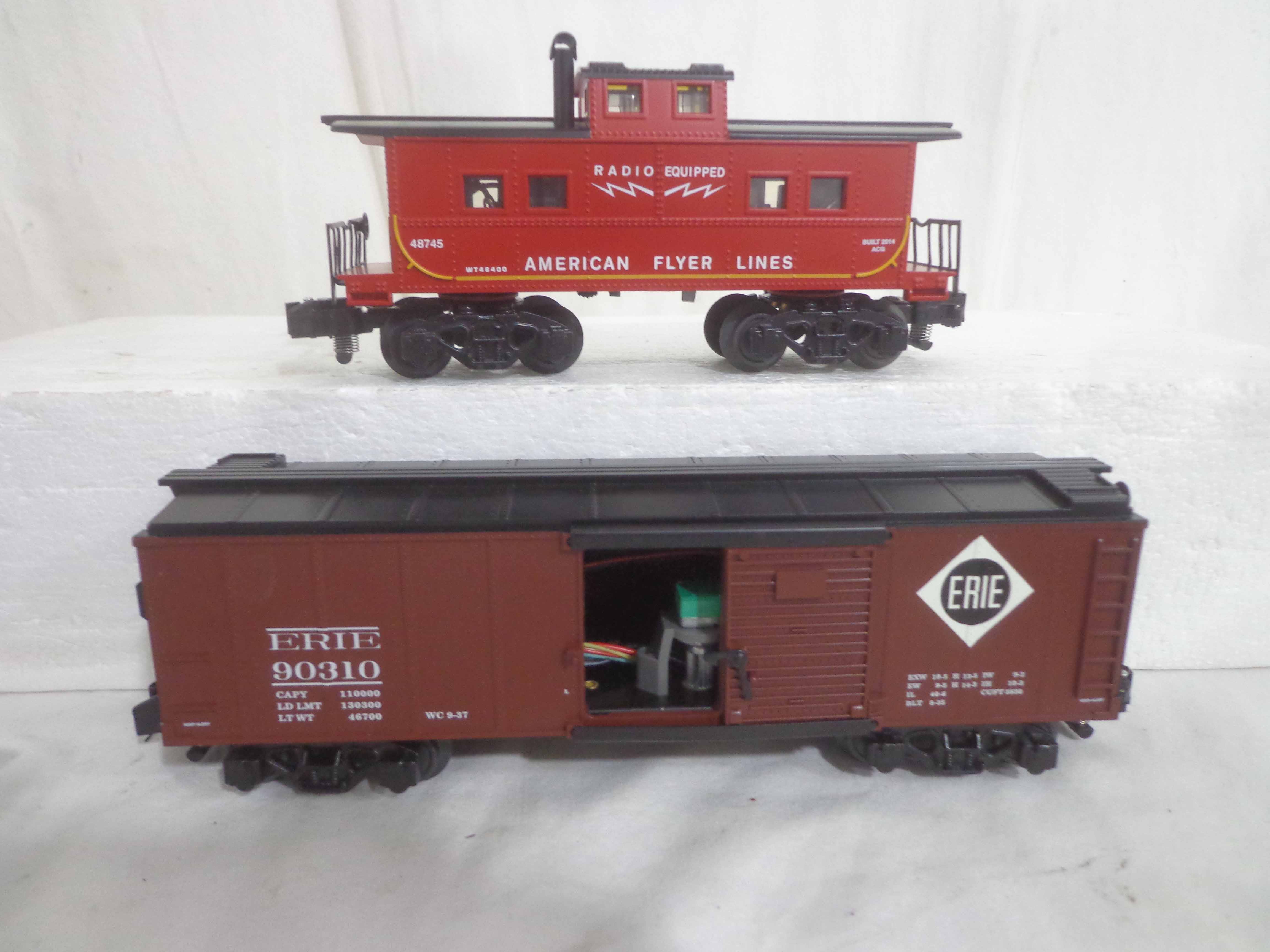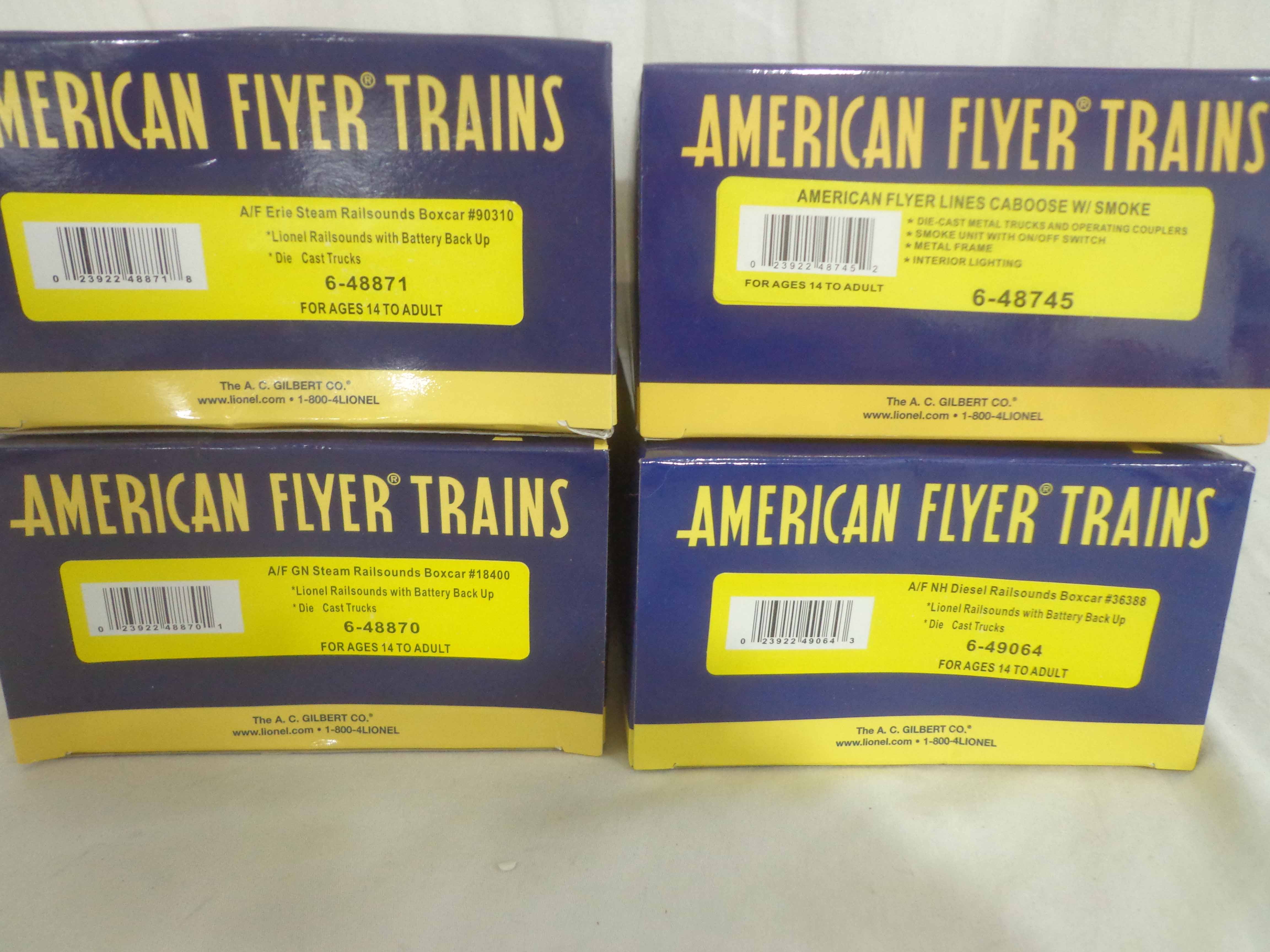 These are the #48870 Great Northern Steam Railsounds Box Car, #48871 Erie Steam Railsounds Box Car, #49064 New Haven Steam Railsounds Box Car and #48745 AF Caboose that Lionel/American Flyer made a few years ago. Original Boxes. All Original in Our Opinion. Examine closely; what is pictured is what you will receive. Please add $30.00 for US-48 Shipping and Insurance (more west of the Mississippi).