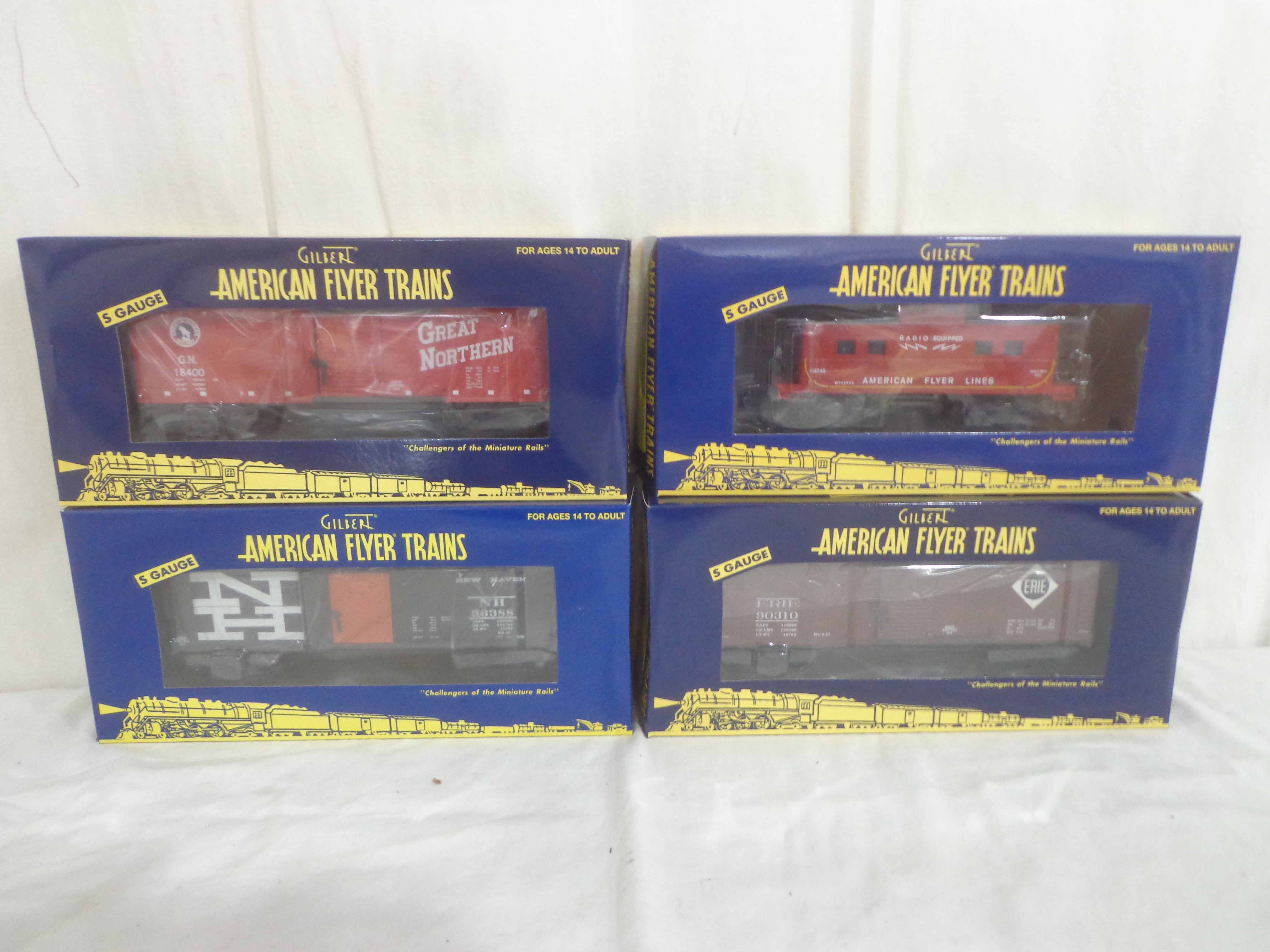 AF/Lionel S Gauge: #48870 Great Northern Steam Railsounds Box Car, #48871 Erie Steam Railsounds Box Car, #49064 New Haven Steam Railsounds Box Car and #48745 AF Caboose/OBs