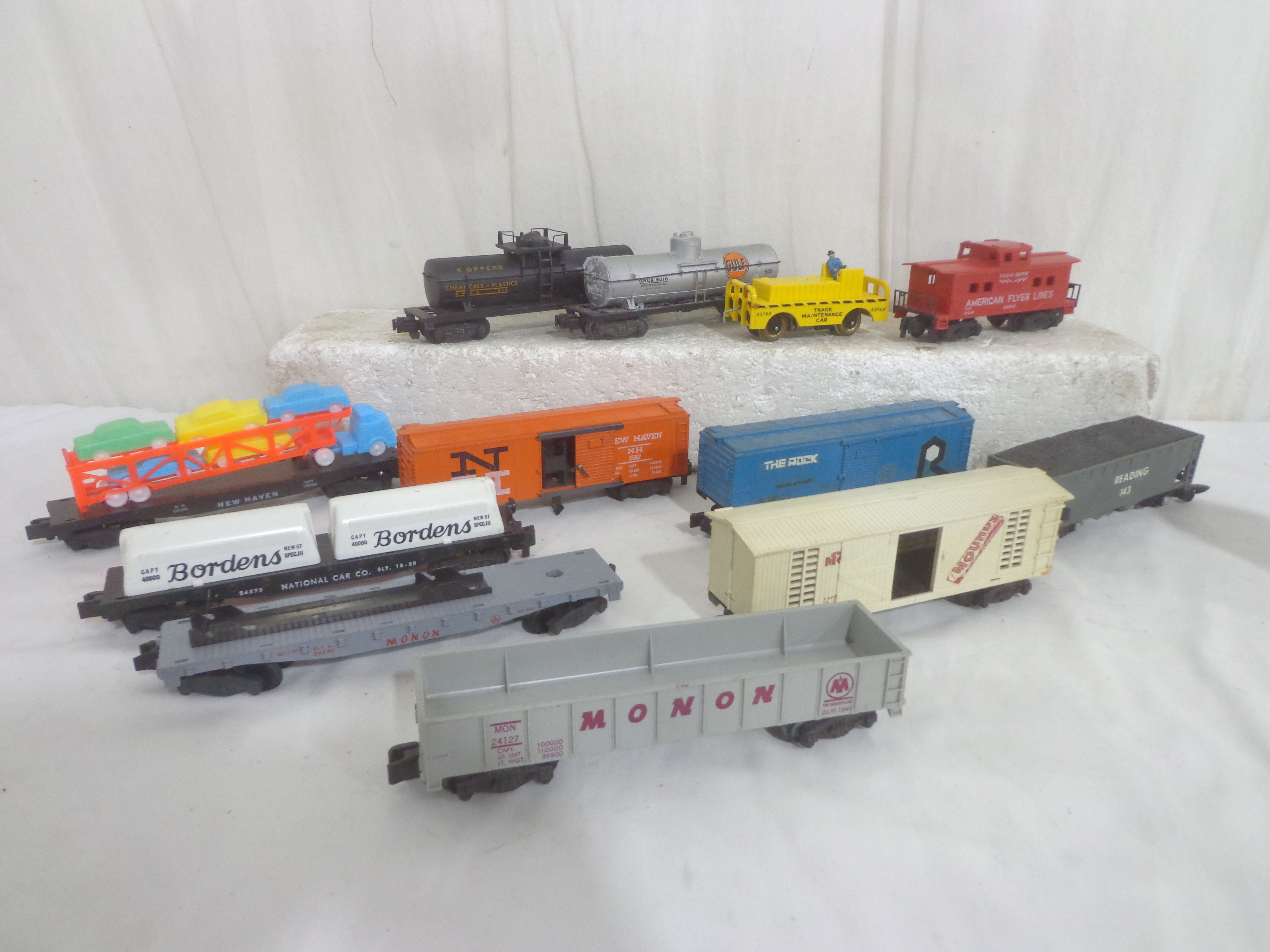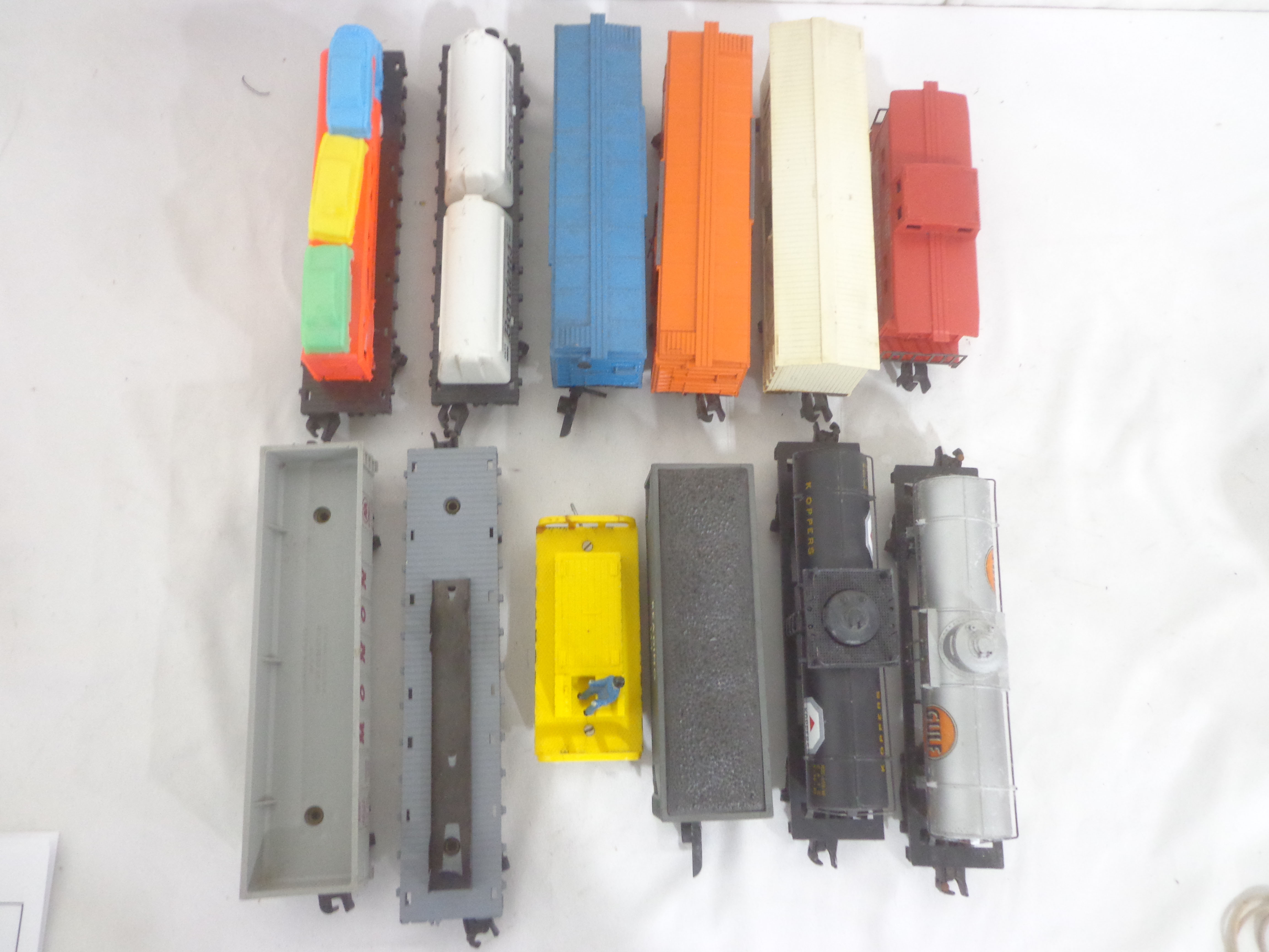 These are twelve Assorted Cars (different couplers) that American Flyer made in the 1950s/60s (one car repainted). No Boxes. Examine very closely; what is pictured is what you will receive. Please add $45.00 for US-48 Shipping and Insurance (more west of the Mississippi). |
