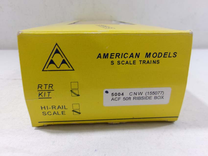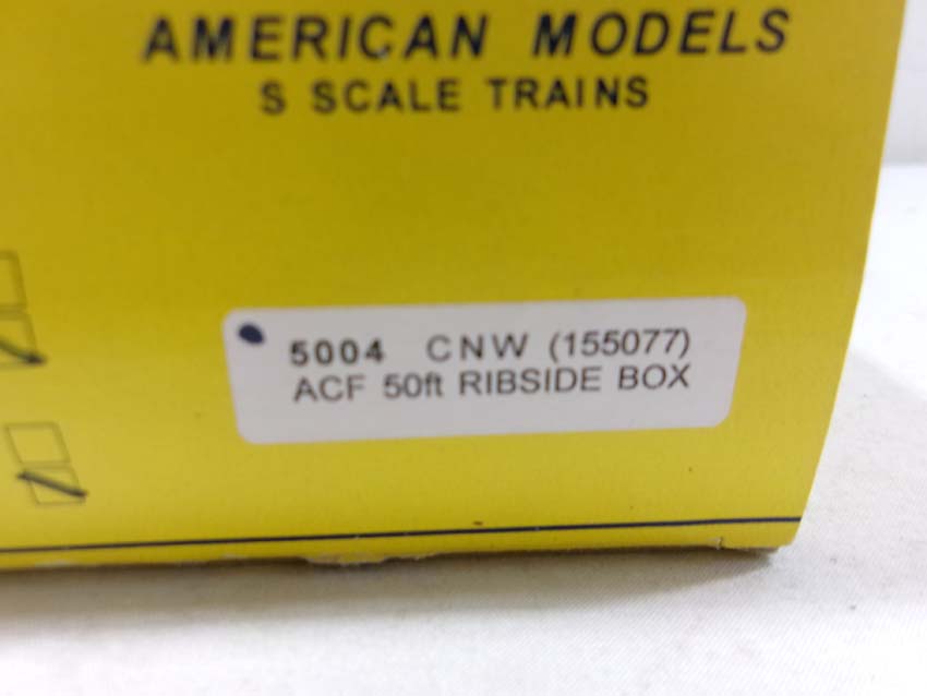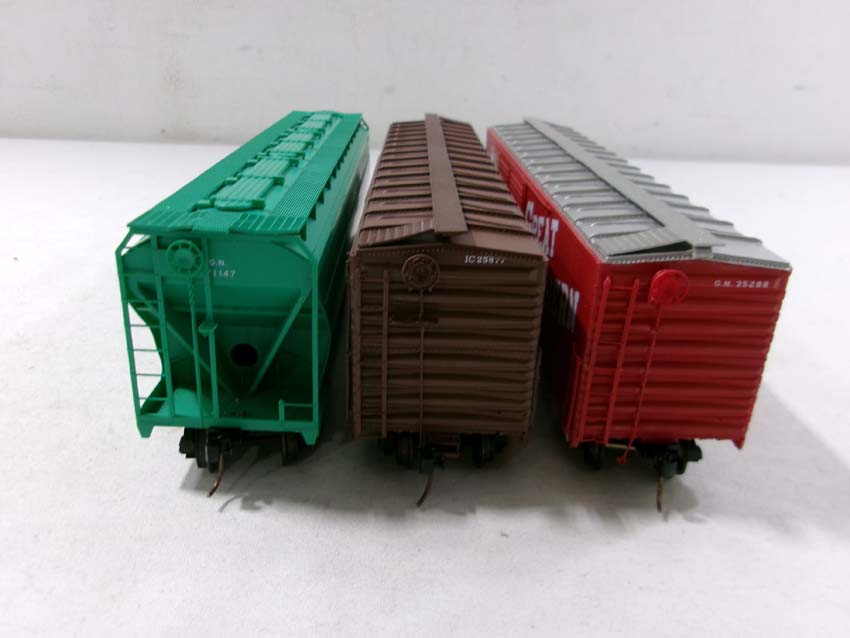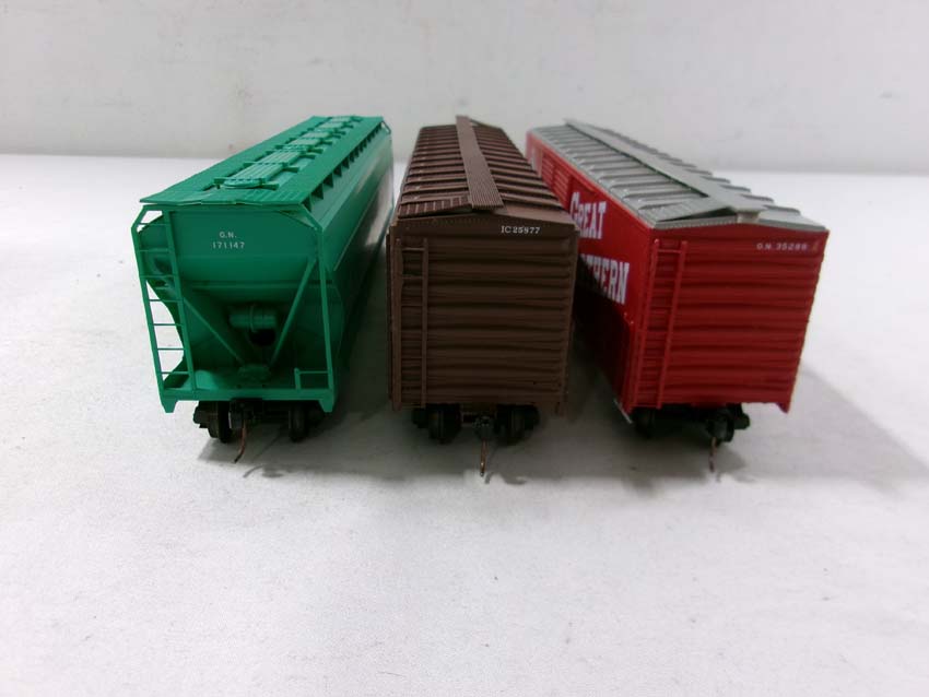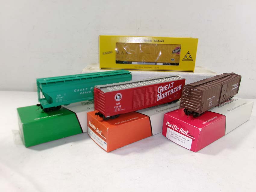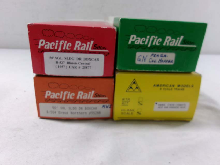 These are the American Models/Pacific Rail Shops S Gauge #5004 CNW ACF Box Car, #B-527 IC 50' Box Car, #B-554 GN 50' Box Car and #? GN Covered Hopper. Original Boxes. Examine closely; what is pictured is what you will receive. Please add $35.00 for US-48 Shipping and Insurance (more west of the Mississippi).