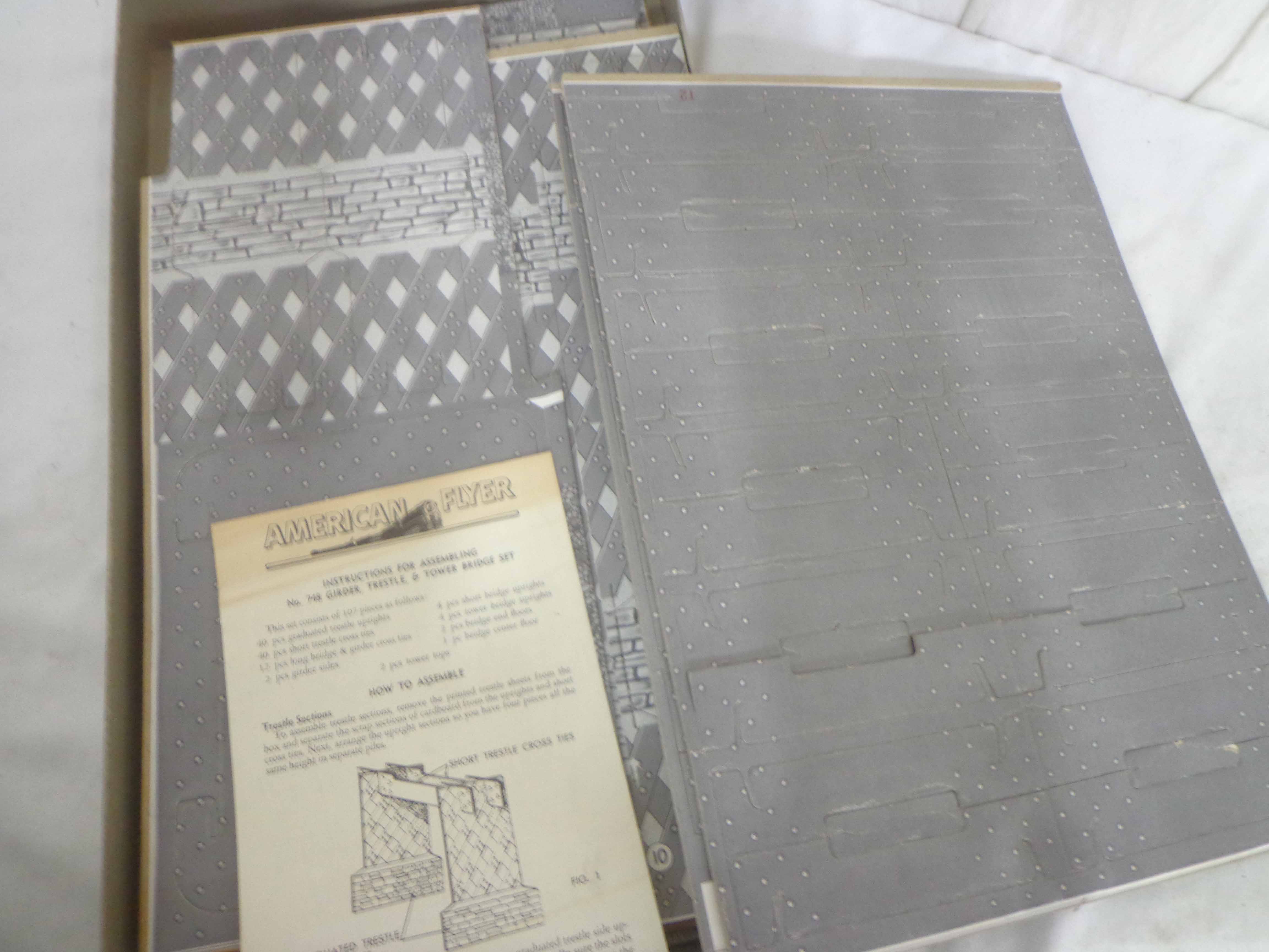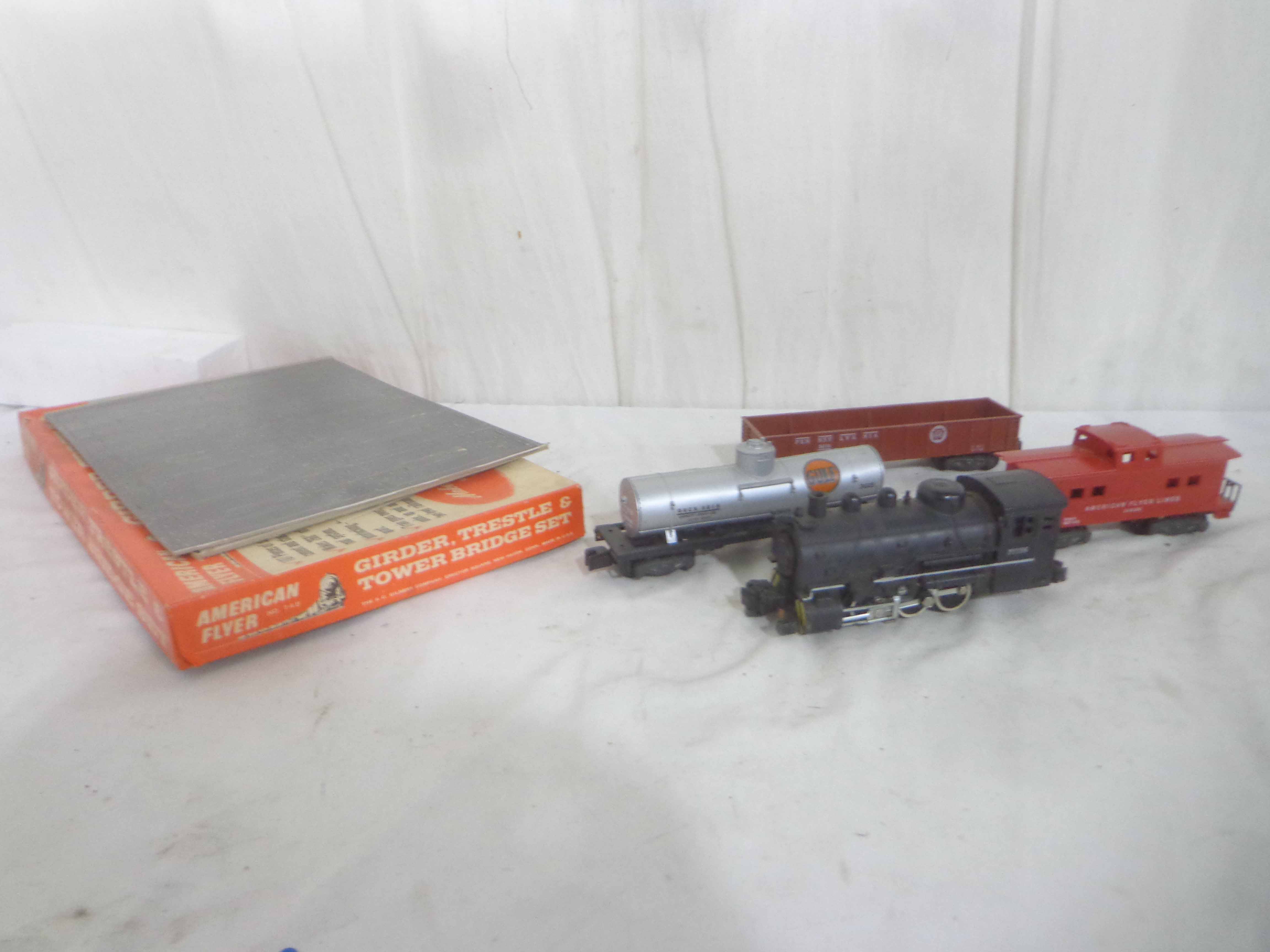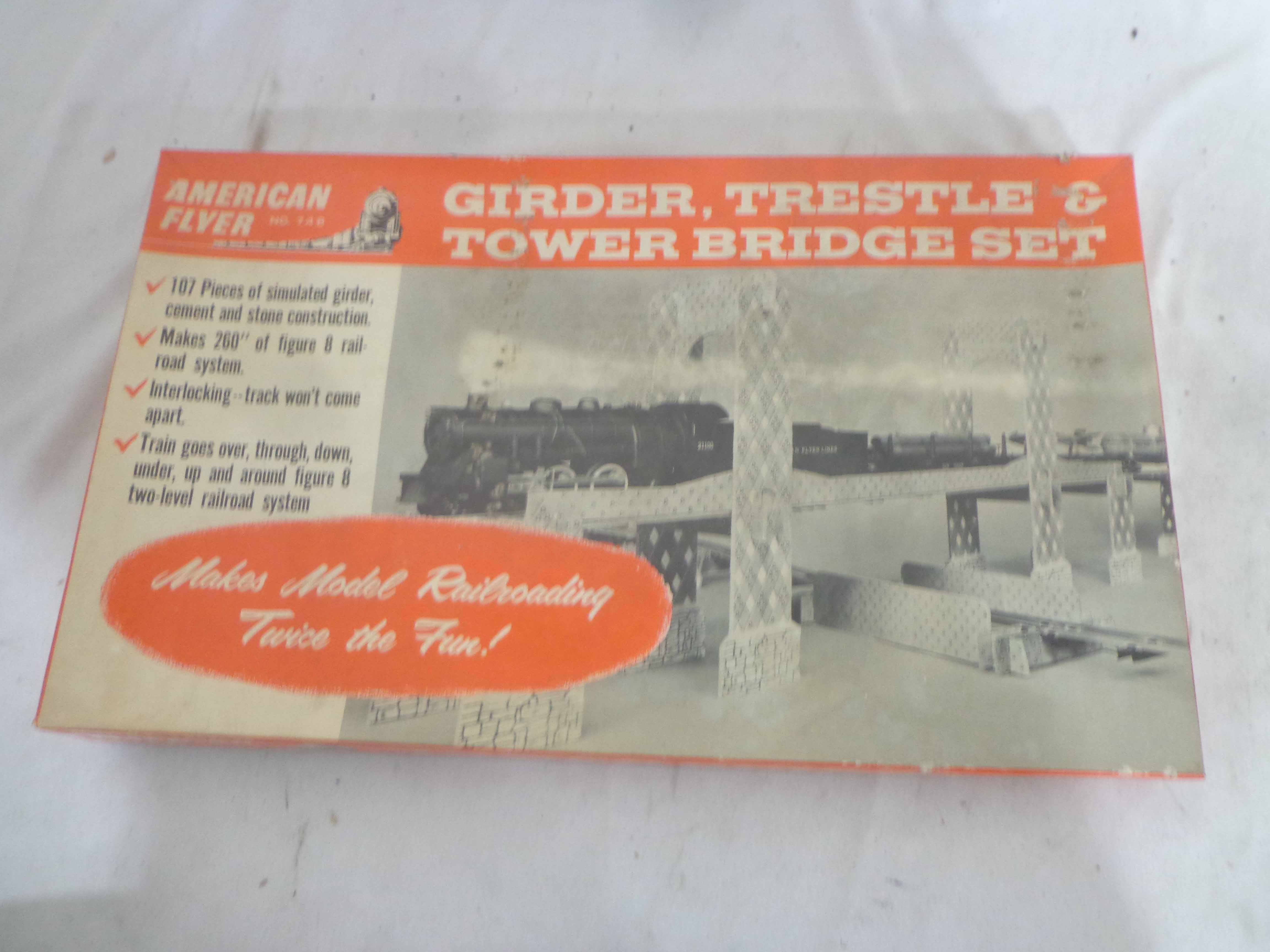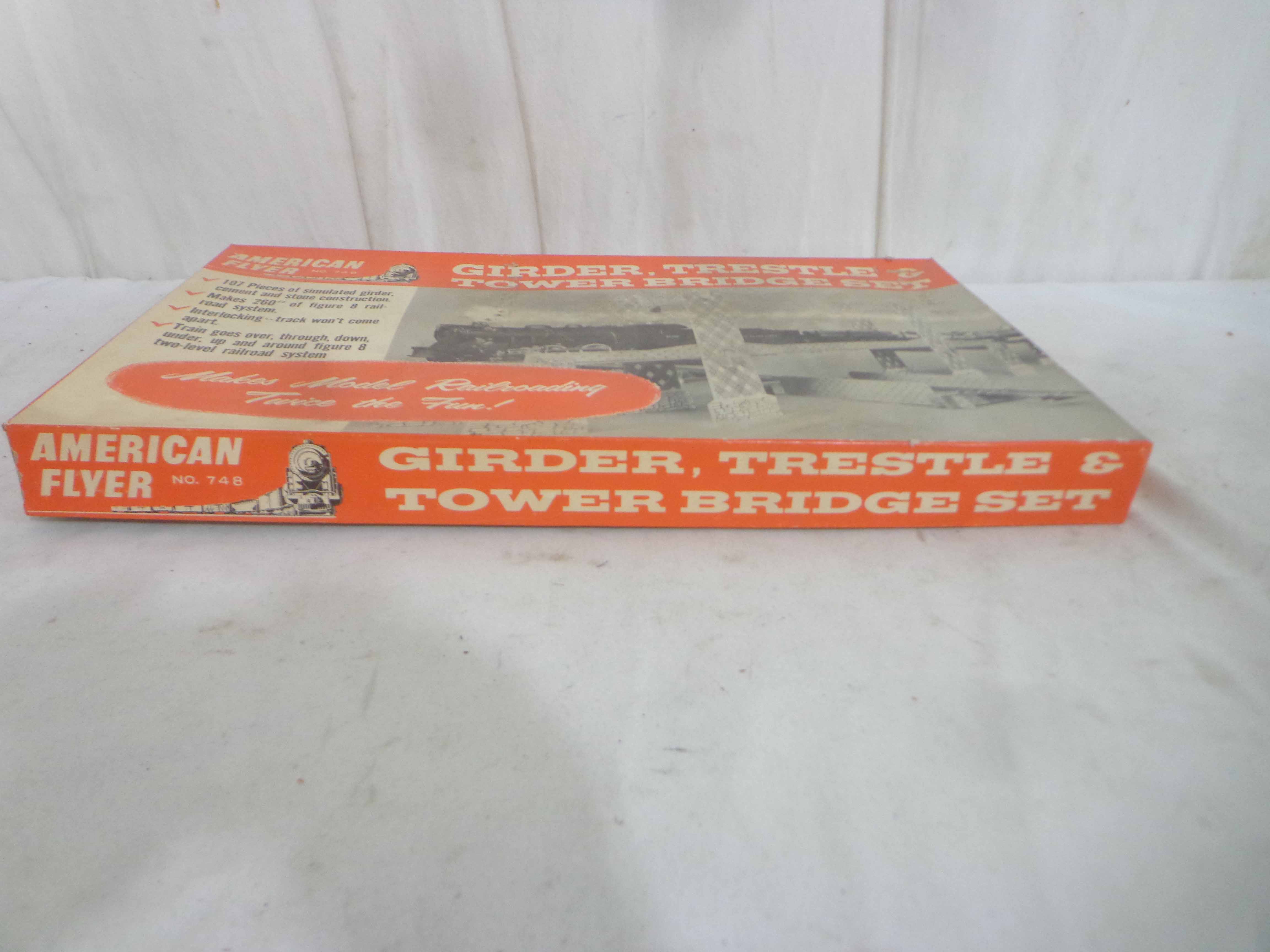 These are the AF S Gauge #21156 Engine, three Cars, and #748 Girder Trestle & Tower Bridge Set Kit. Original Box. Examine very closely; what is pictured is what you will receive. Please add $45.00 for US-48 Shipping and Insurance (more west of the Mississippi).