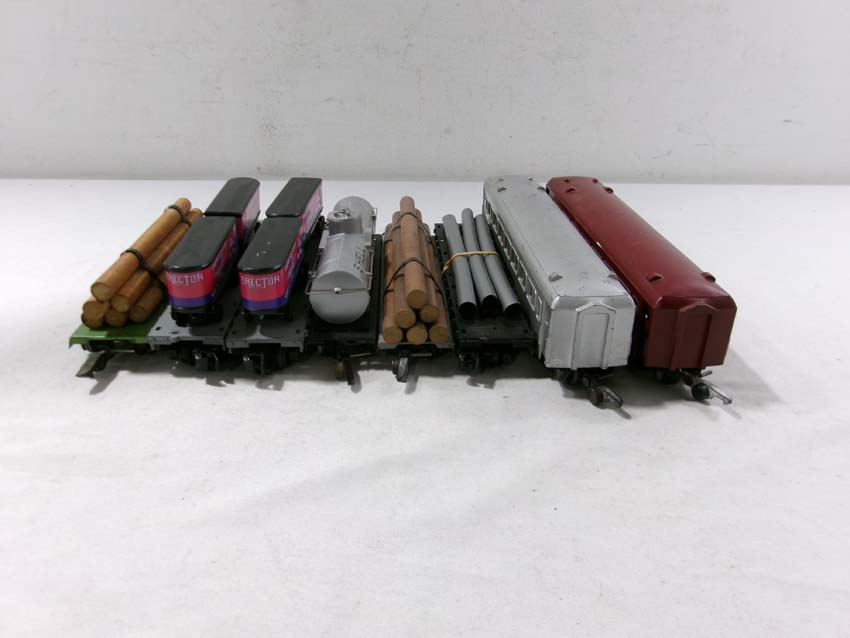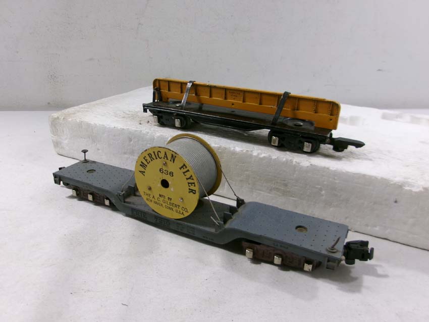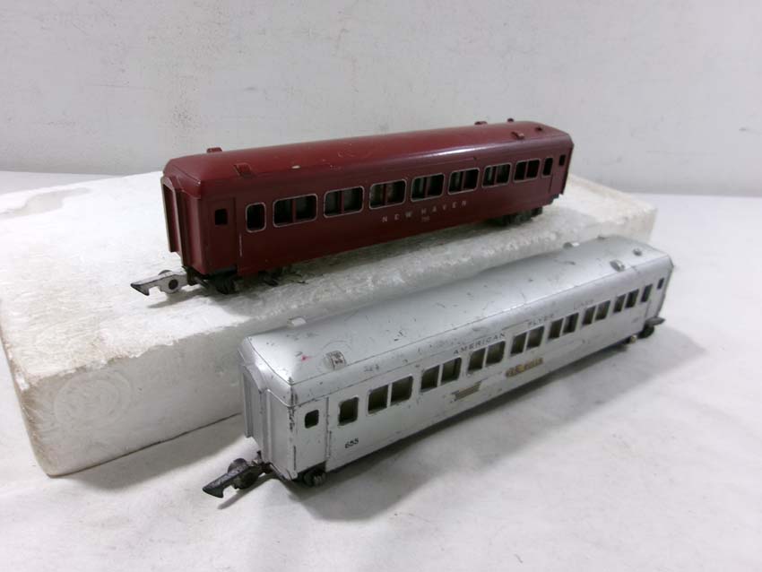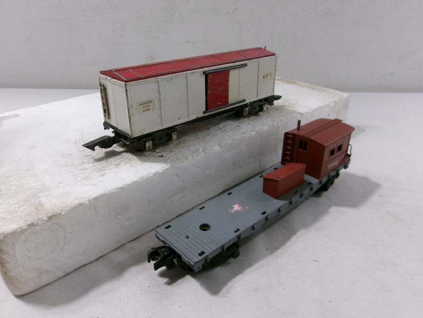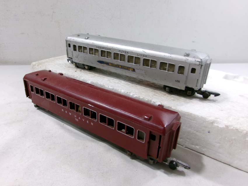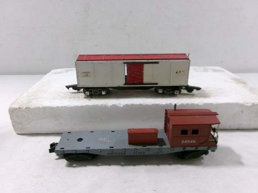 These are the American Flyer S Gauge #735 NH Operating Coach, #655 Silver Bullet Coach, fourteen Assorted Freight Cars (24550s), and two Uncouplers. Two Original Boxes. Examine very closely; what is pictured is what you will receive. Please add $50.00 for US-48 Shipping and Insurance (more west of the Mississippi).
