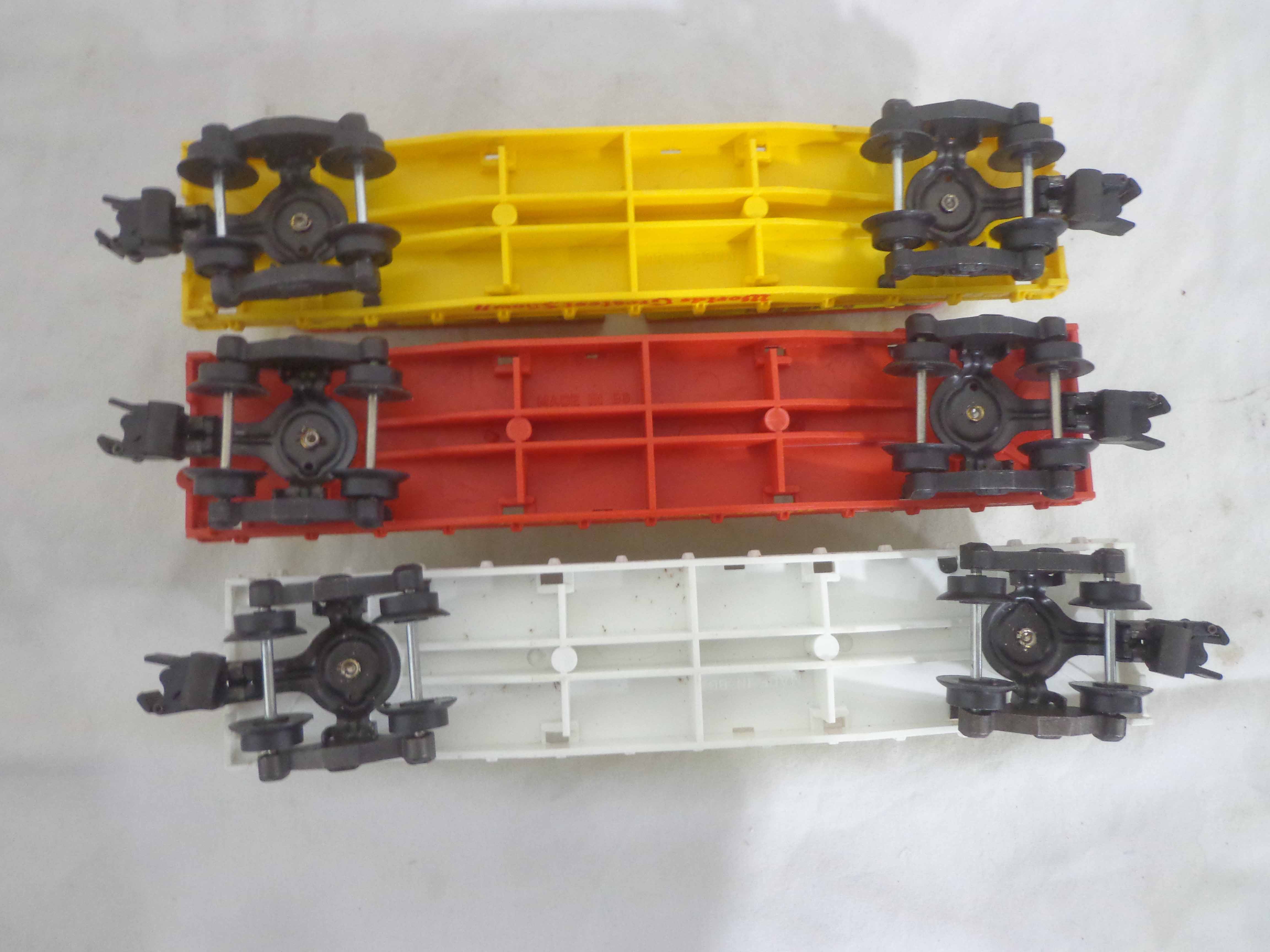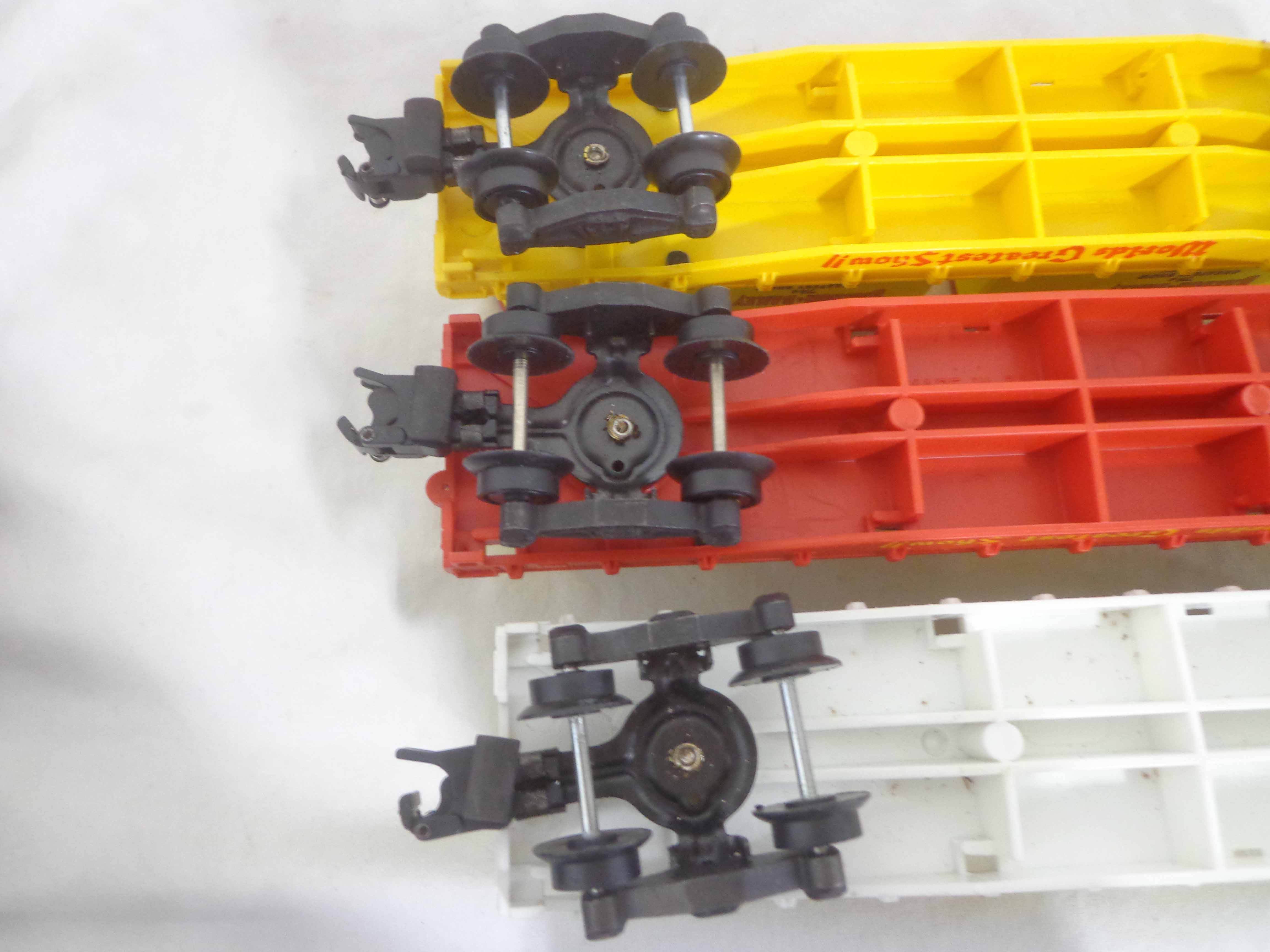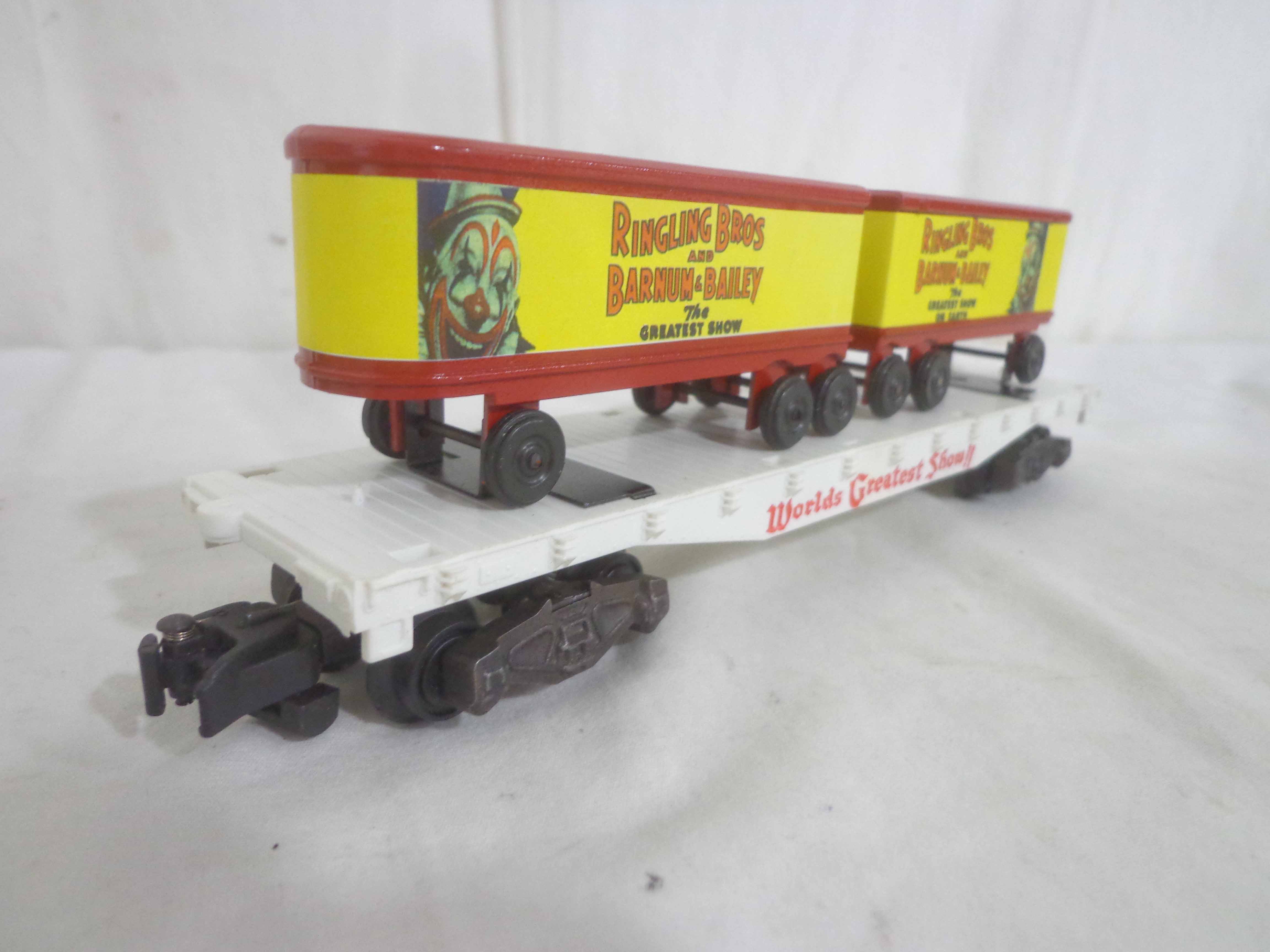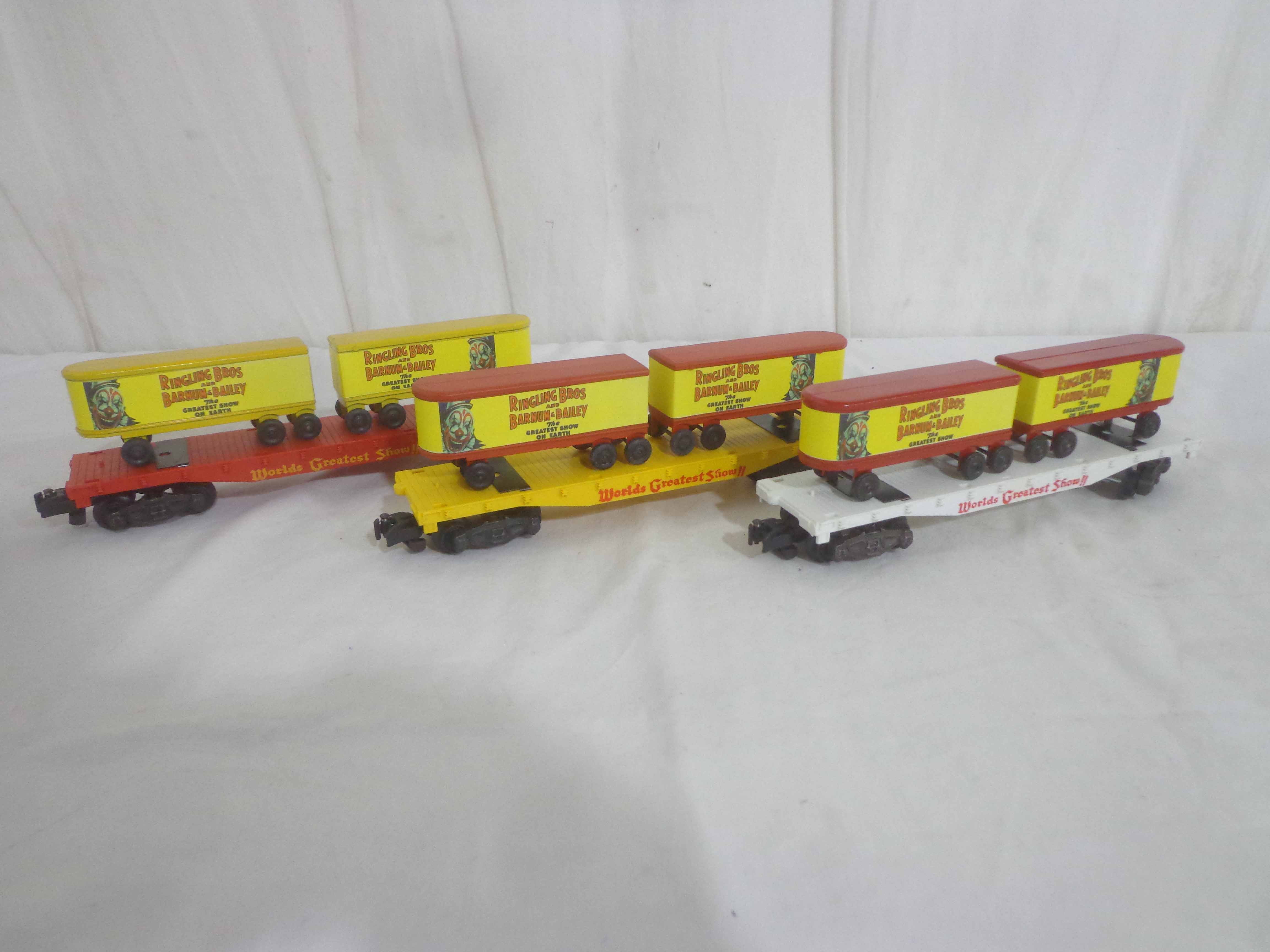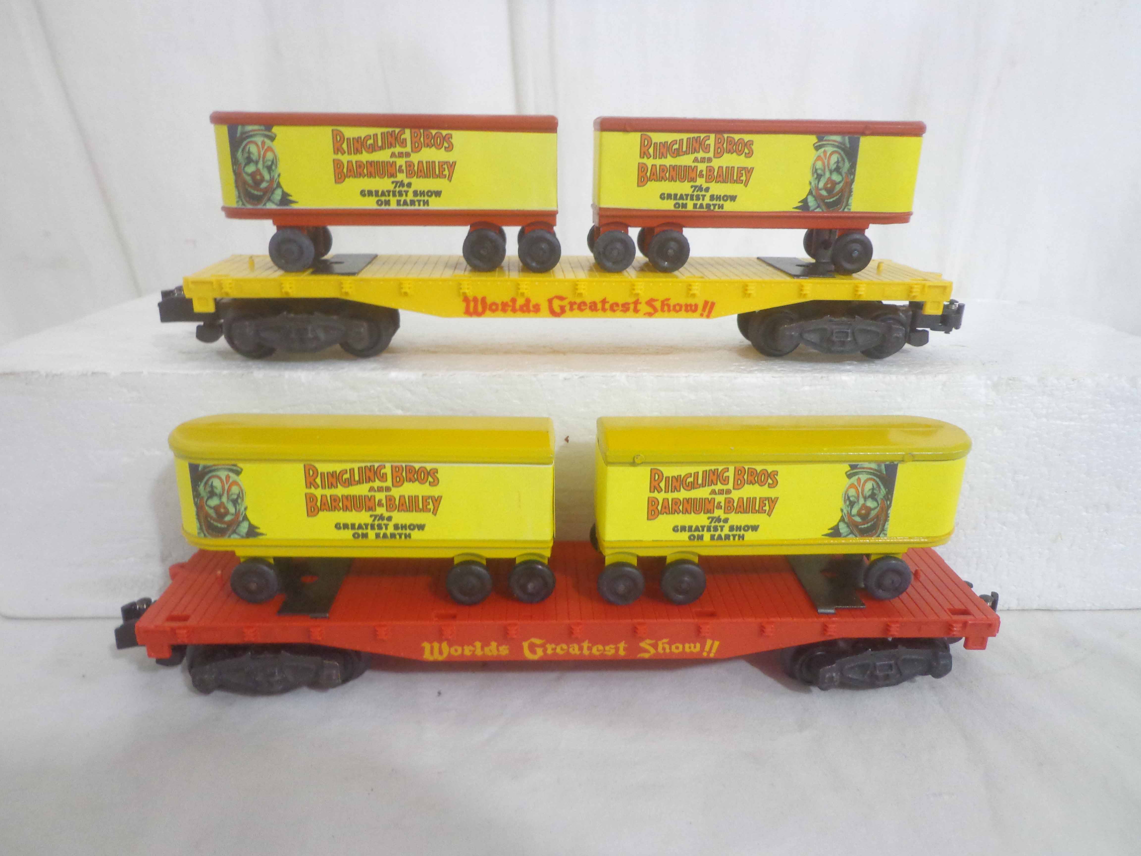 These are three AF S Gauge Ringling Bros and Barnum & Bailey Flat Cars with Trailers (reproductions). No Boxes. Examine closely; what is pictured is what you will receive. Please add $35.00 for US-48 Shipping and Insurance (more west of the Mississippi).